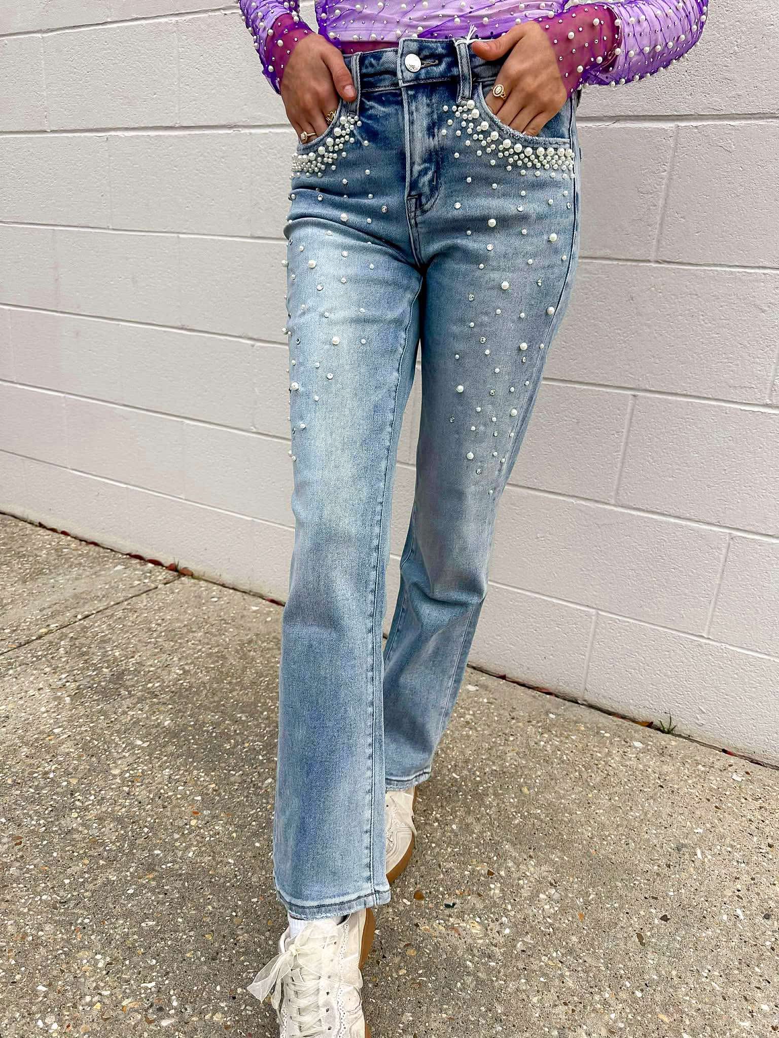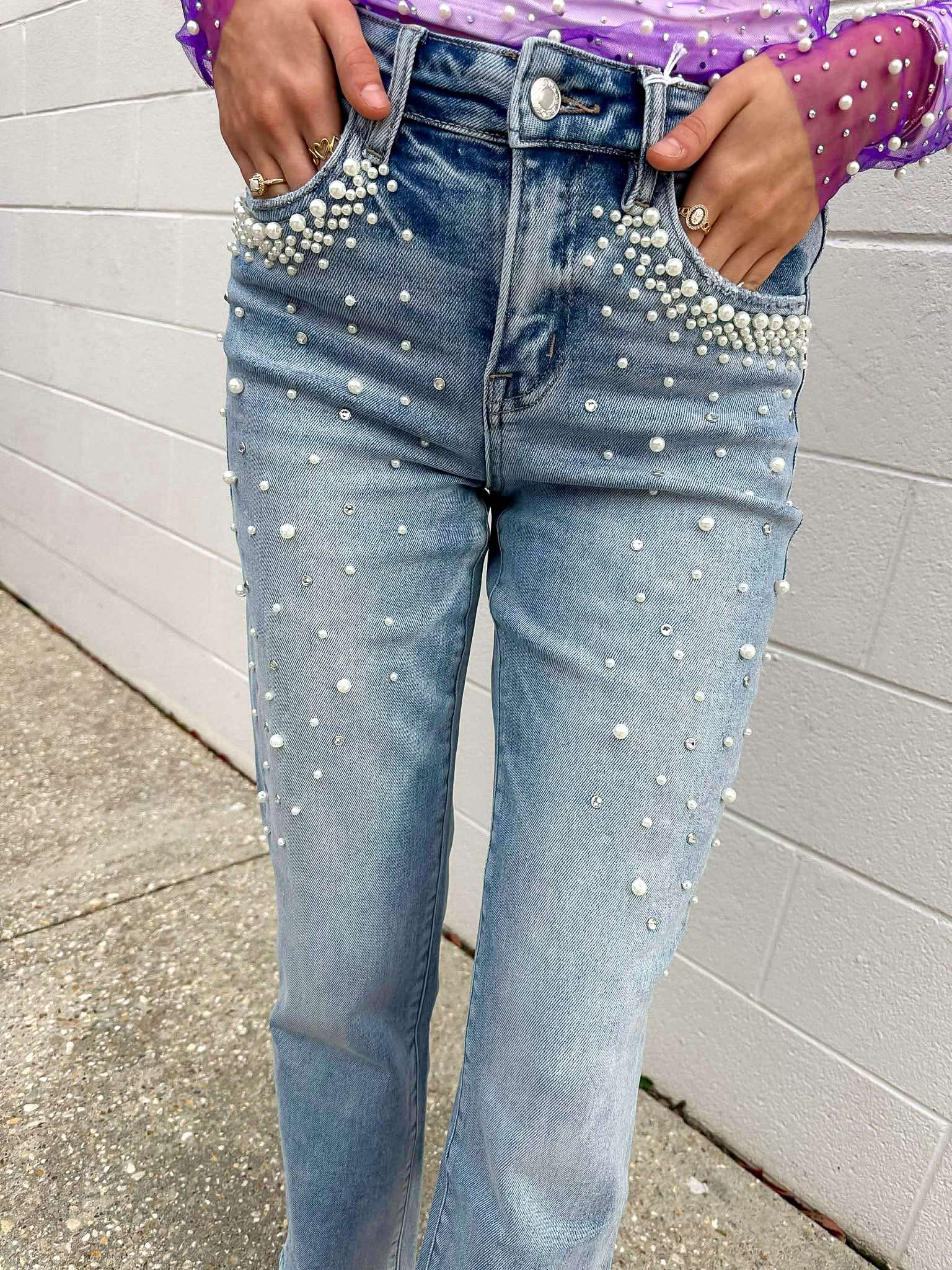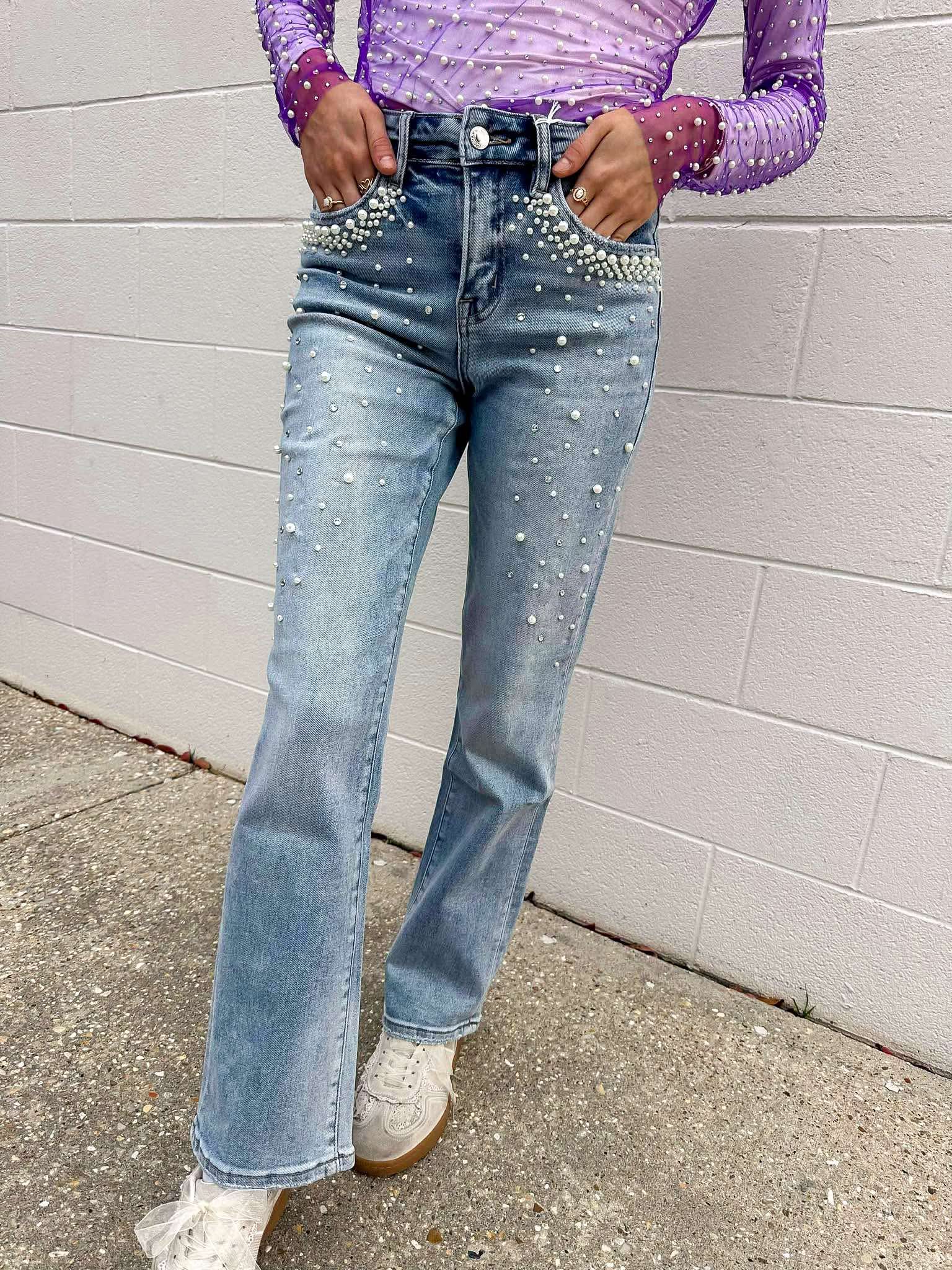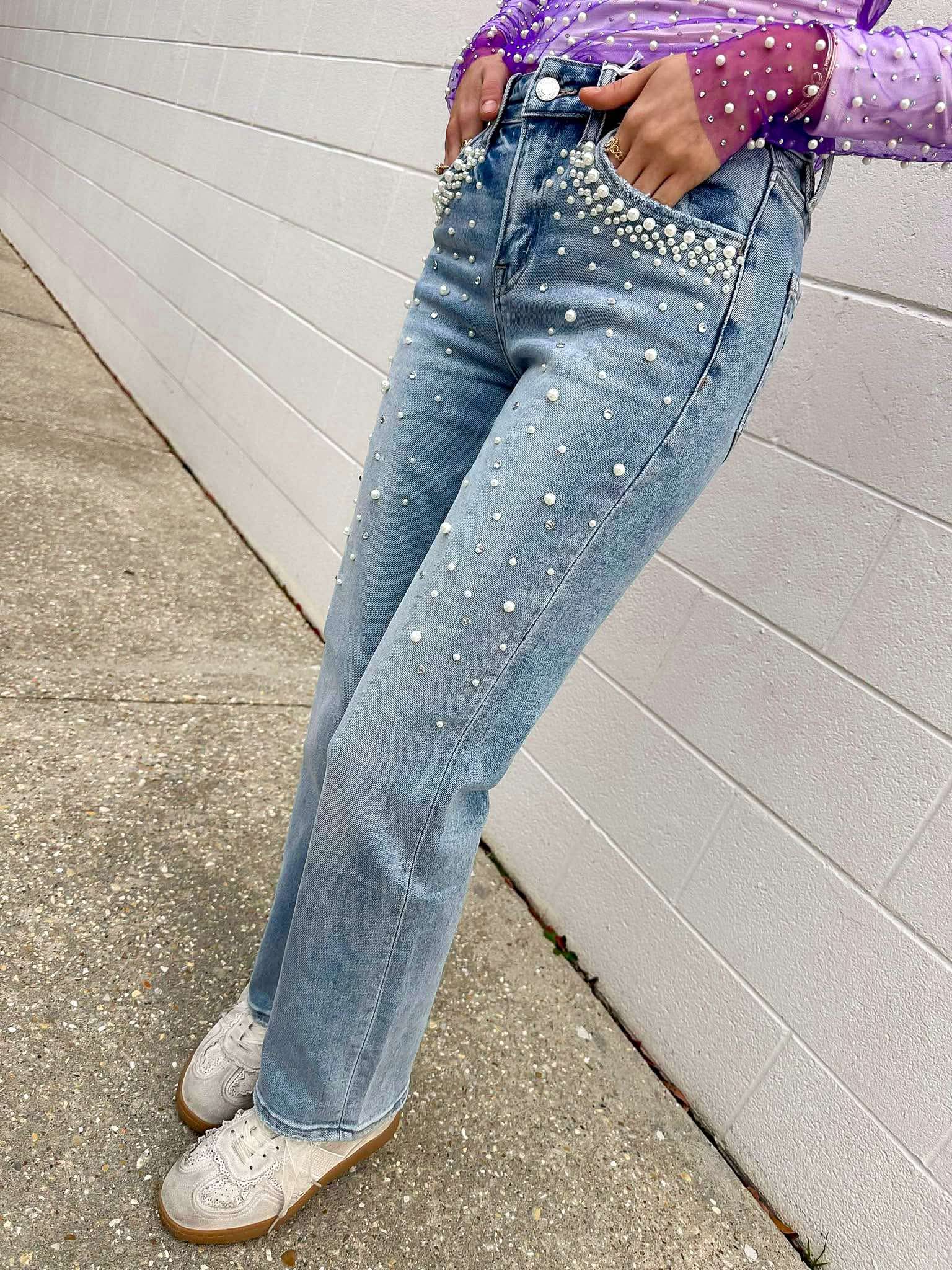 Beautiful Daze Pearl Rhinestone Wide Jeans