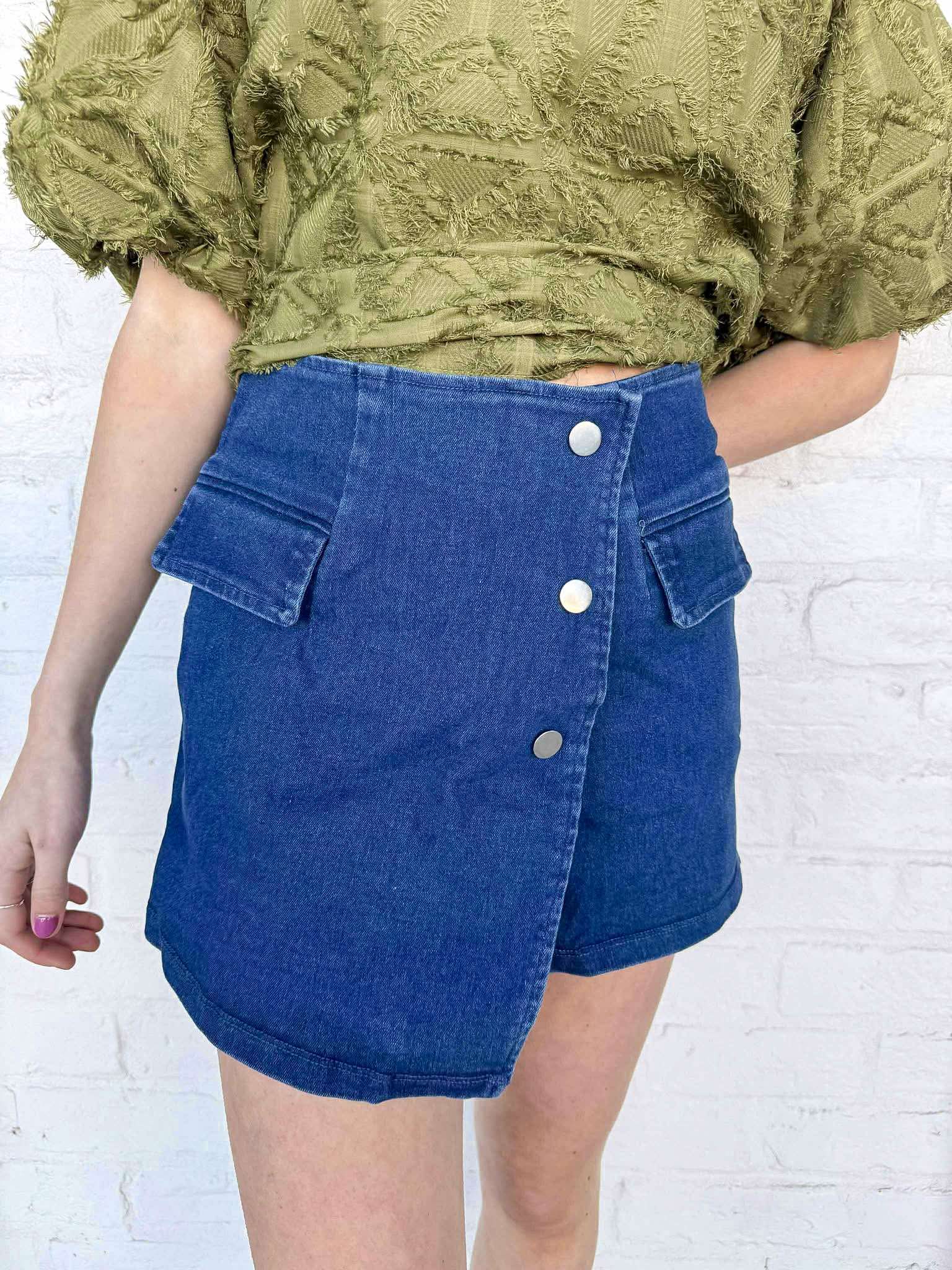 Elevate your style with the Fast Forward Dark Denim Skort, featuring chic gold buttons and a flattering high waist. This versatile piece combines comfort with fashion, offering pockets for practicality while ensuring you feel confident and effortlessly stylish wherever you go! Experience the perfect blend of casual and classy!