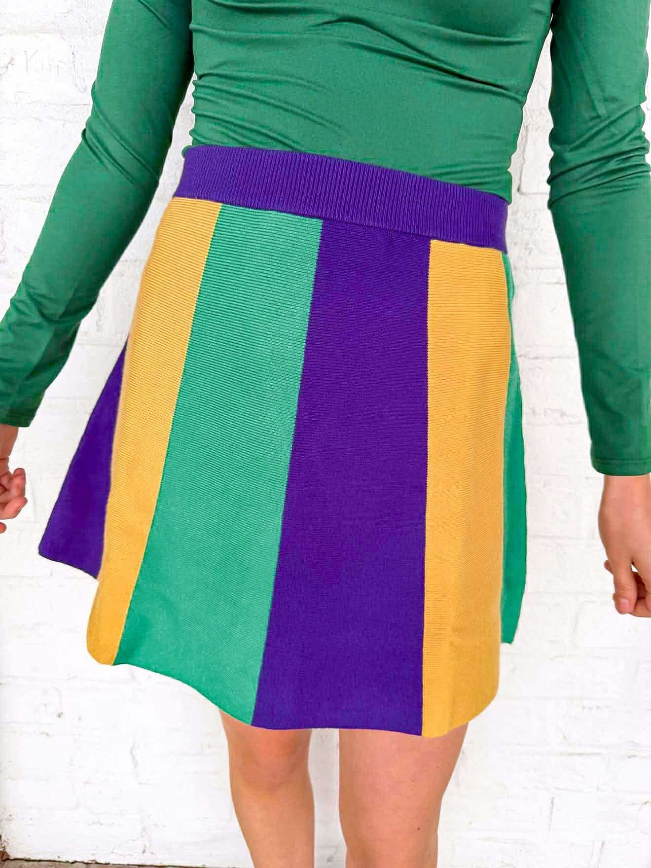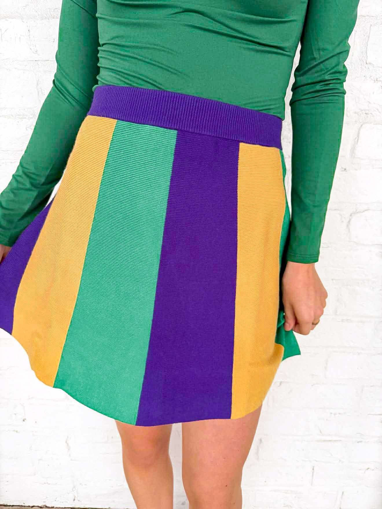 Embrace the festive spirit with the Mardi Gras Vertical Color Block Sweater Skirt! This vibrant parade skirt radiates joy and celebration, making it perfect for your next revelry. Feel the energy of the season as you dance and enjoy the festivities, all while looking effortlessly chic!
