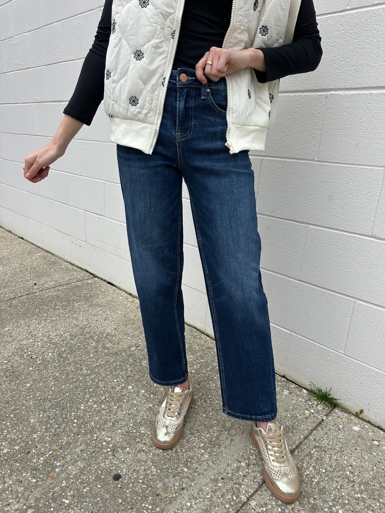 "Experience the ultimate comfort and style with our Regret Nothing Dark High Rise Crop Jean! Crafted from high-quality denim, these jeans provide a snug fit and a flattering look. Don't regret missing out on this must-have addition to your wardrobe!"