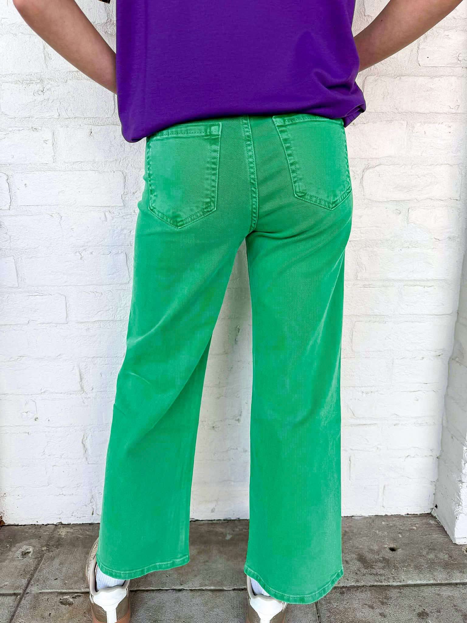 Elevate your style with the Days Ahead Green Denim Jean. Made with a trendy cropped wide leg and ankle length, this deep green jean adds a touch of sophistication to any outfit. Perfect for any day ahead, these jeans will become your go-to for effortless and chic fashion.