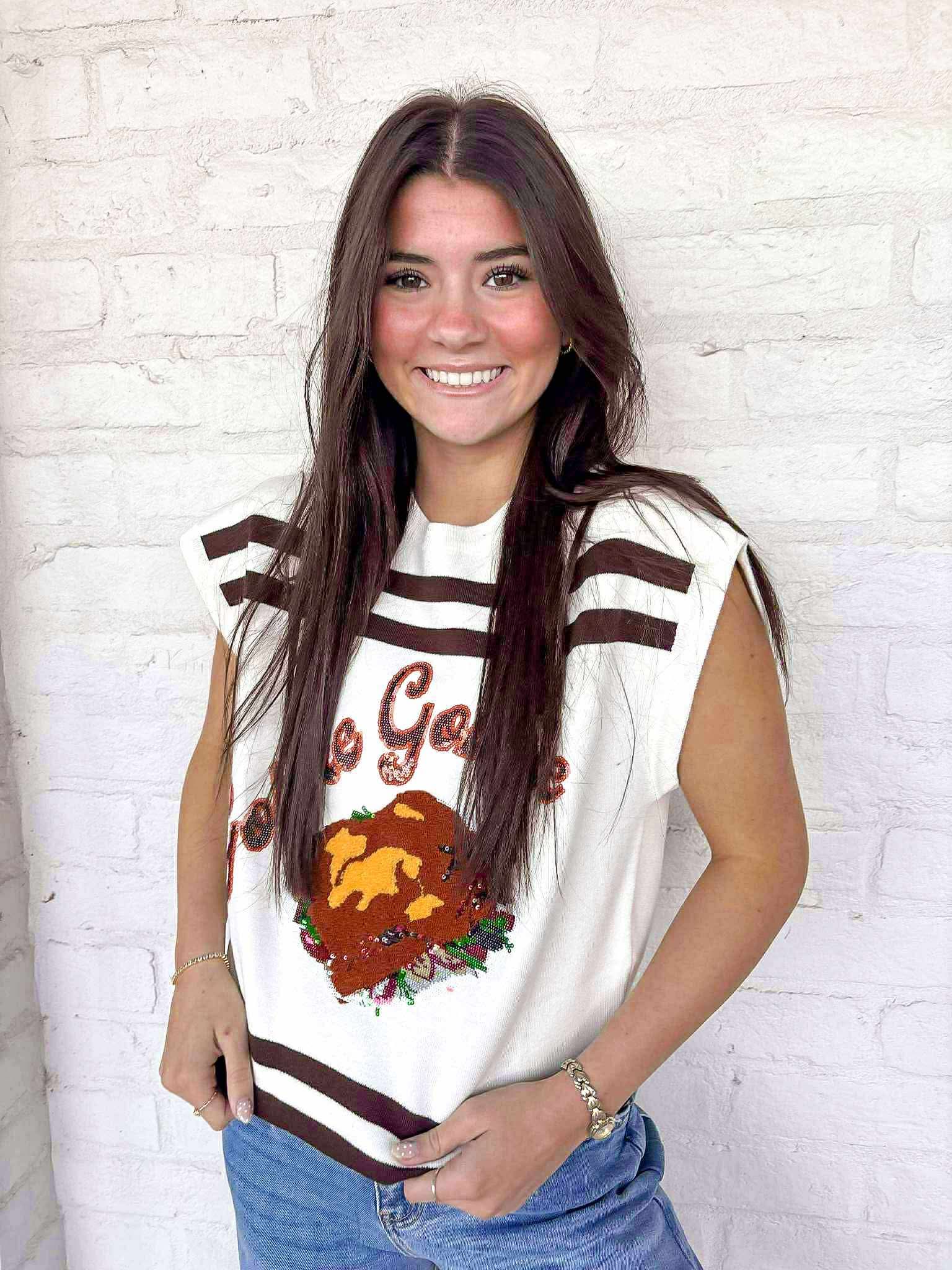 Make Thanksgiving unforgettable with the Queen of Sparkles Gobble Gobble Brown Stripe Short Sleeve Top. This playful design features bold brown shoulder stripes and a dazzling sequined turkey centerpiece, paired with the festive “Gobble Gobble” slogan. The lightweight knit and relaxed fit make it the perfect mix of sparkle, comfort, and holiday cheer—whether you’re hosting dinner, watching football, or snapping family photos.