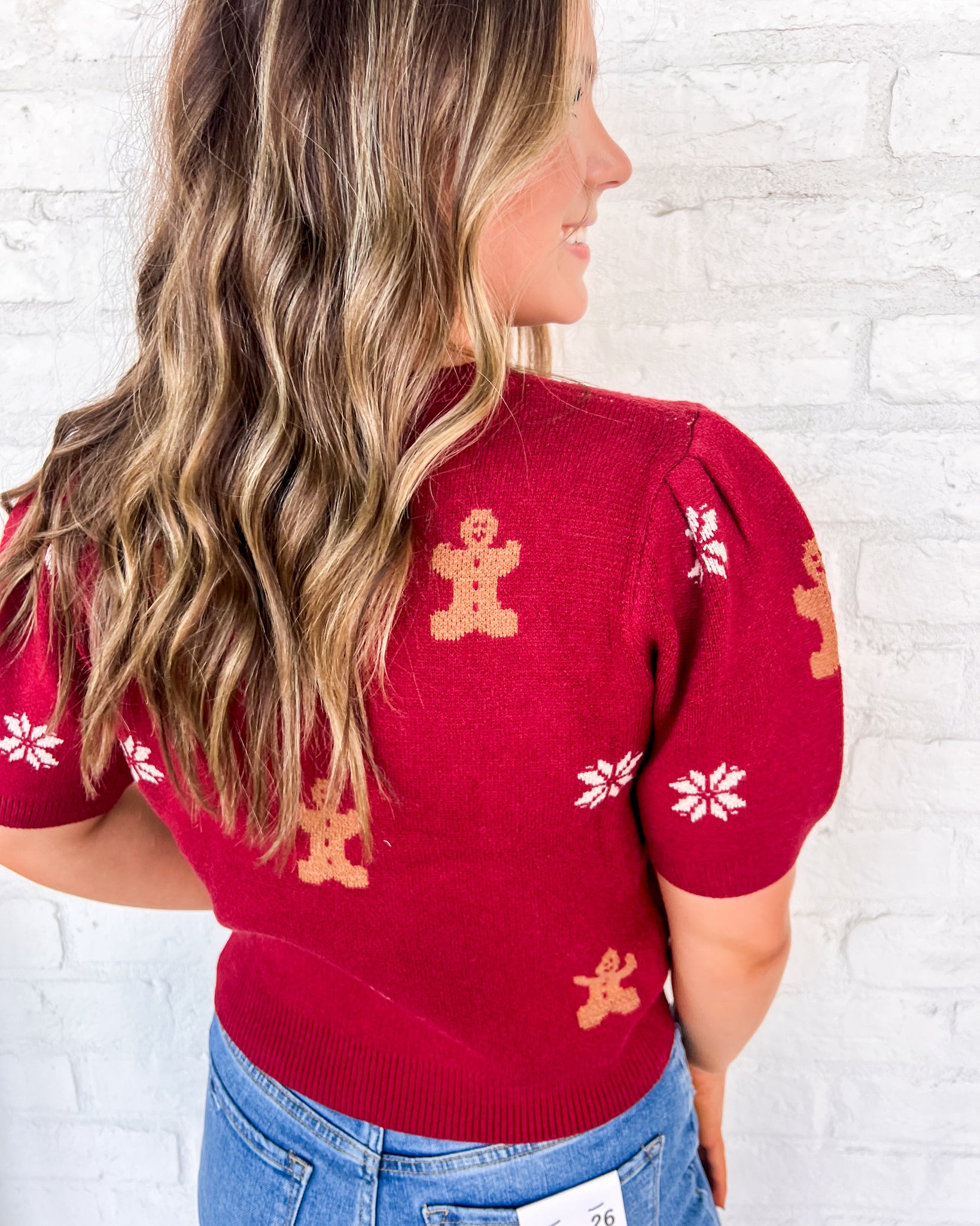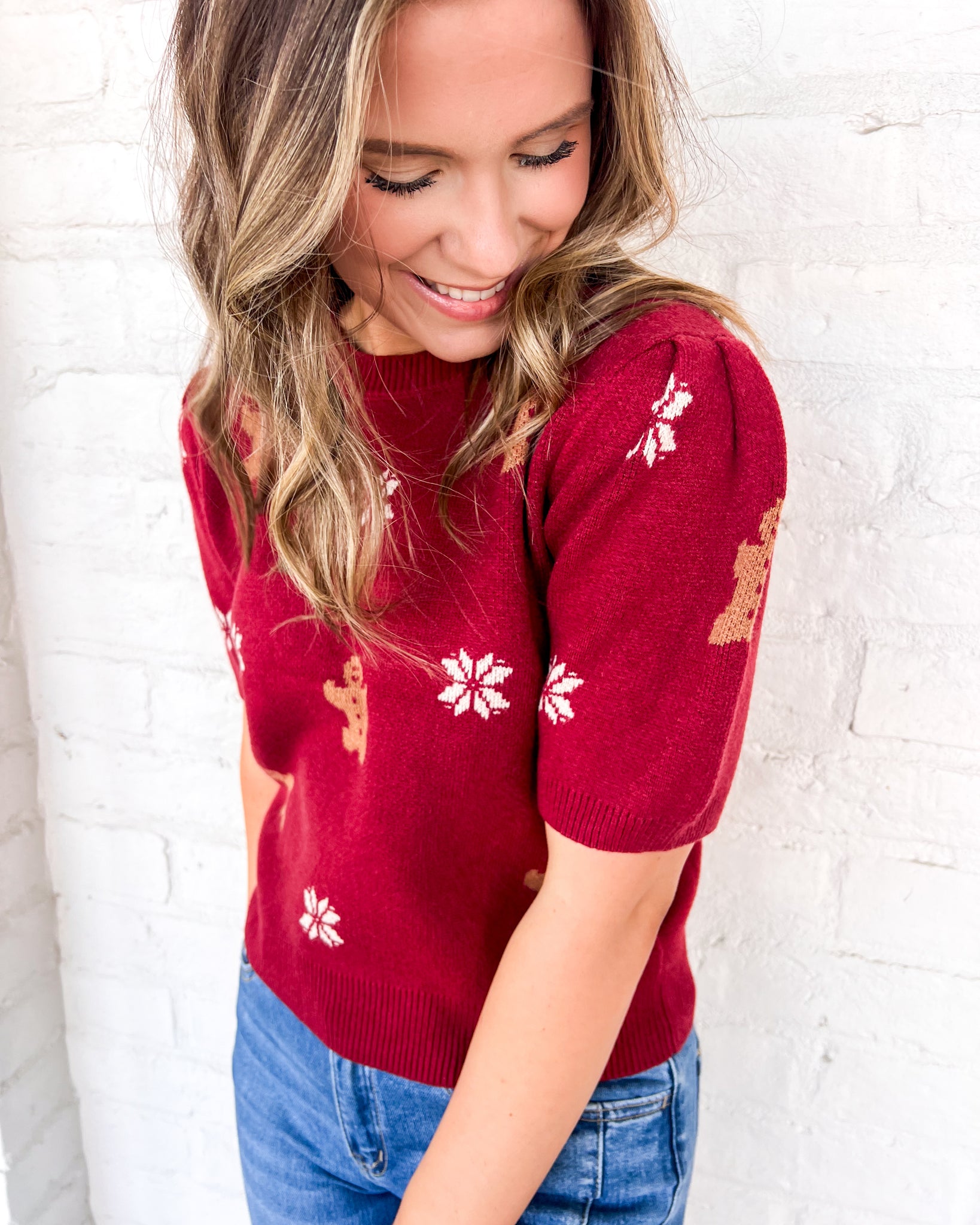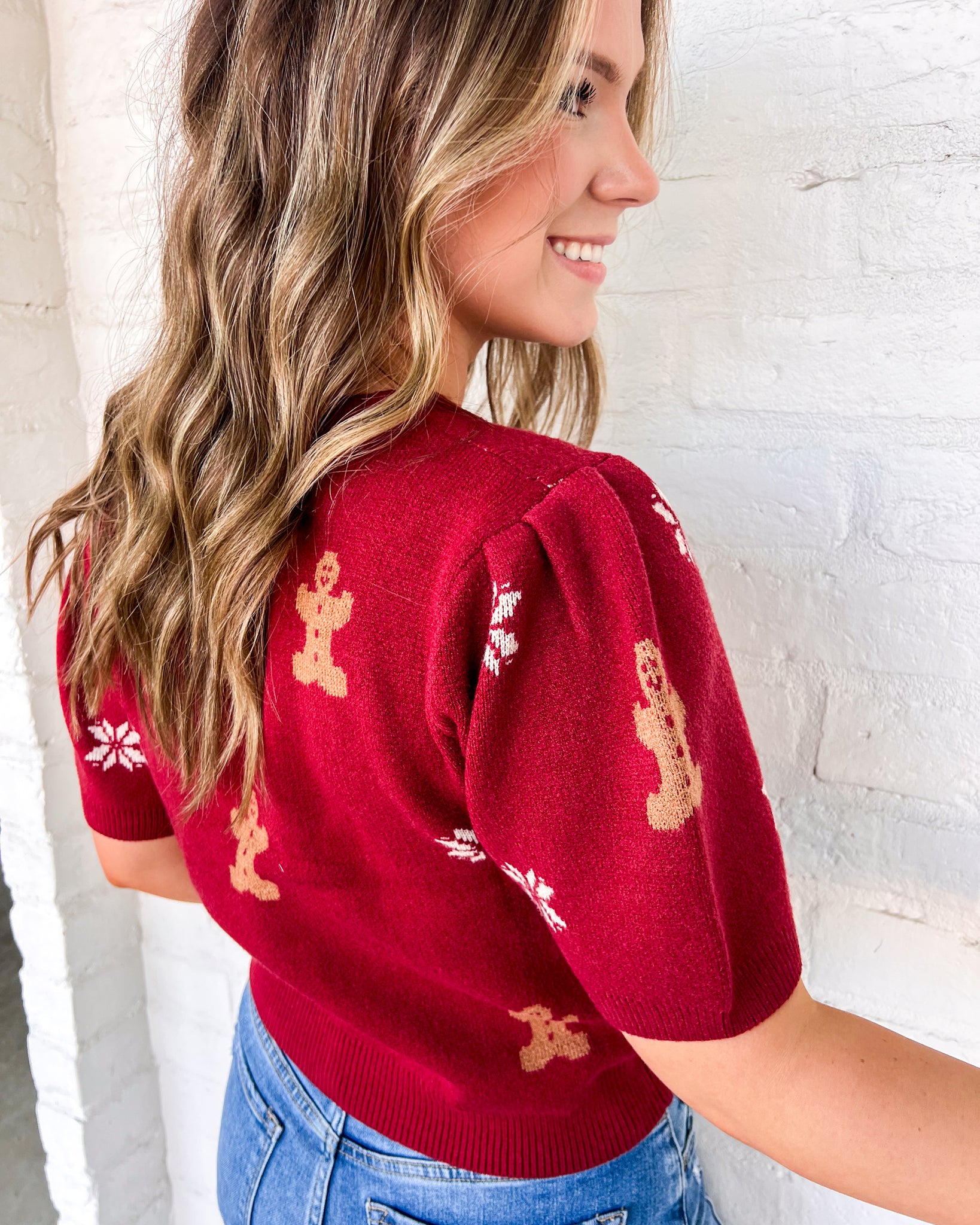 "Unleash your festive spirit with our Right Now Red Top. This short puff sleeve top boasts a charming gingerbread pattern, perfect for spreading holiday cheer. Stay cozy and stylish with this must-have sweater top. Order yours today!"