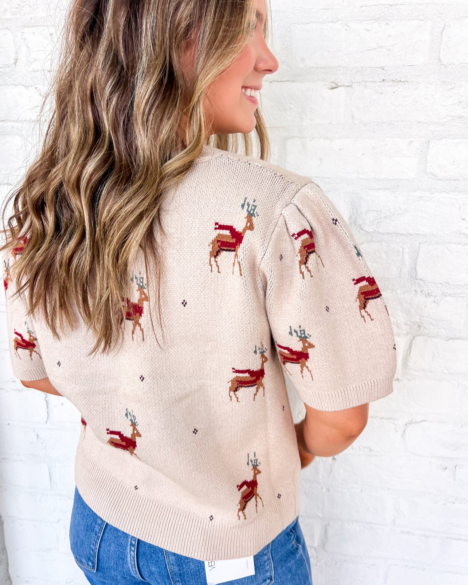 "Unleash your festive spirit with our Right Now Red Top. This short puff sleeve top boasts a charming pattern, perfect for spreading holiday cheer. Stay cozy and stylish with this must-have sweater top. Order yours today!"