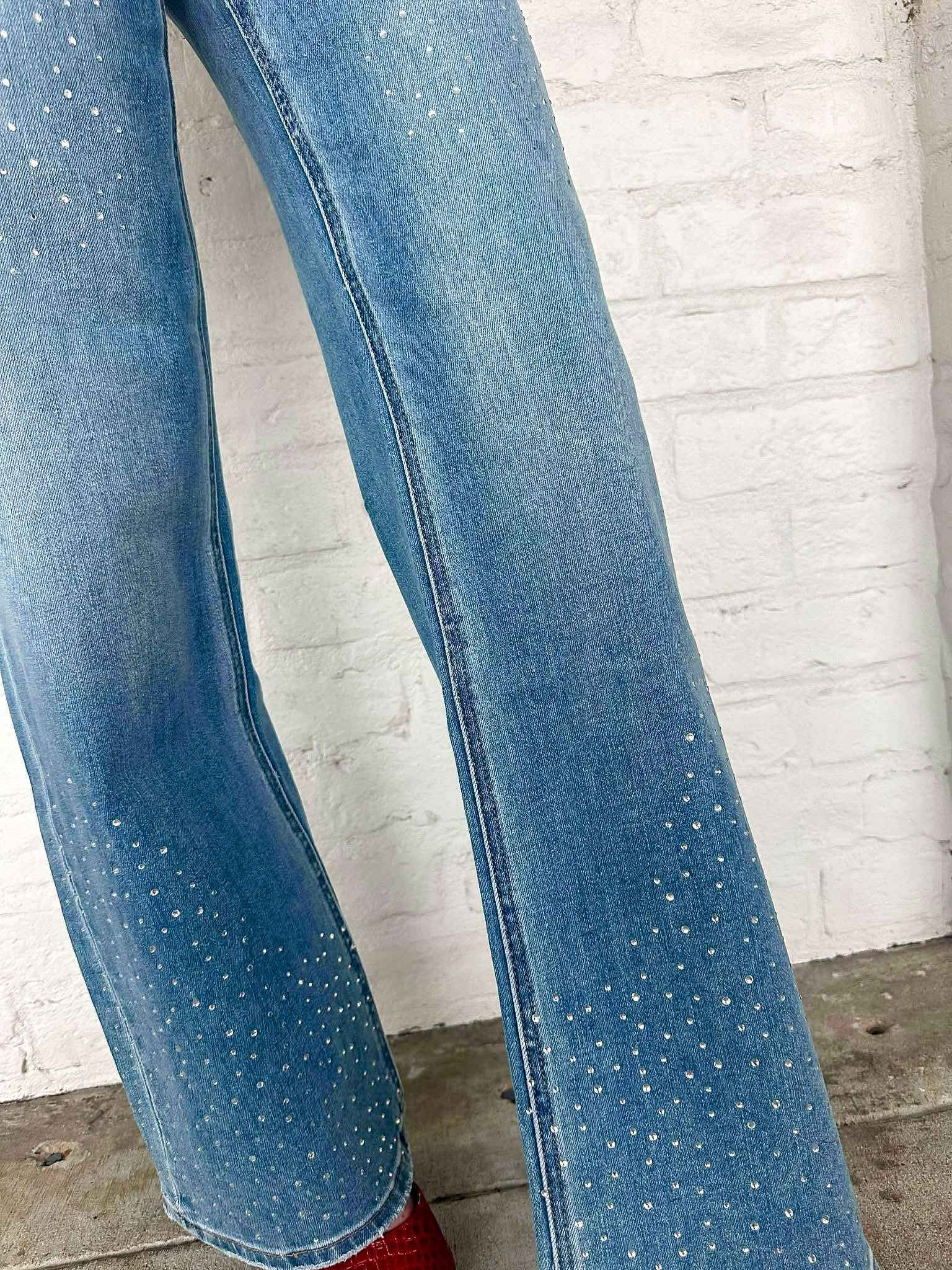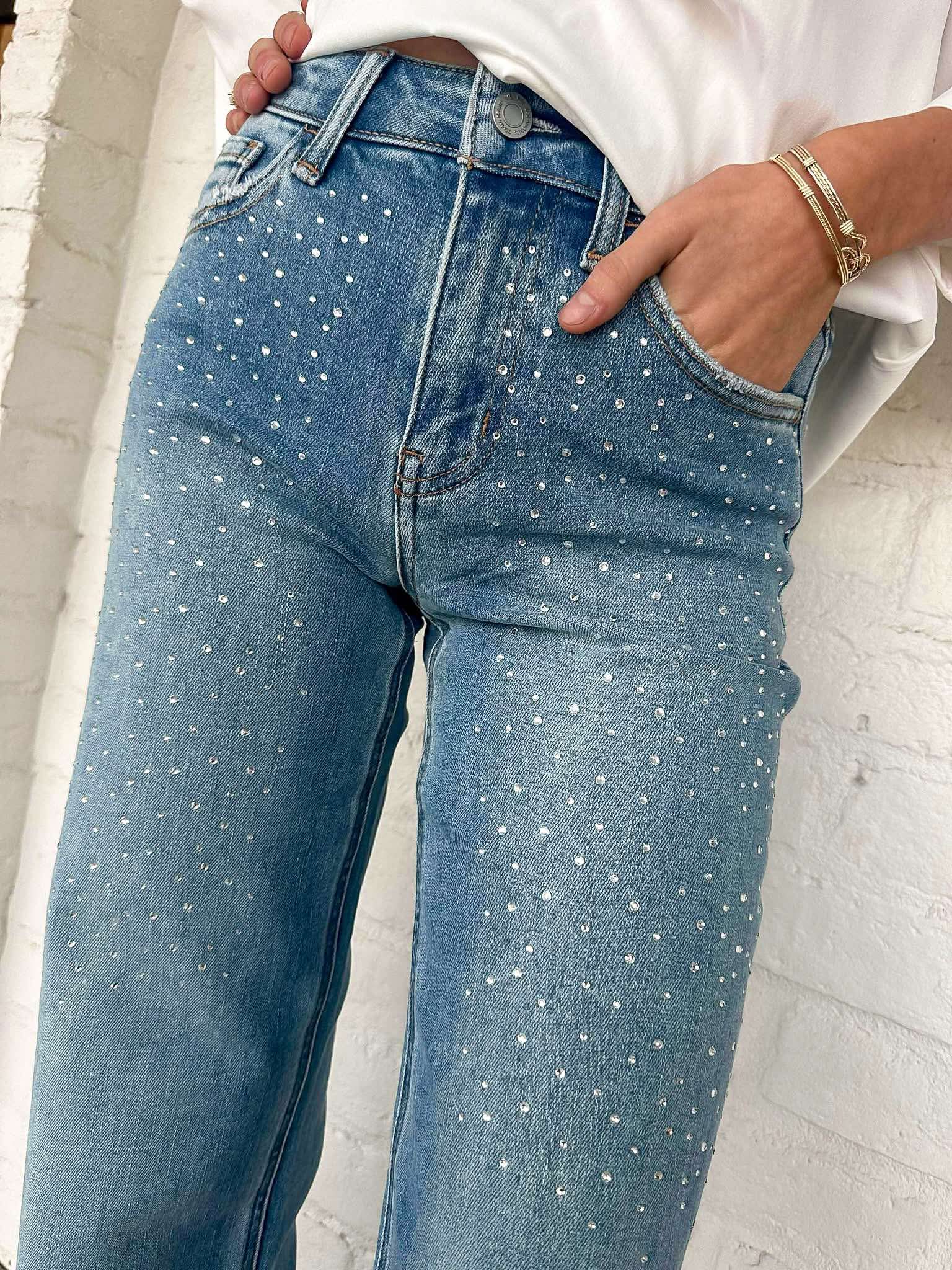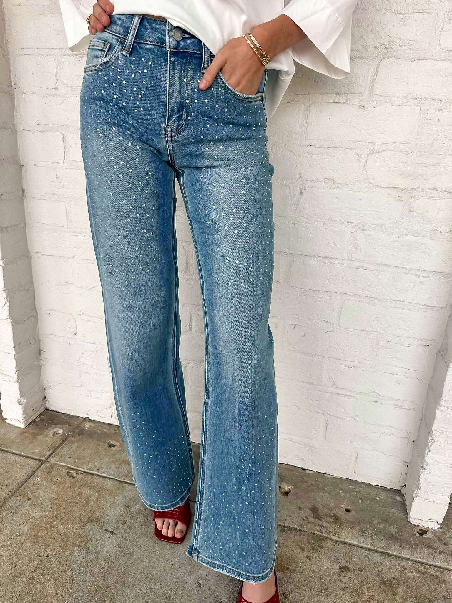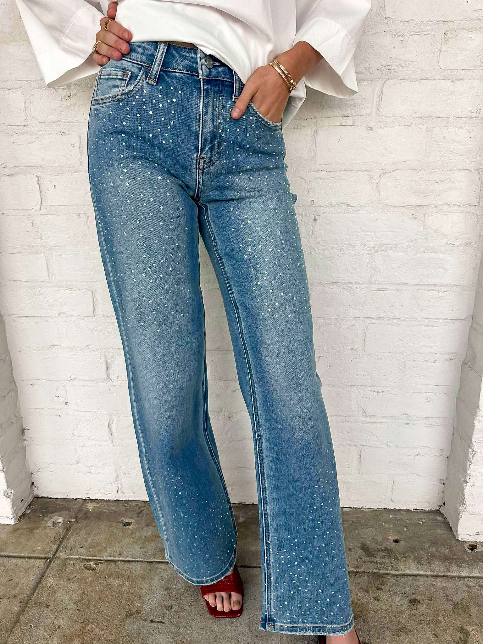 Elevate your style with our Fabulous News Rhinestone Wide Jeans! These high-rise jeans feature dazzling rhinestone embellishments on the front, adding an extra touch of glamour to your look. Step out in confidence and make a statement with these wide jeans that are sure to turn heads.