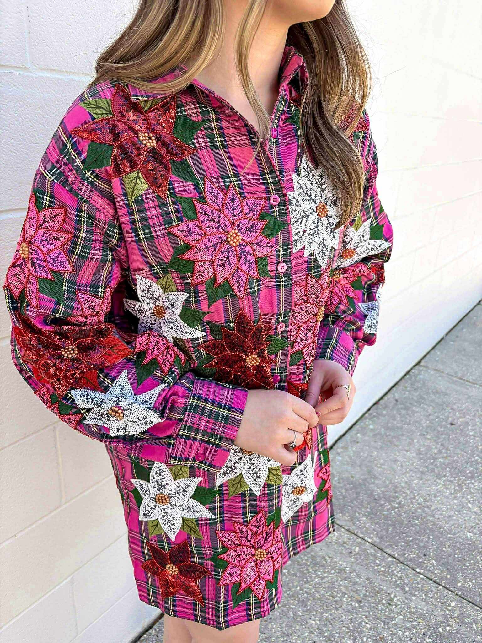 Queen Of Sparkles Pink Plaid Poinsettia Button Up Long Sleeve Dress