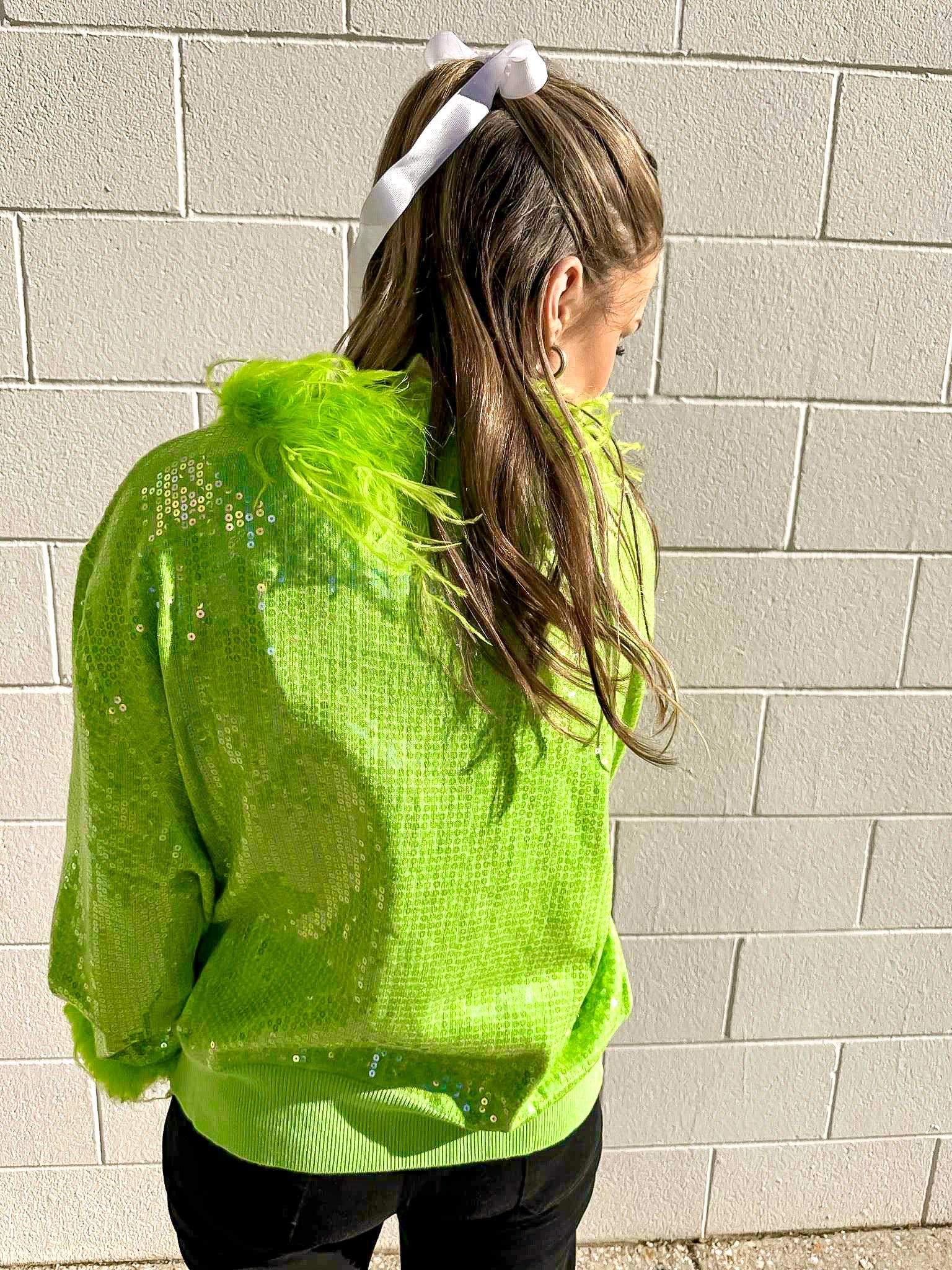 Experience the magic of the holiday season with our Queen Of Sparkles Green Full Sequin Grinch Sweatshirt! Featuring the lovable and mischievous Grinch who stole Christmas, this sweatshirt will add a touch of sparkle to your winter wardrobe. Stay cozy and stylish while spreading Christmas cheer with every step.