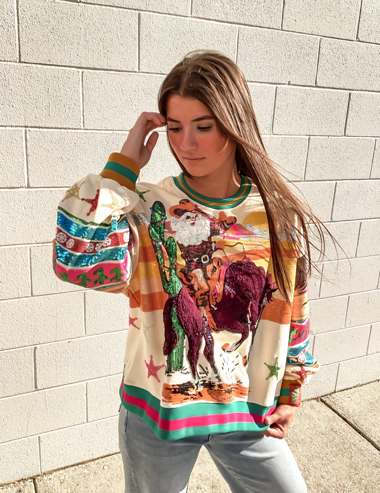 Queen Of Sparkles Multi Vintage Cowboy Santa Sweatshirt