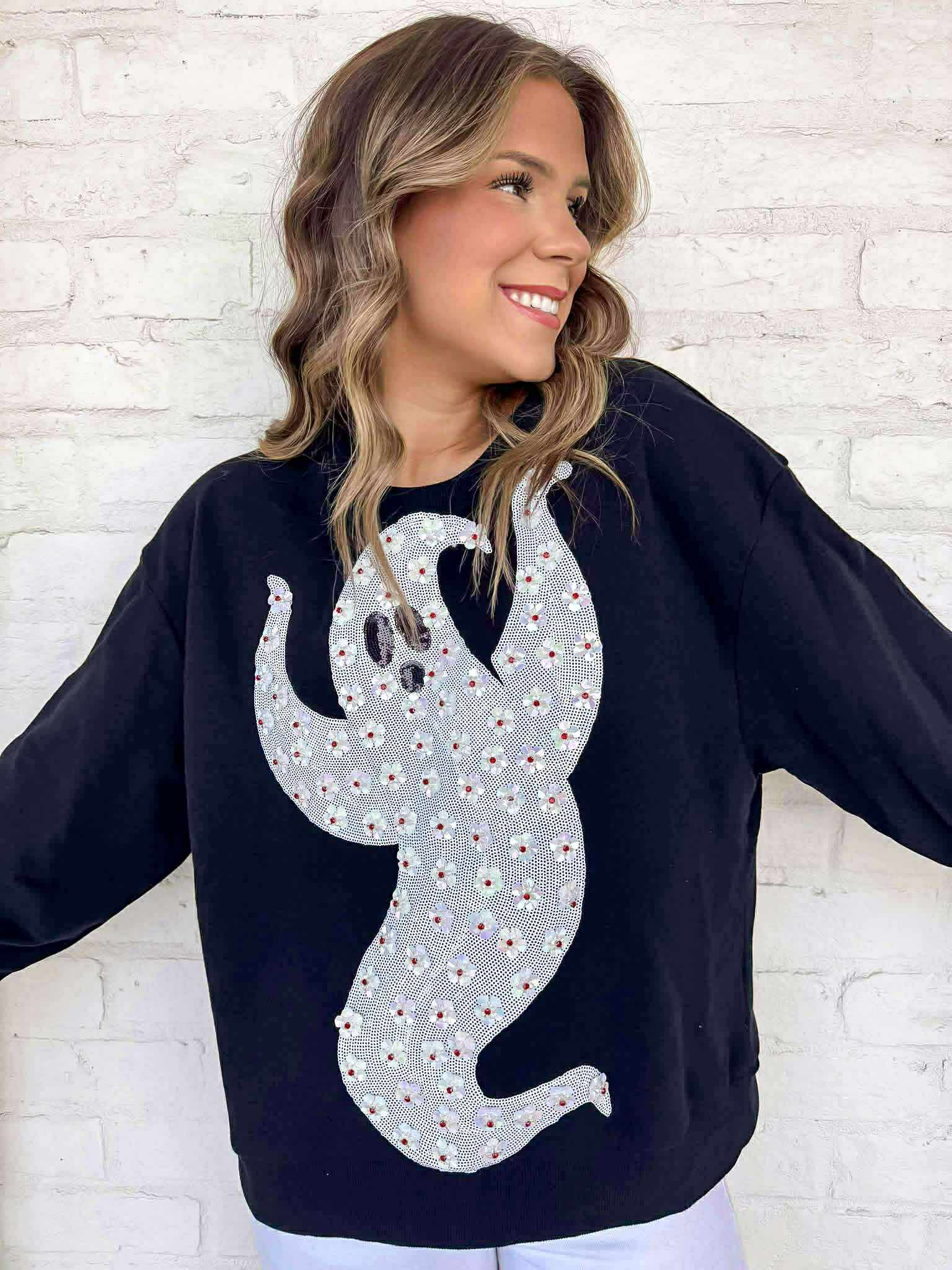 Get ready to shine this Halloween with our Queen of Sparkles Black and White Flower Sequin Ghost Sweatshirt! With its hauntingly beautiful ghost design, you'll be the talk of the town. Plus, the sequin details add an extra touch of sparkle to make you stand out. Don't miss out on this must-have Halloween look!