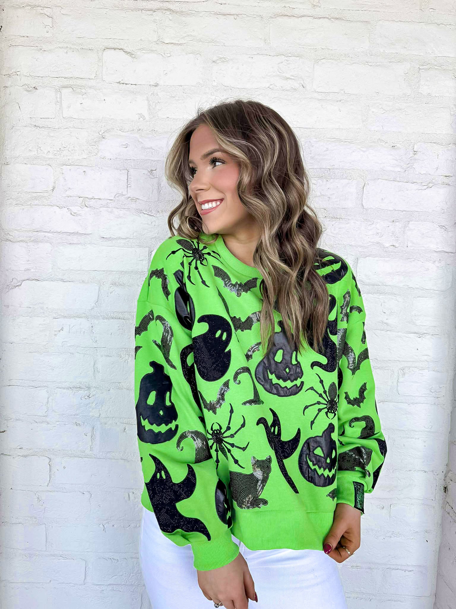 Add a touch of Halloween magic to your wardrobe with our Queen Of Sparkles Green & Black Icon Sweatshirt! Stand out in style with the bold and eye-catching icon design, perfect for spooky season. Made with quality materials for a comfortable and long-lasting wear. Get ready to shine and show off your love for the holiday!