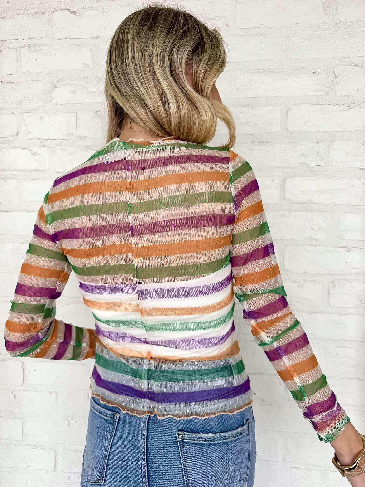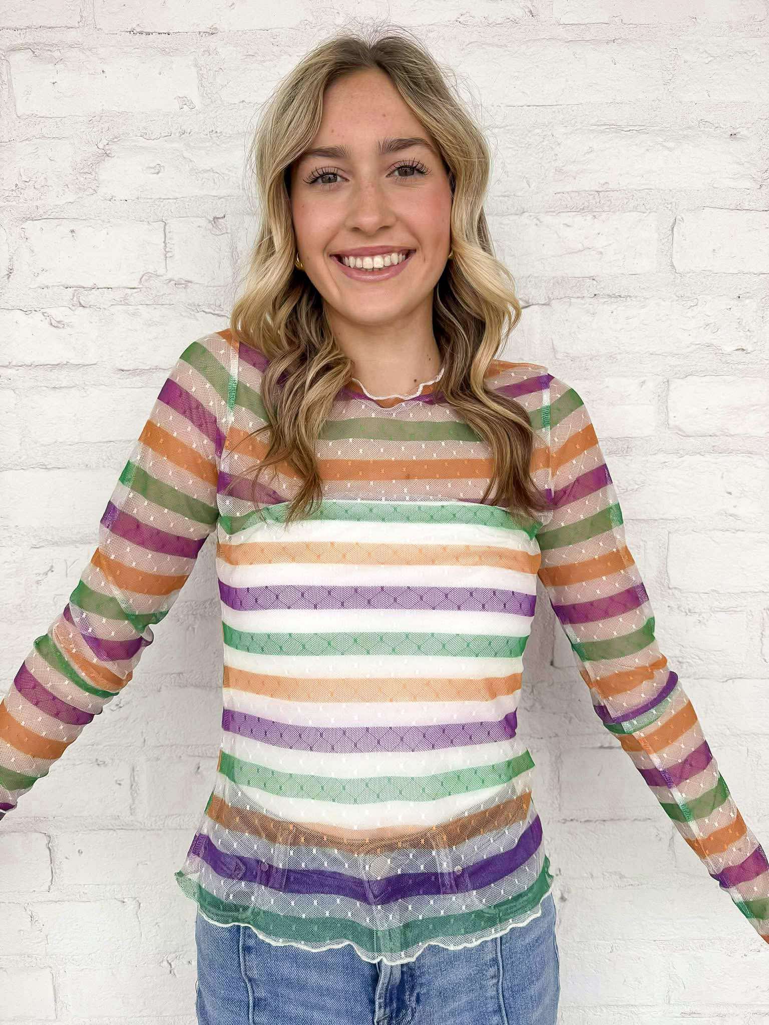 Get ready to party in style with our vibrant Mardi Gras Stripe Mesh Sling Sleeve Top! Featuring bold Mardi Gras stripes and a playful mesh design, this top is perfect for any festive occasion. Stand out and make a statement with this eye-catching and unique top.