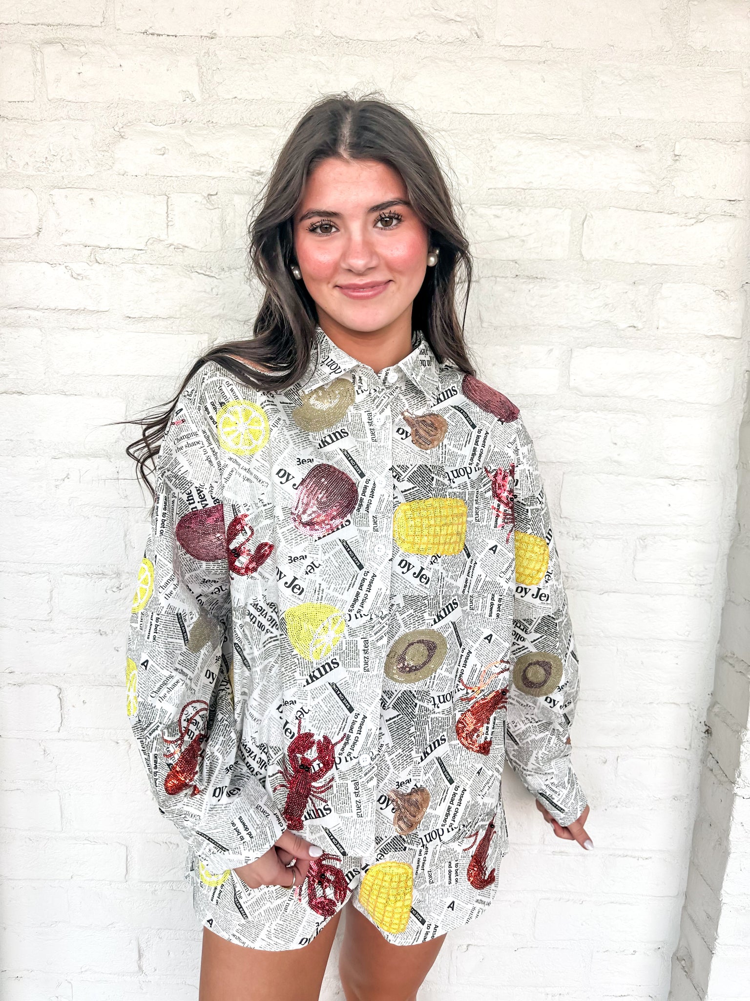 Indulge in regal style with the Queen of Sparkles Newspaper Seafood Button Up. This unique black and white newspaper print top is perfect for adding a touch of sophistication to any outfit. Made with quality materials, it offers comfort and style, making you feel like a true fashionista.