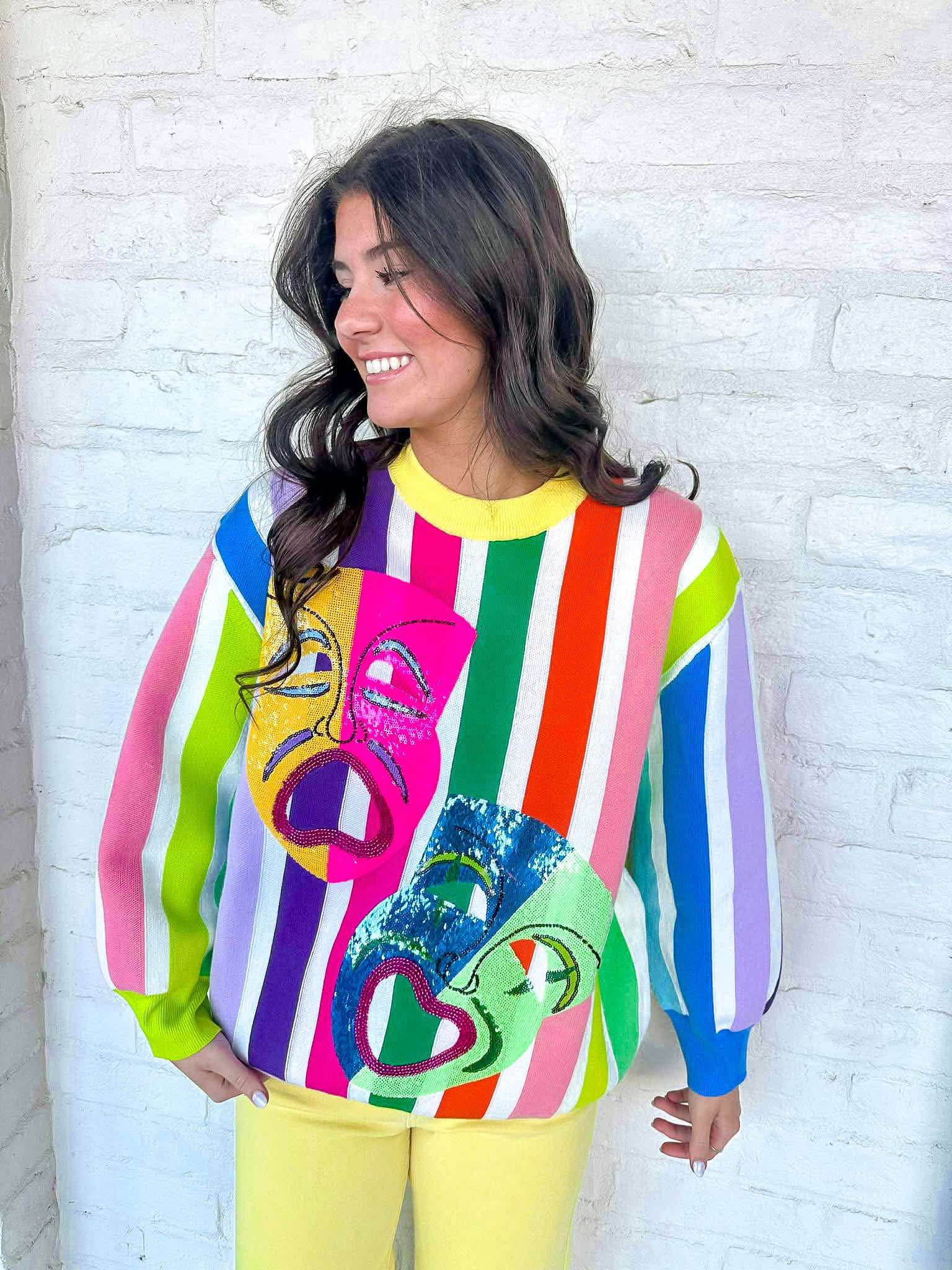 Get ready to sparkle and shine with our Queen Of Sparkles Rainbow Stripe Mask Sweater! This fun and festive sweater features a playful Mardi Gras theme, perfect for adding a touch of color and excitement to any outfit. Stand out in the crowd and show off your style with this vibrant and eye-catching piece.