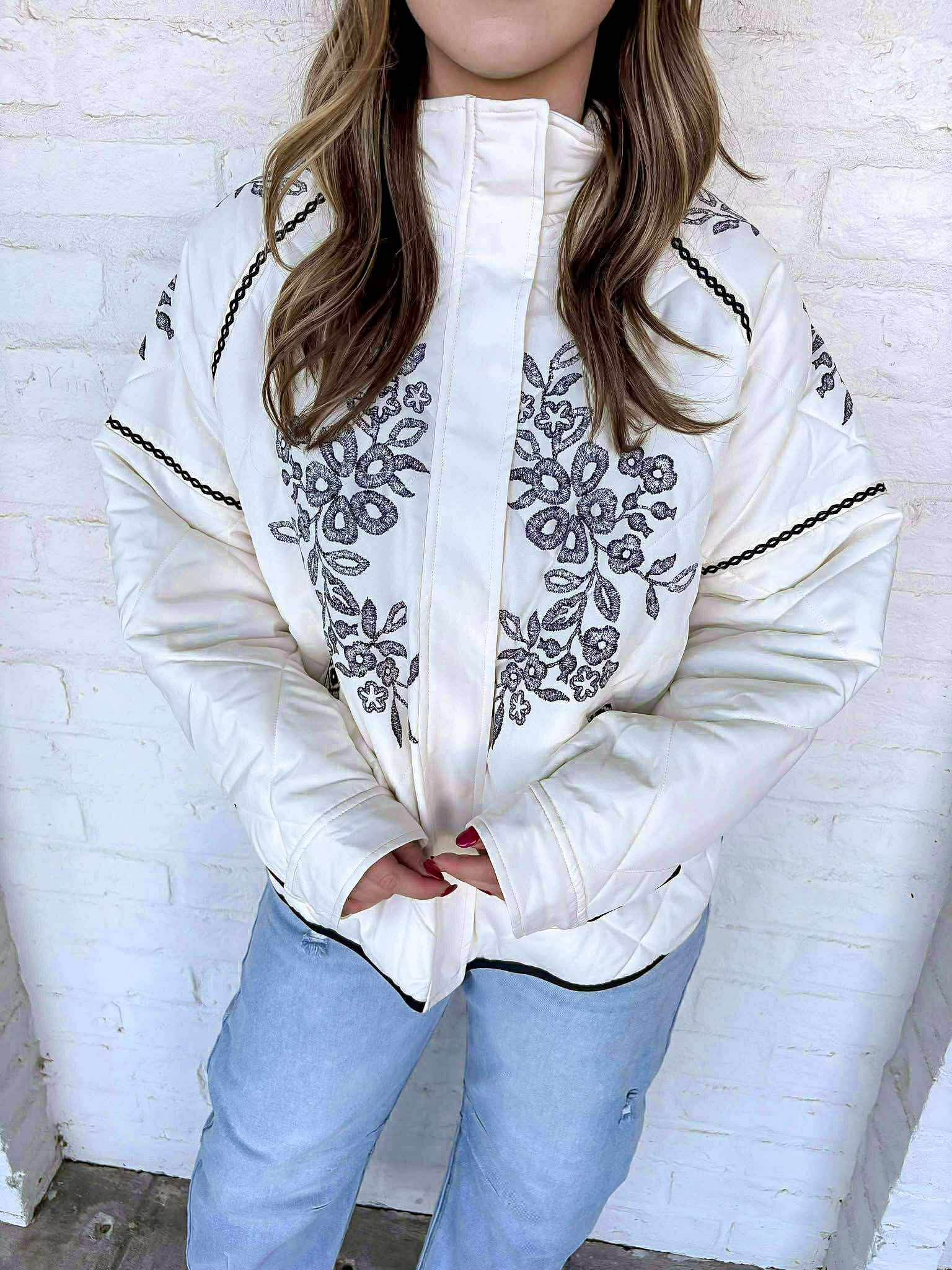 Wrap yourself in timeless beauty with our Everlasting Love Ivory Black Jacket. This stunning piece features a delicate embroidered quilt design that adds a touch of elegance to any outfit. Made from high-quality material, it will keep you warm and stylish for years to come. Fall in love with fashion all over again!