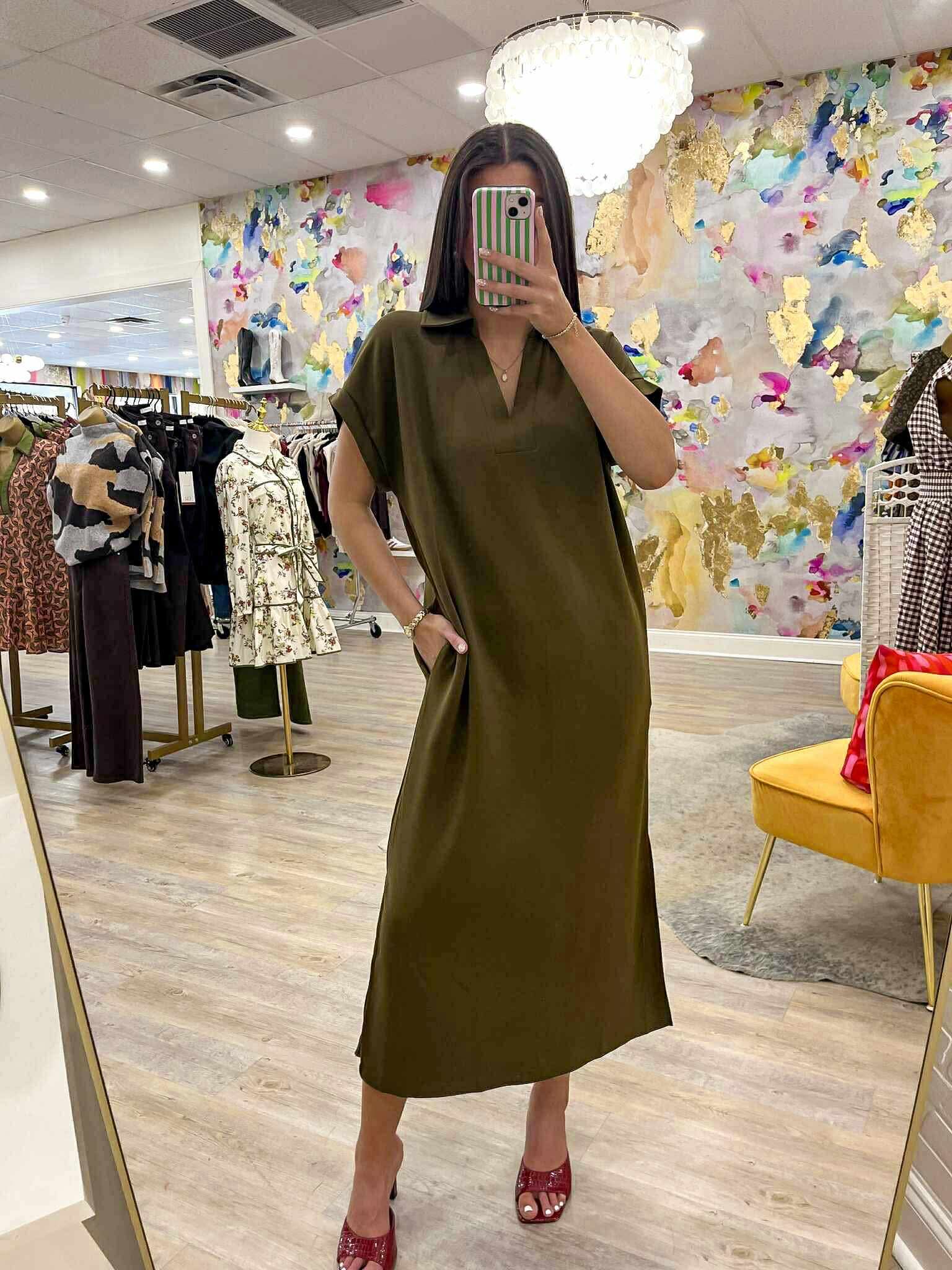 Elevate your style with our Good Time For Now Olive Dress. This sleek olive maxi dress is perfect for any occasion, providing a sophisticated and fashionable look. Dress it up or down for a versatile and timeless addition to your wardrobe. Embrace confidence and elegance with this dress.