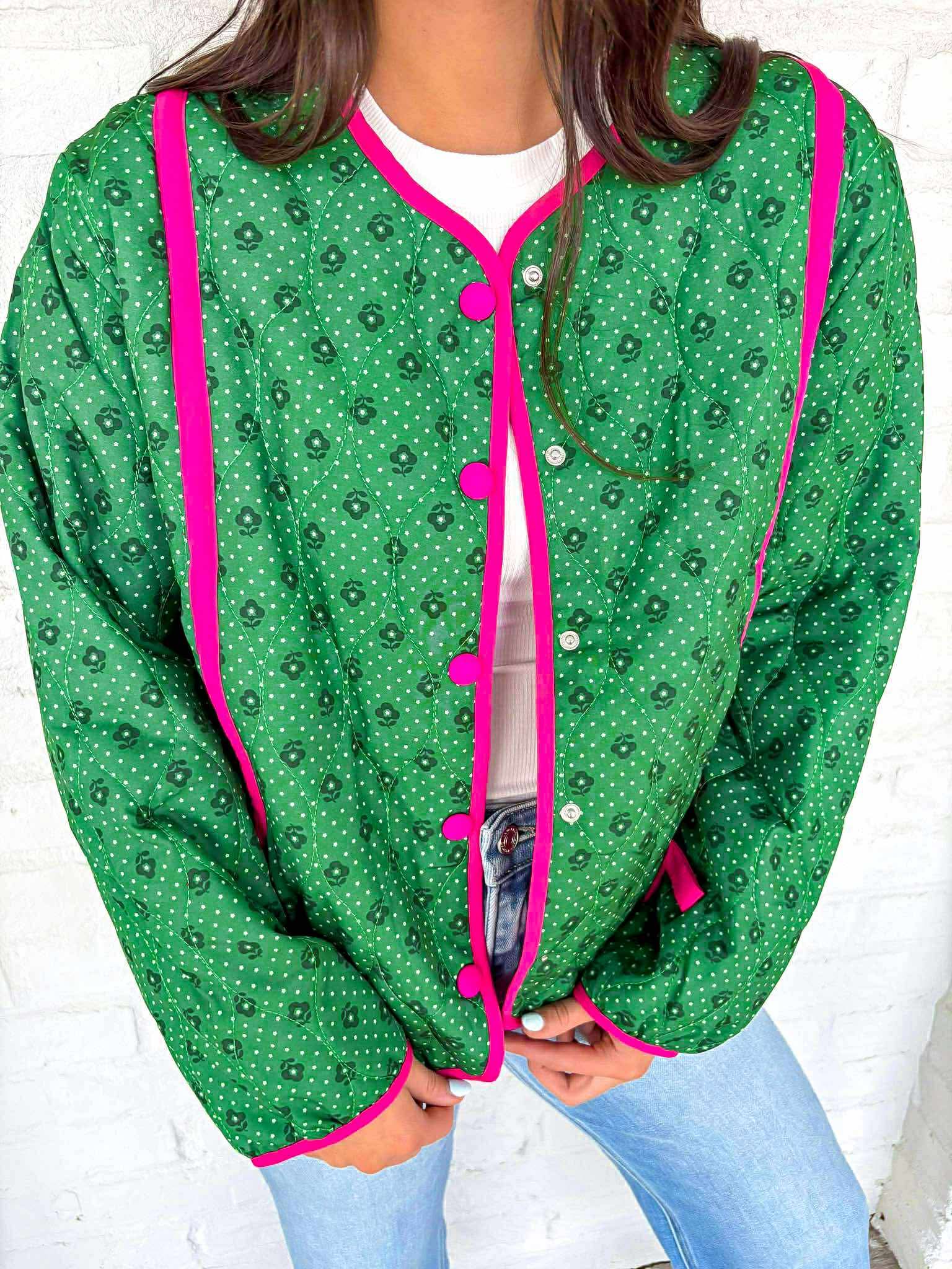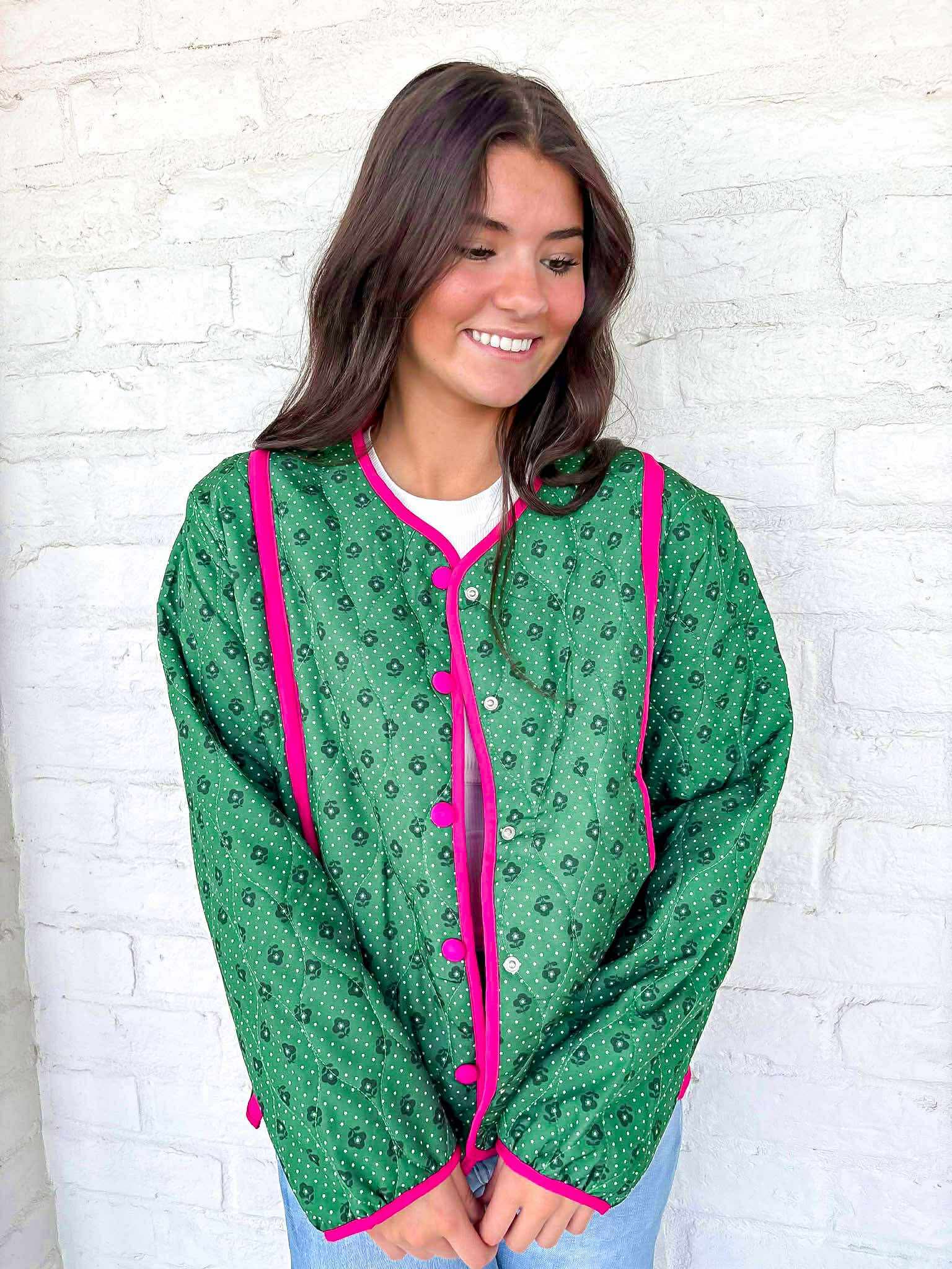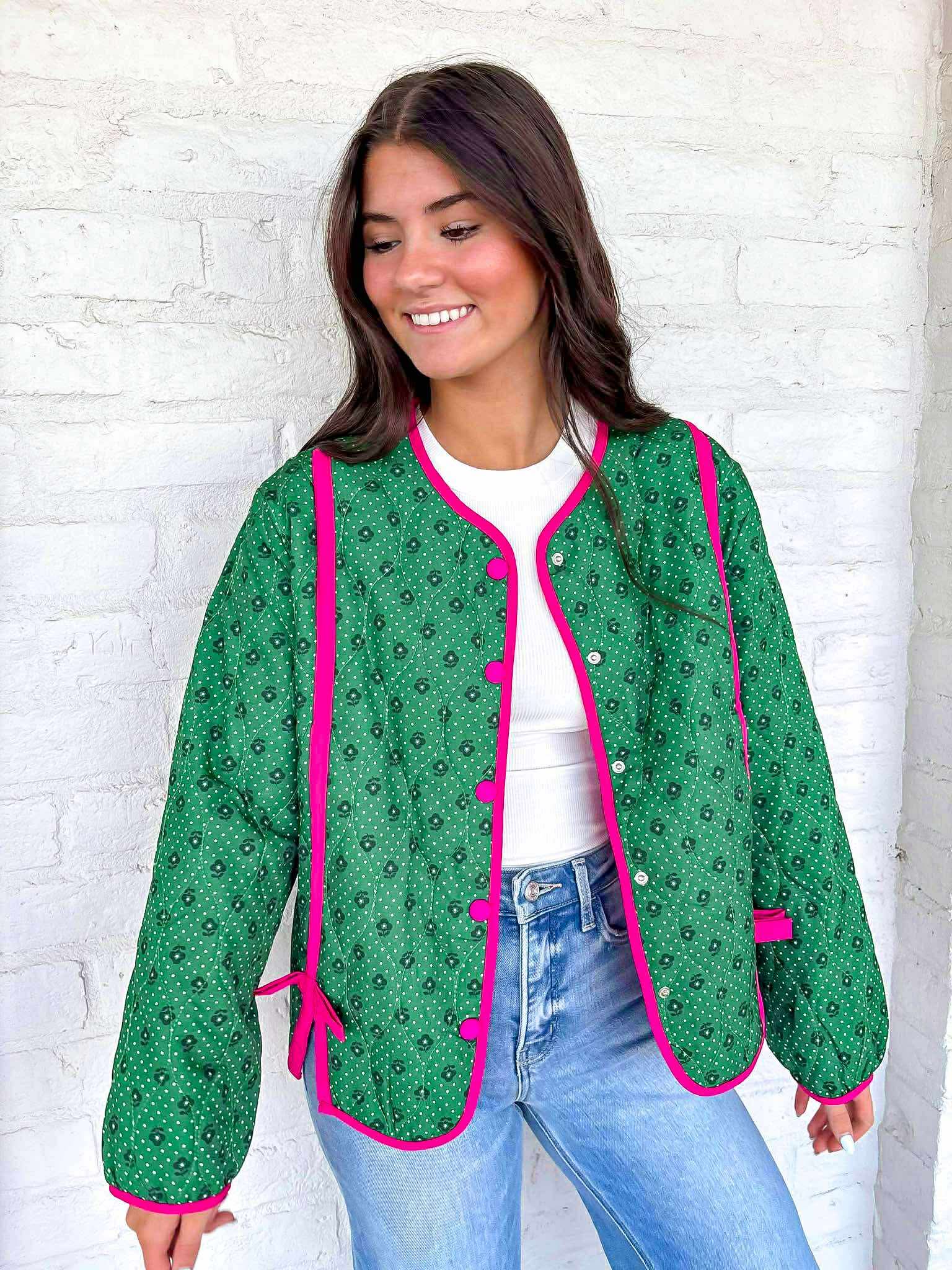Get ready to turn heads with the Happen With Love Green Jacket! With a vibrant combination of green and pink, this jacket is sure to make you stand out. Its unique design will have you feeling confident and stylish for any occasion. Experience the perfect balance of color and fashion with this must-have piece.