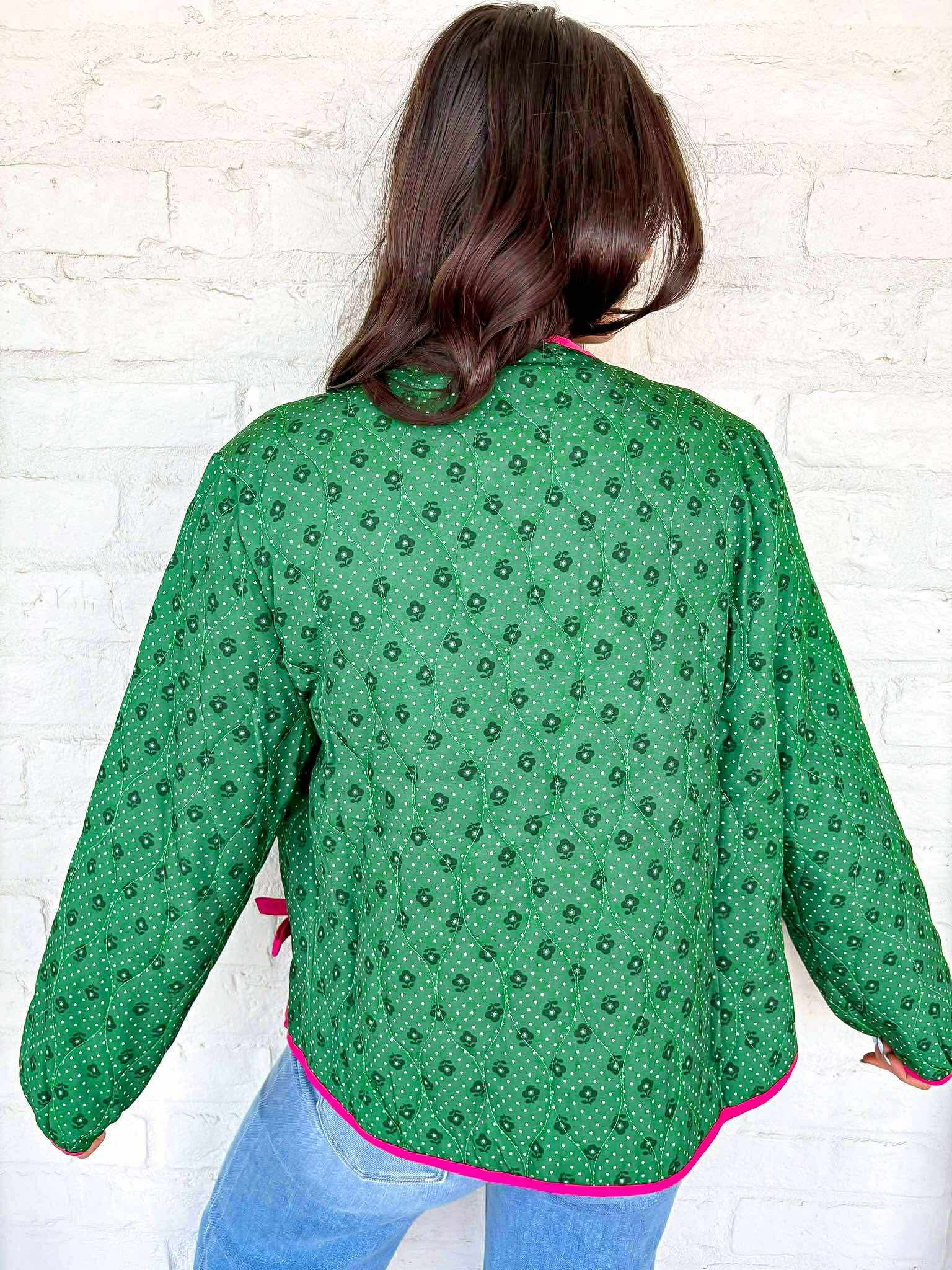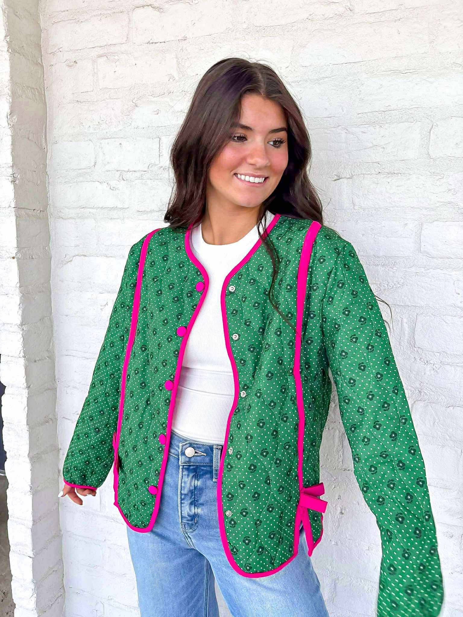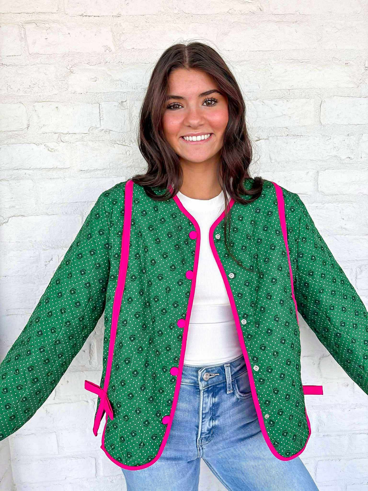 Get ready to turn heads with the Happen With Love Green Jacket! With a vibrant combination of green and pink, this jacket is sure to make you stand out. Its unique design will have you feeling confident and stylish for any occasion. Experience the perfect balance of color and fashion with this must-have piece.