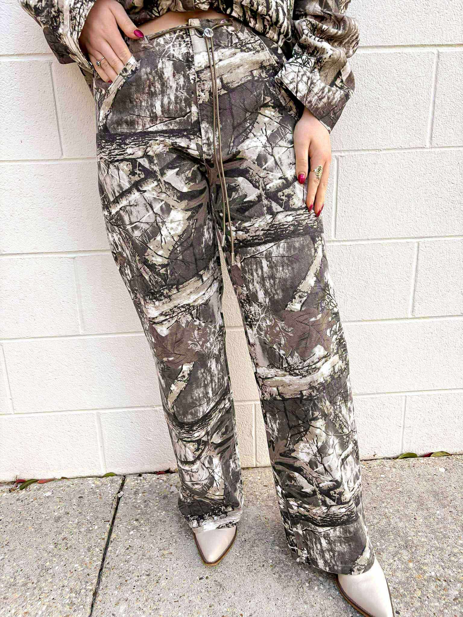 Experience the perfect blend of comfort and style with our Because Of You Camo Pants. Made with a denim-like camo fabric, these pants are sure to make a bold statement. Upgrade your wardrobe with this versatile and trendy piece that will elevate any outfit!