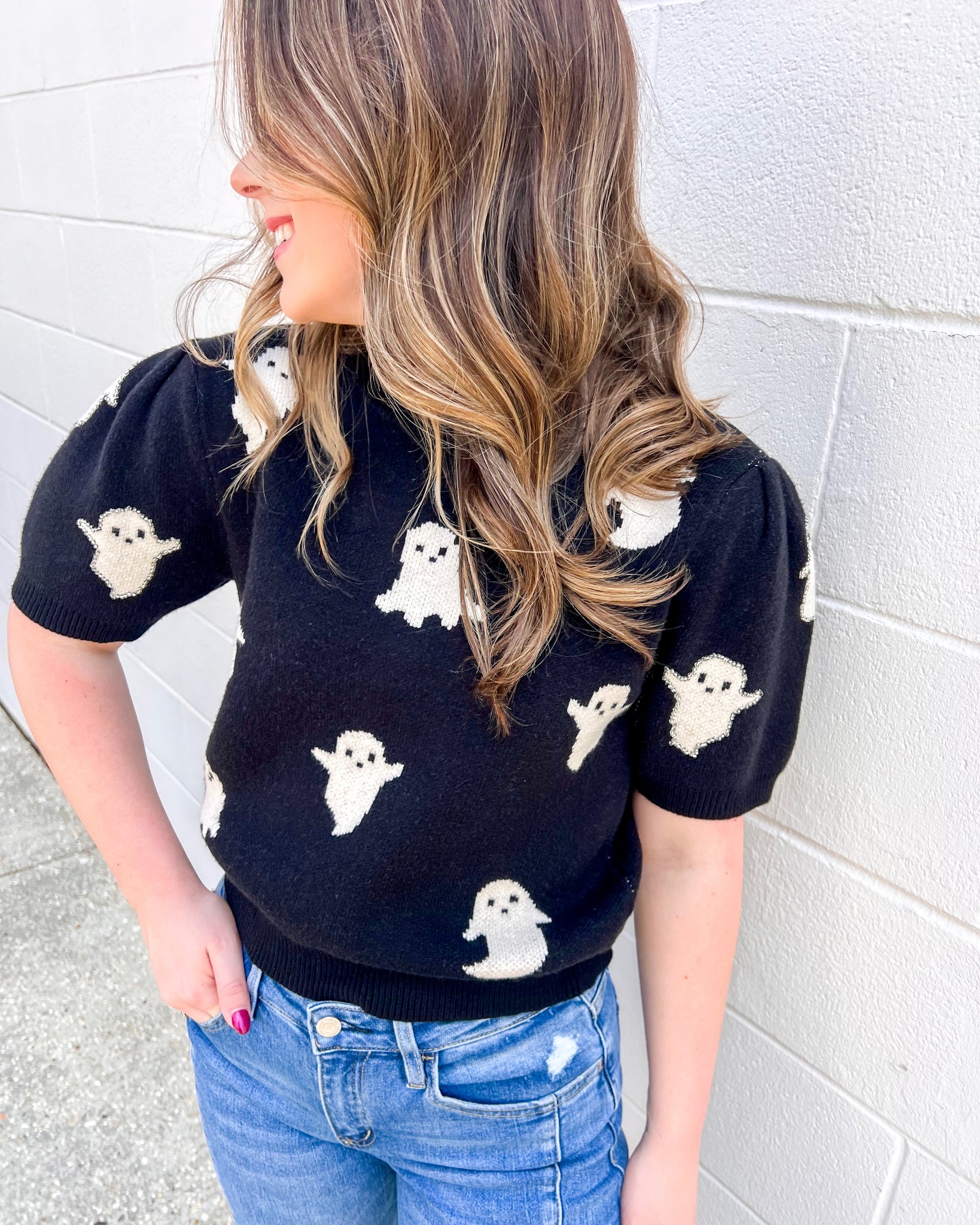 The Little Boo Thing Ghost Top, perfect for Halloween, features puff short sleeves and a fun ghost pattern. This playful sweater top will keep your little one cozy and stylish during the spooky season. Get ready for some ghostly fun with this must-have for any Halloween wardrobe!