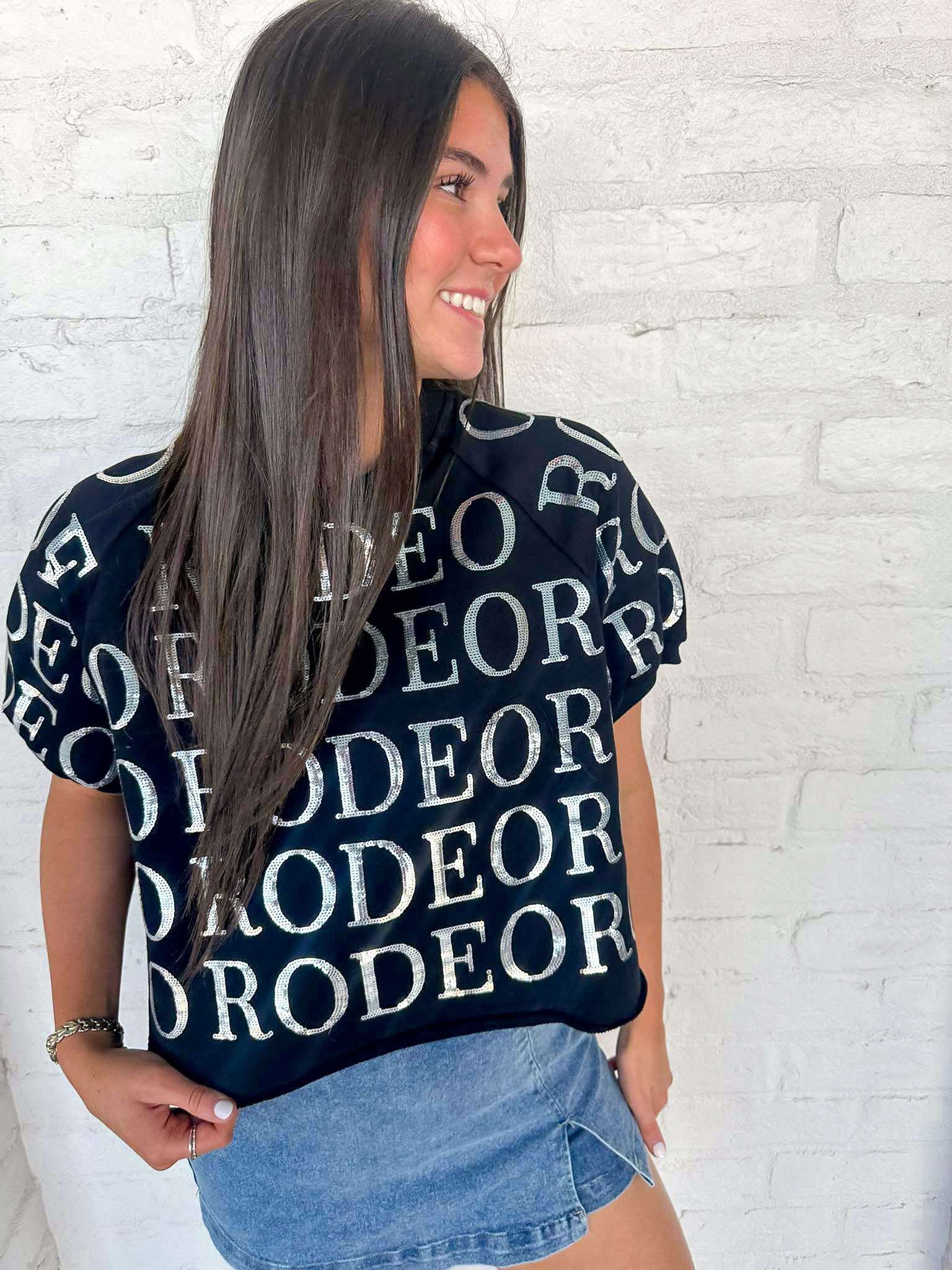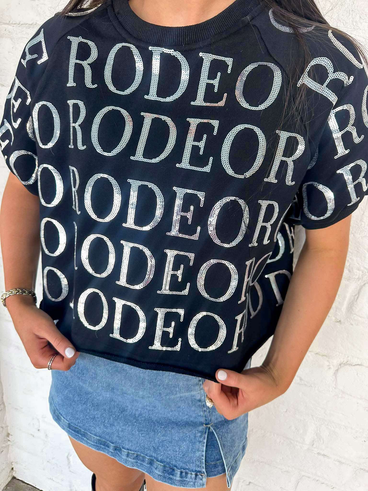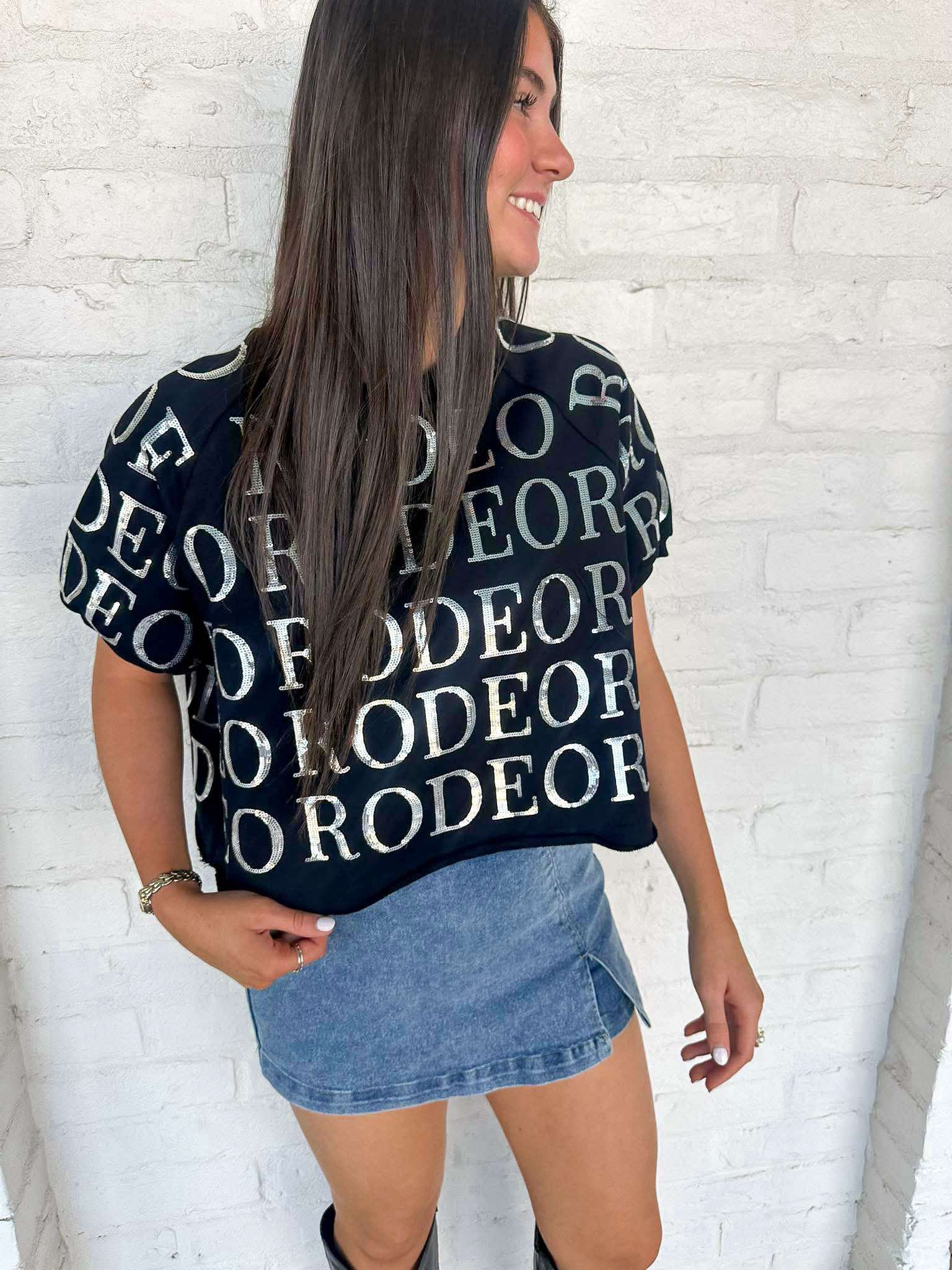 Step into the spotlight with the Rodeo Scattered Black Top, designed to make you the center of attention wherever you go! Its glamorous shine ensures you’ll turn heads and feel confident. Elevate your wardrobe and embrace the thrill of standing out with this stunning piece!