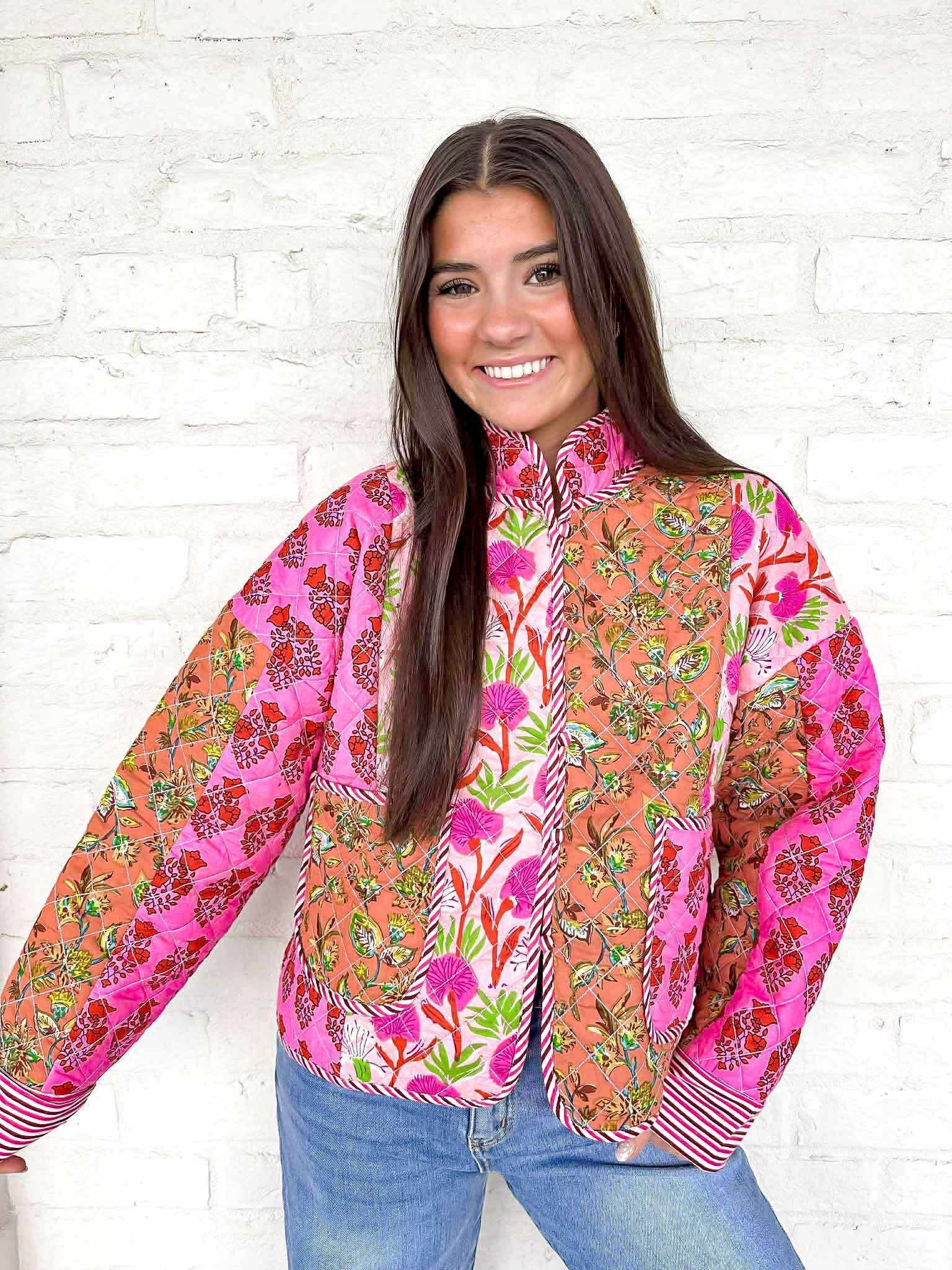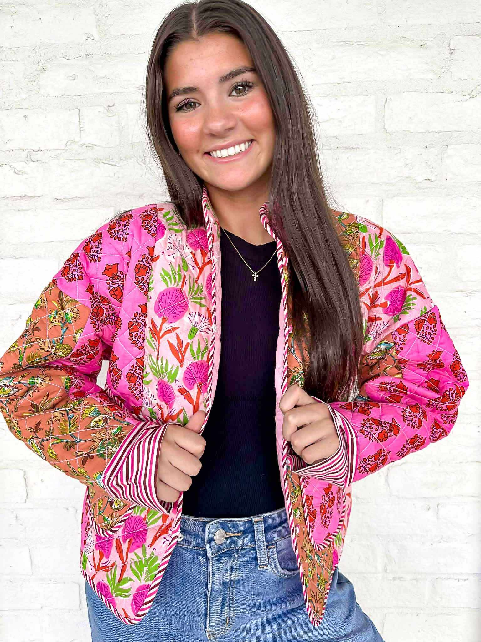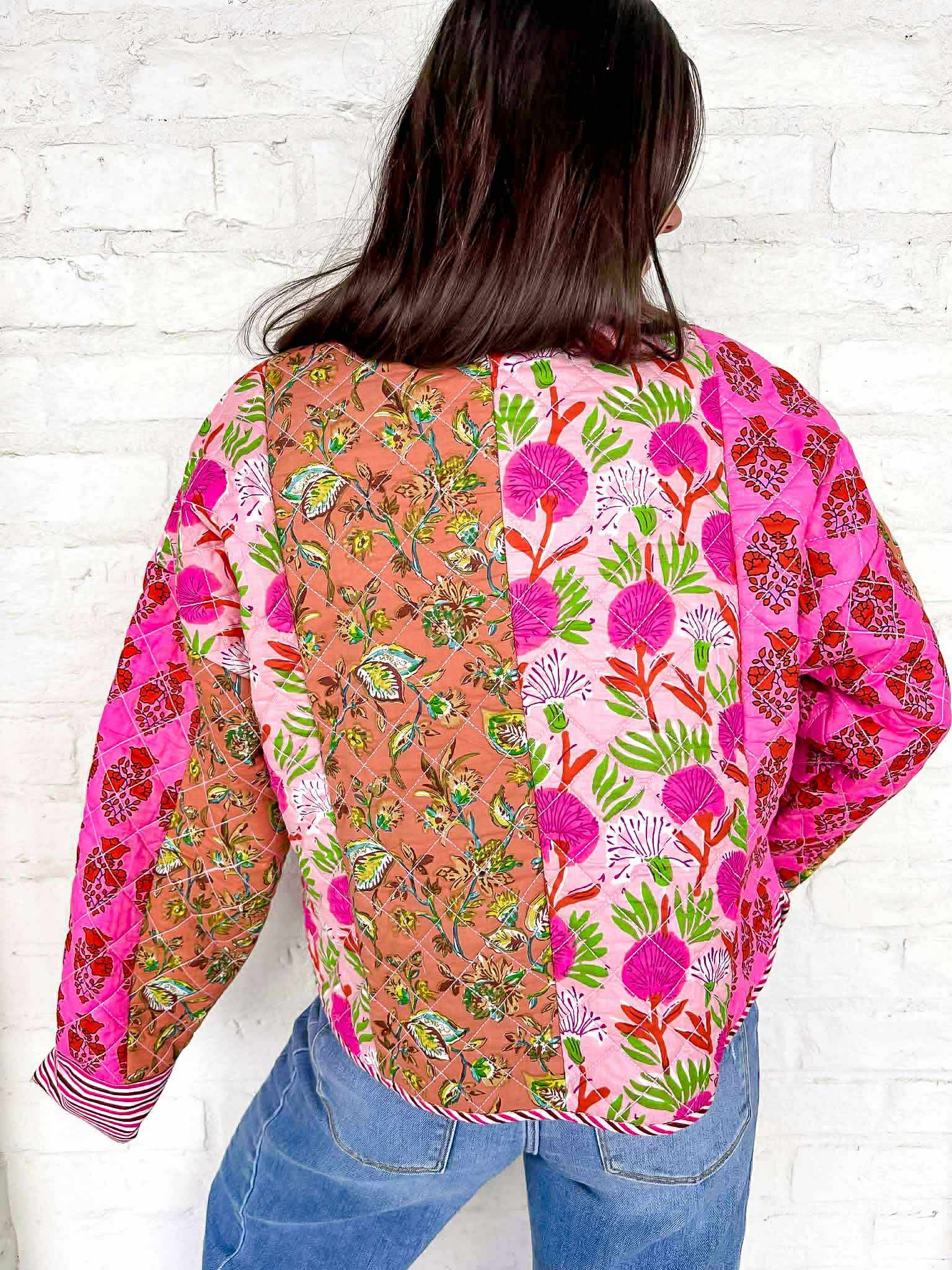 Wrap yourself in love with the THML Garden Of Love Pink Patch Jacket. This patchwork quilted jacket is the perfect way to add a touch of warmth and style to any outfit. Say goodbye to boring jackets and embrace the unique and eye-catching design of this statement piece.