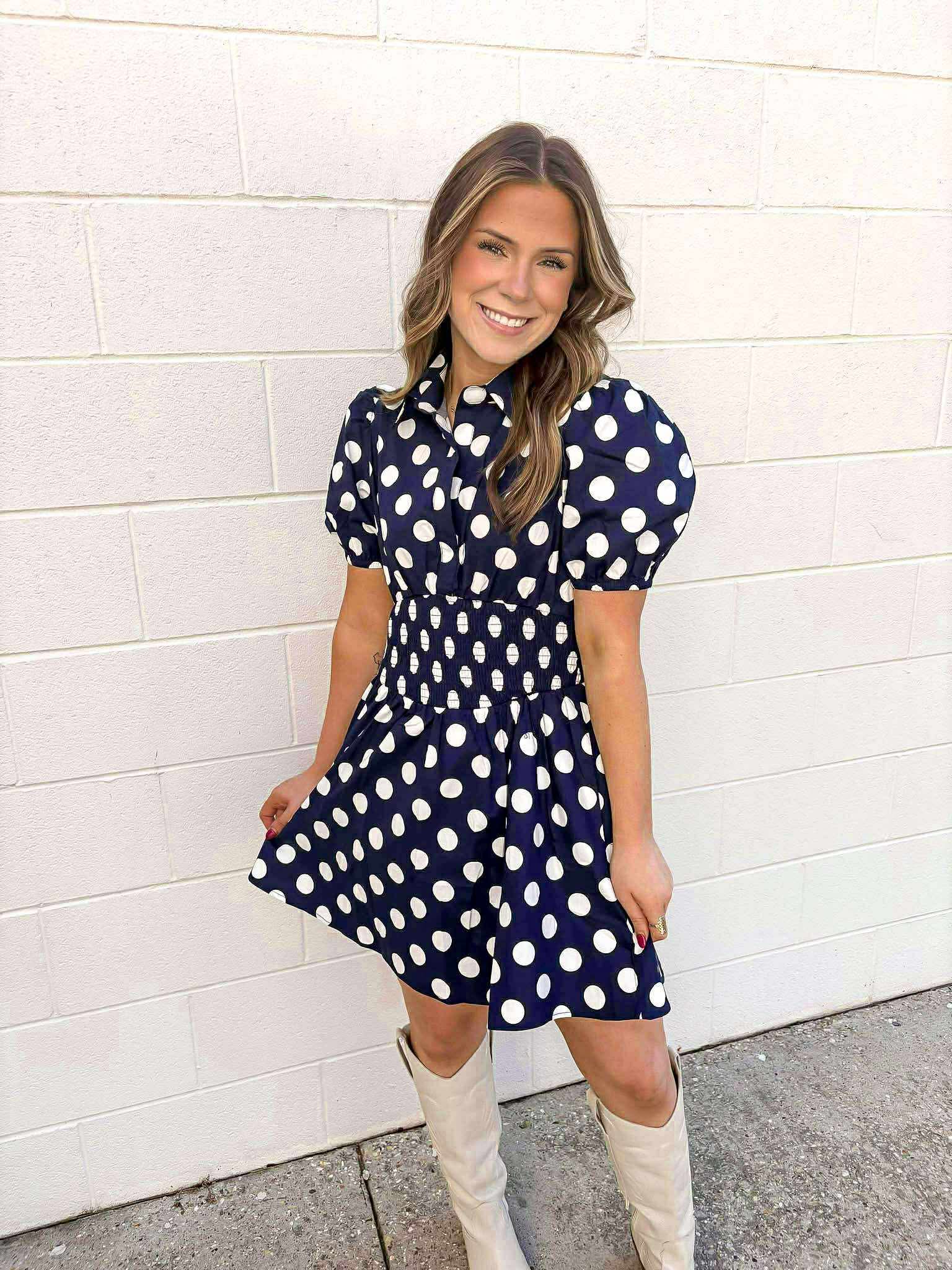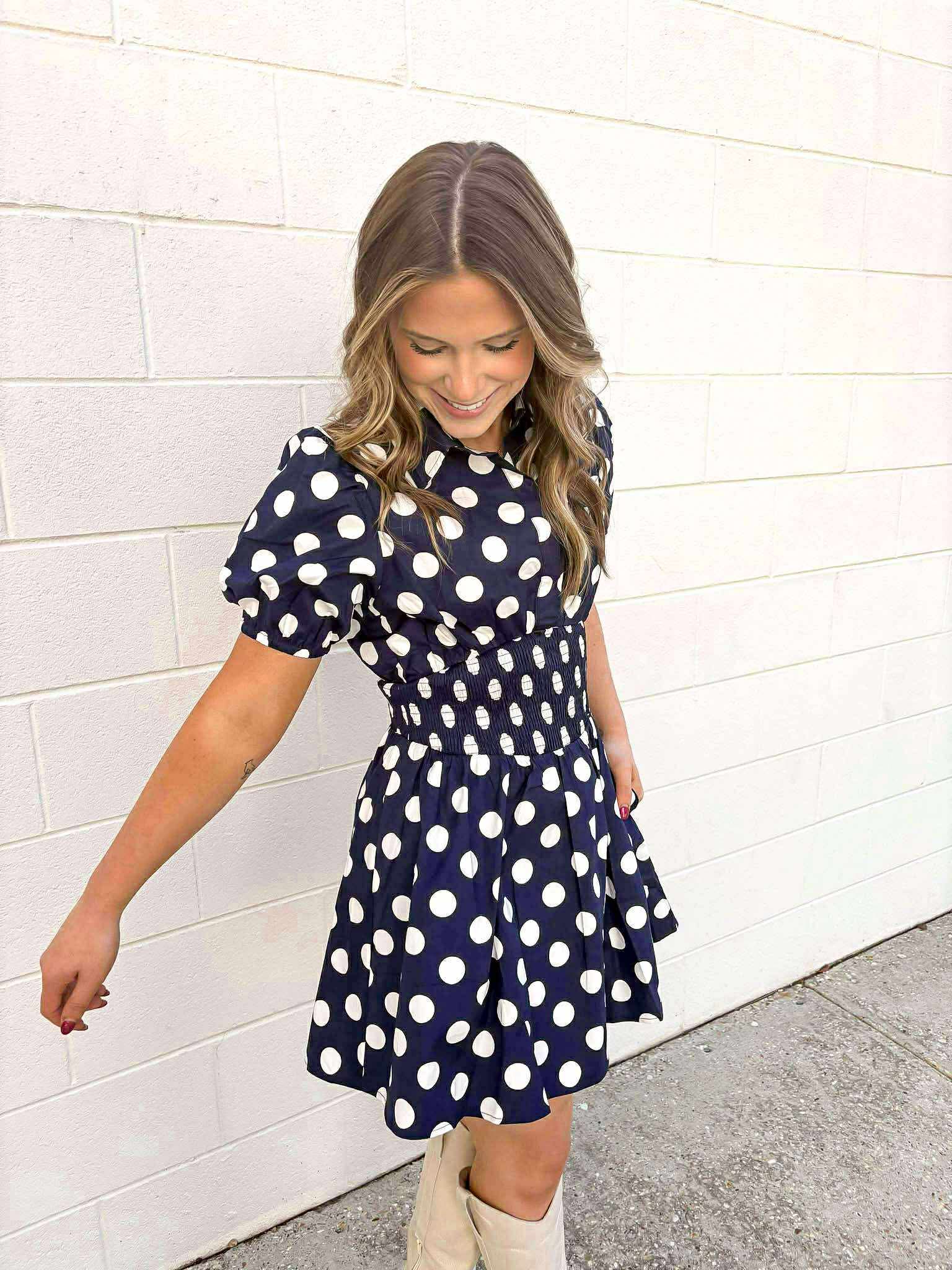Elevate your style with our Trend On The Rise Navy Polka Dot Dress. This maxi dress features playful polka dots that add a touch of fun to your look. Its flowy silhouette is perfect for any occasion, making you feel confident and stylish. Turn heads with this statement piece!
