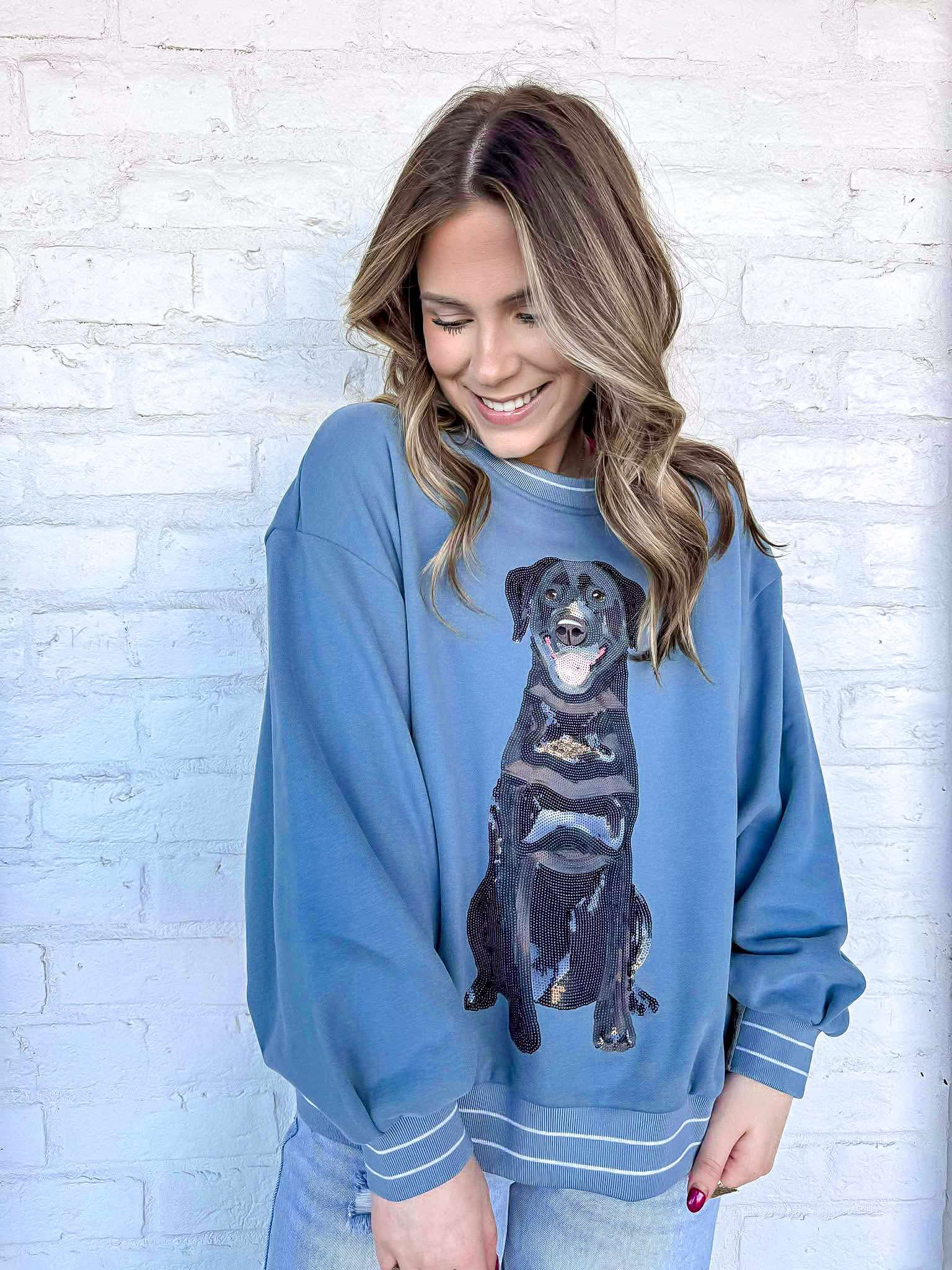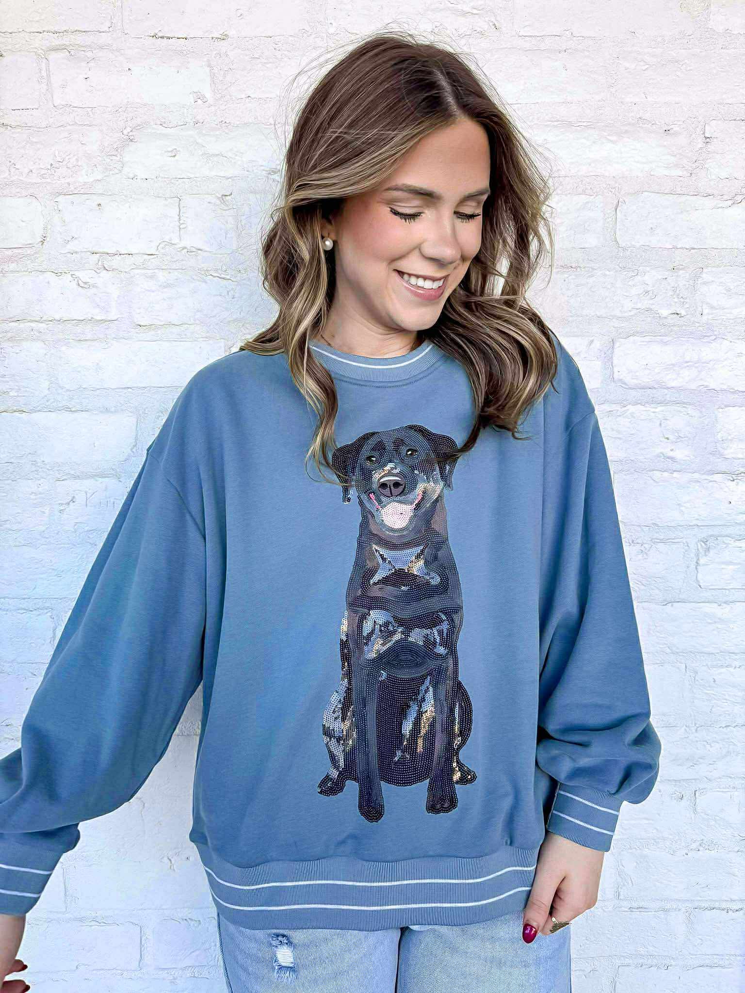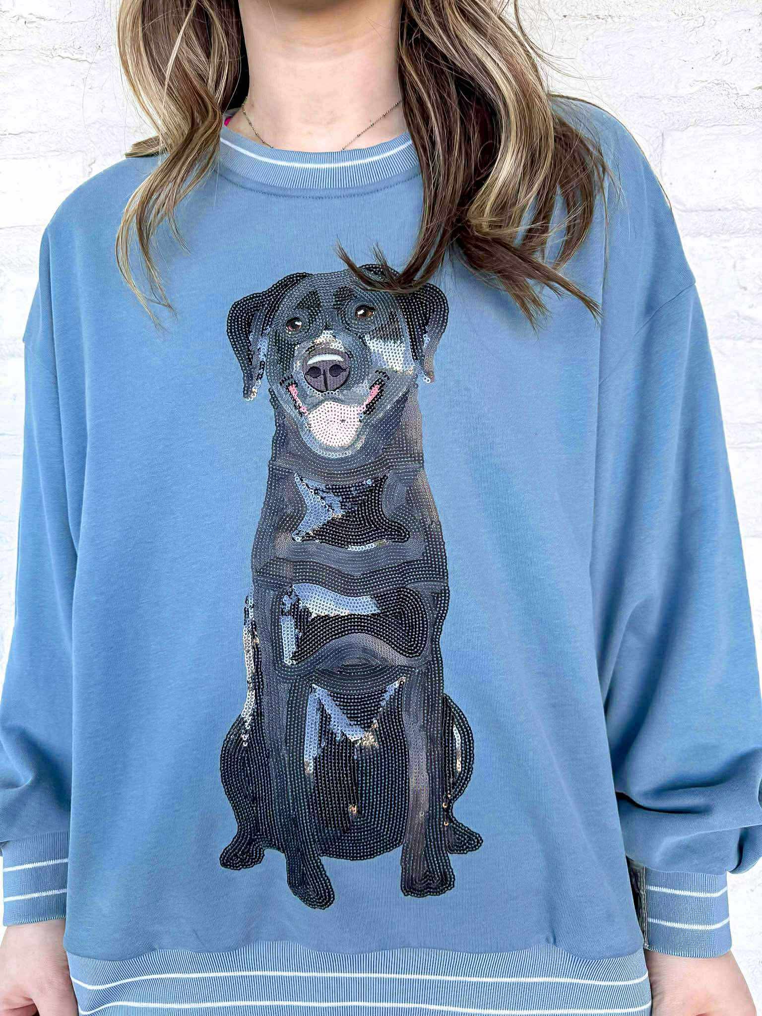 "Show off your love for black labs with our Queen Of Sparkles Dusty Blue Black Lab Sweatshirt. This cozy sweatshirt is perfect for any black lab owner or lover, providing both style and comfort. Embrace your passion for these lovable companions in a subtle and fashionable way."
