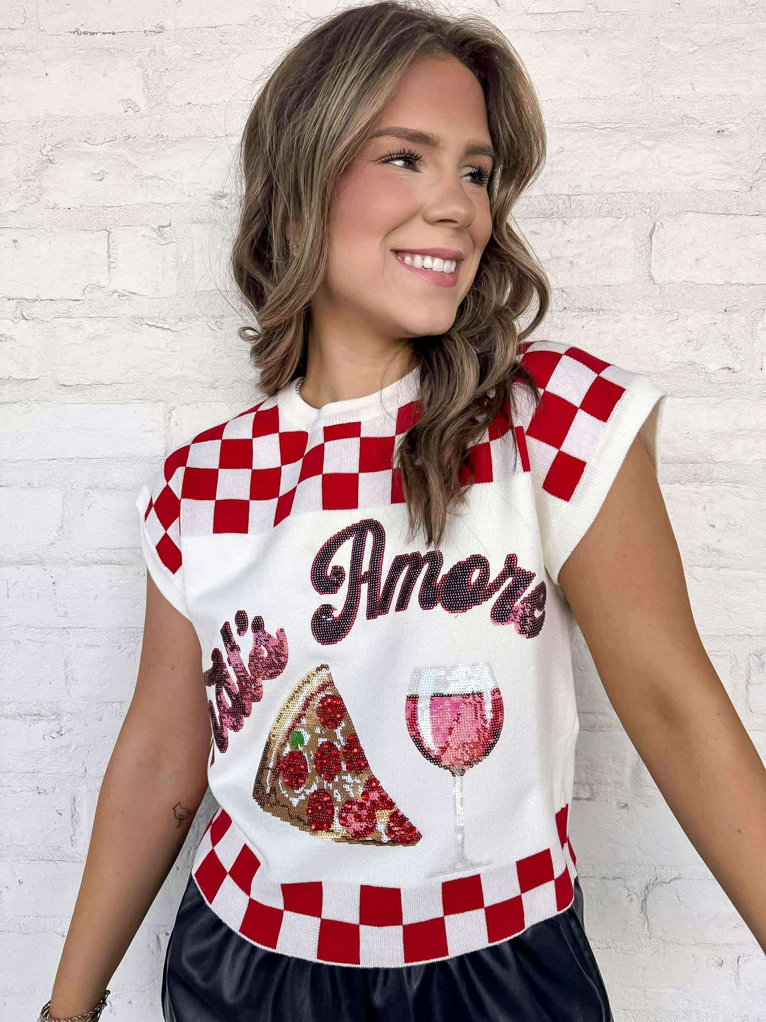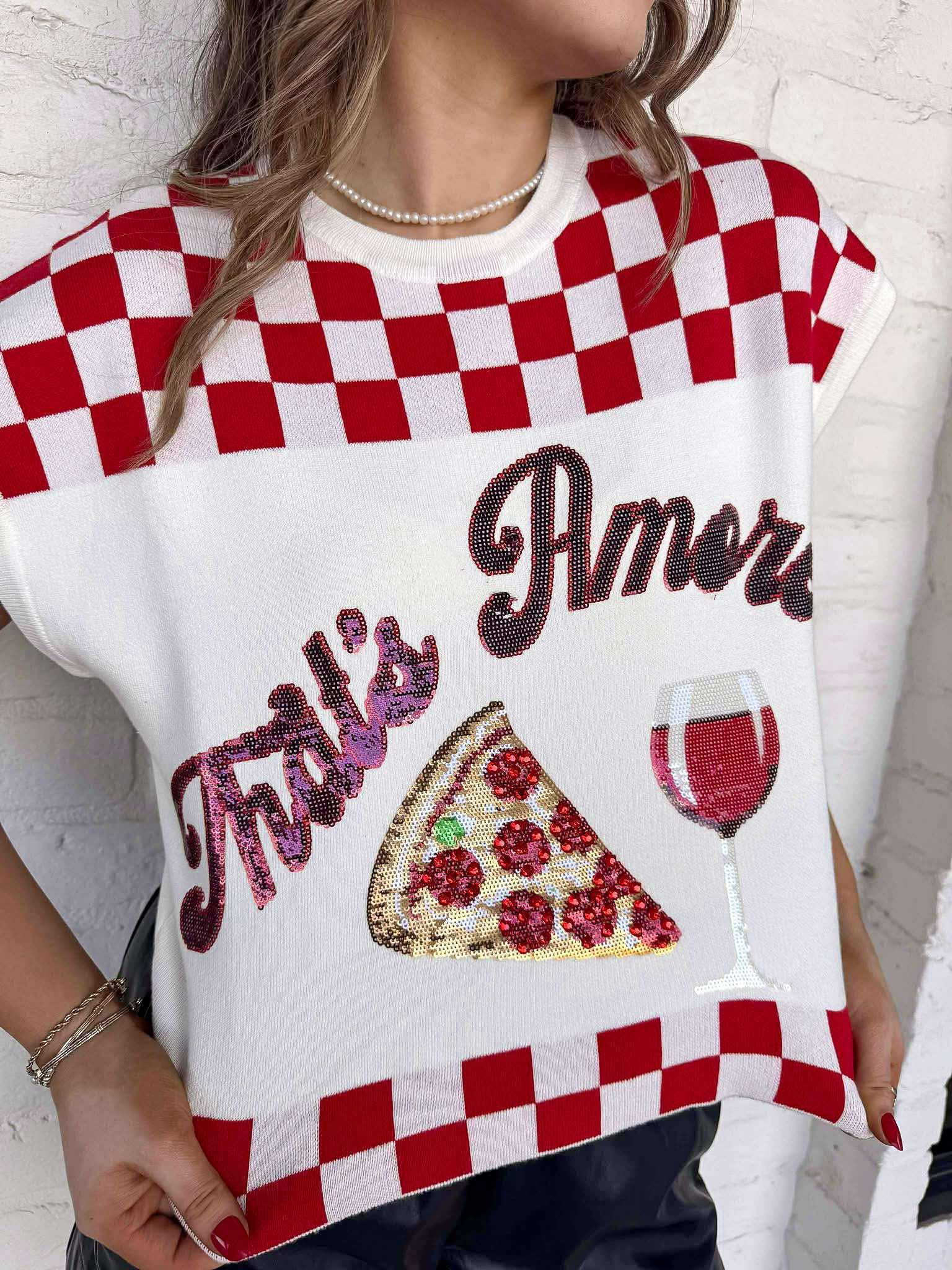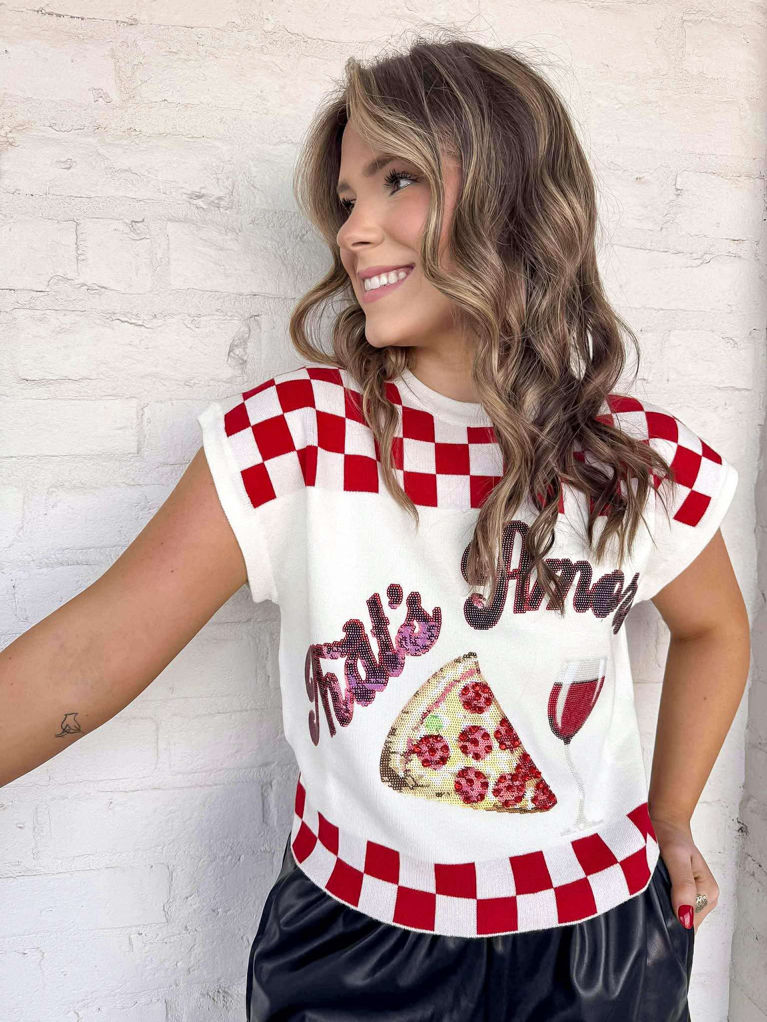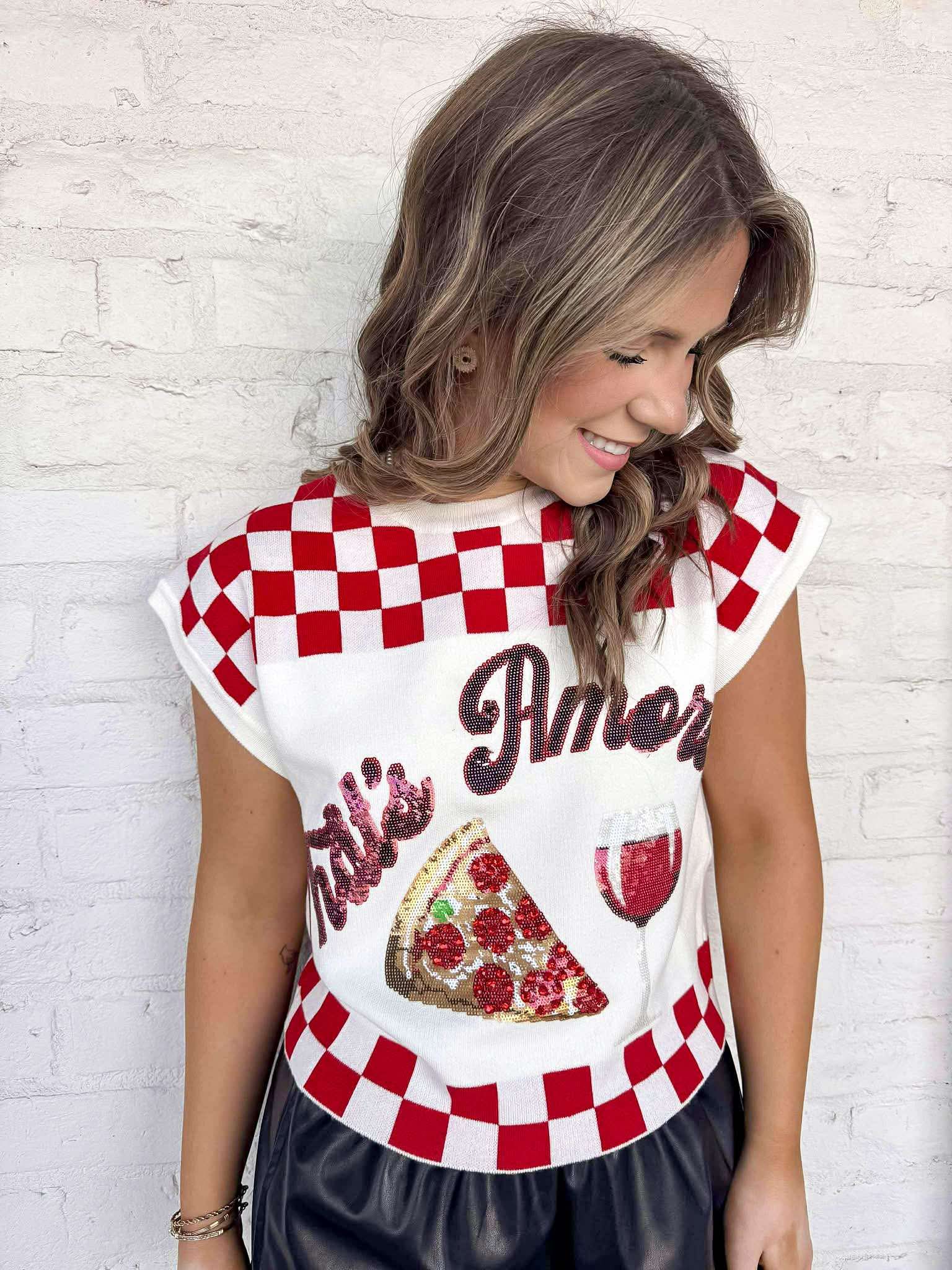 Get cozy and stylish with our Queen Of Sparkles White & Red Checkered ‘That’s Amore’ Too Pizza and Wine Sweater! Made for pizza and wine nights or any casual outing, this sweater will keep you warm and fashionable. Perfect for anyone who loves to indulge in their favorite comfort food and drink.