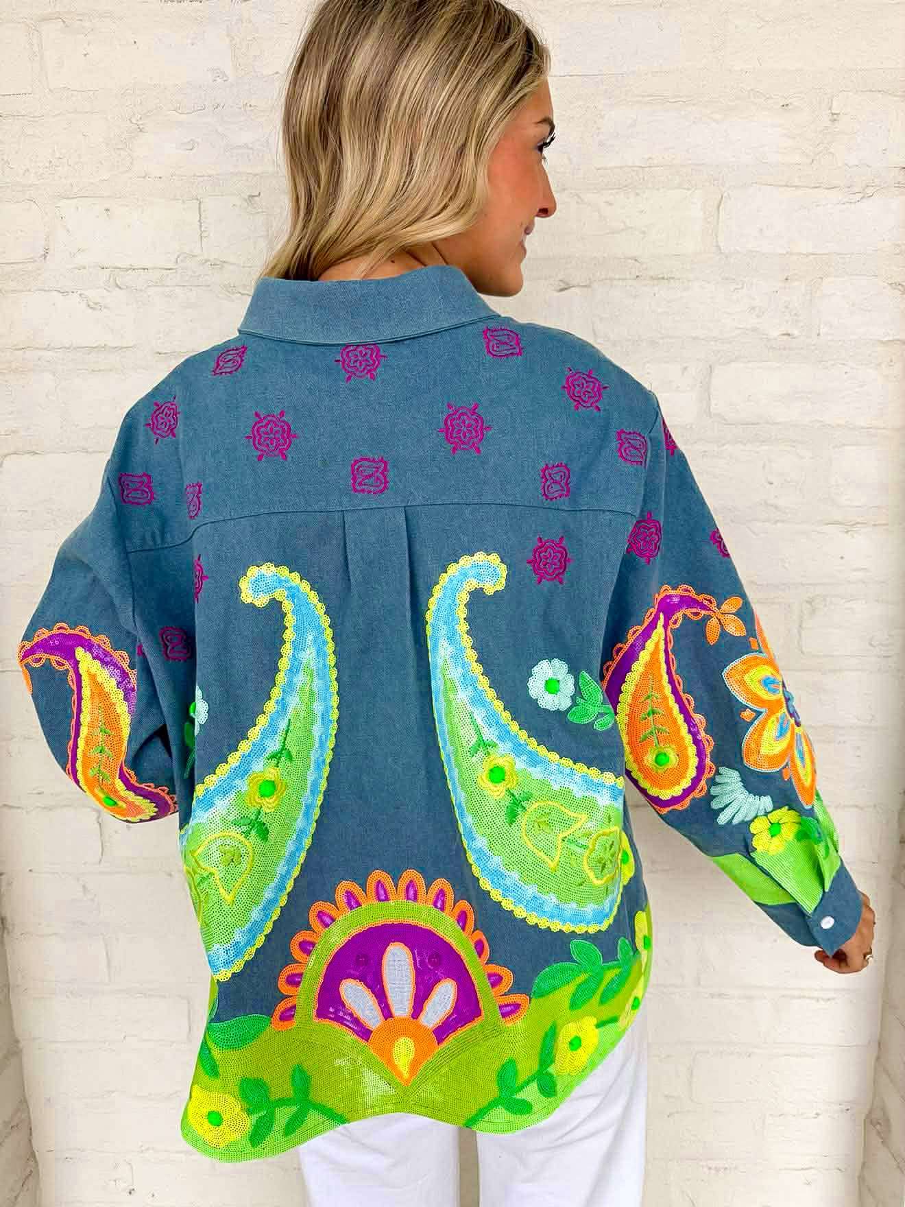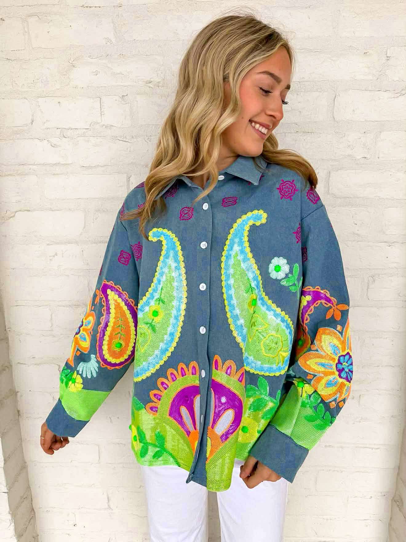Elevate your wardrobe with the Queen Of Sparkles Denim & Neon Paisley Print Button Up Long Sleeve shirt! Infused with a vibrant rodeo theme, this shirt captures the spirit of adventure and fun. Embrace your bold side and make a statement wherever you go!