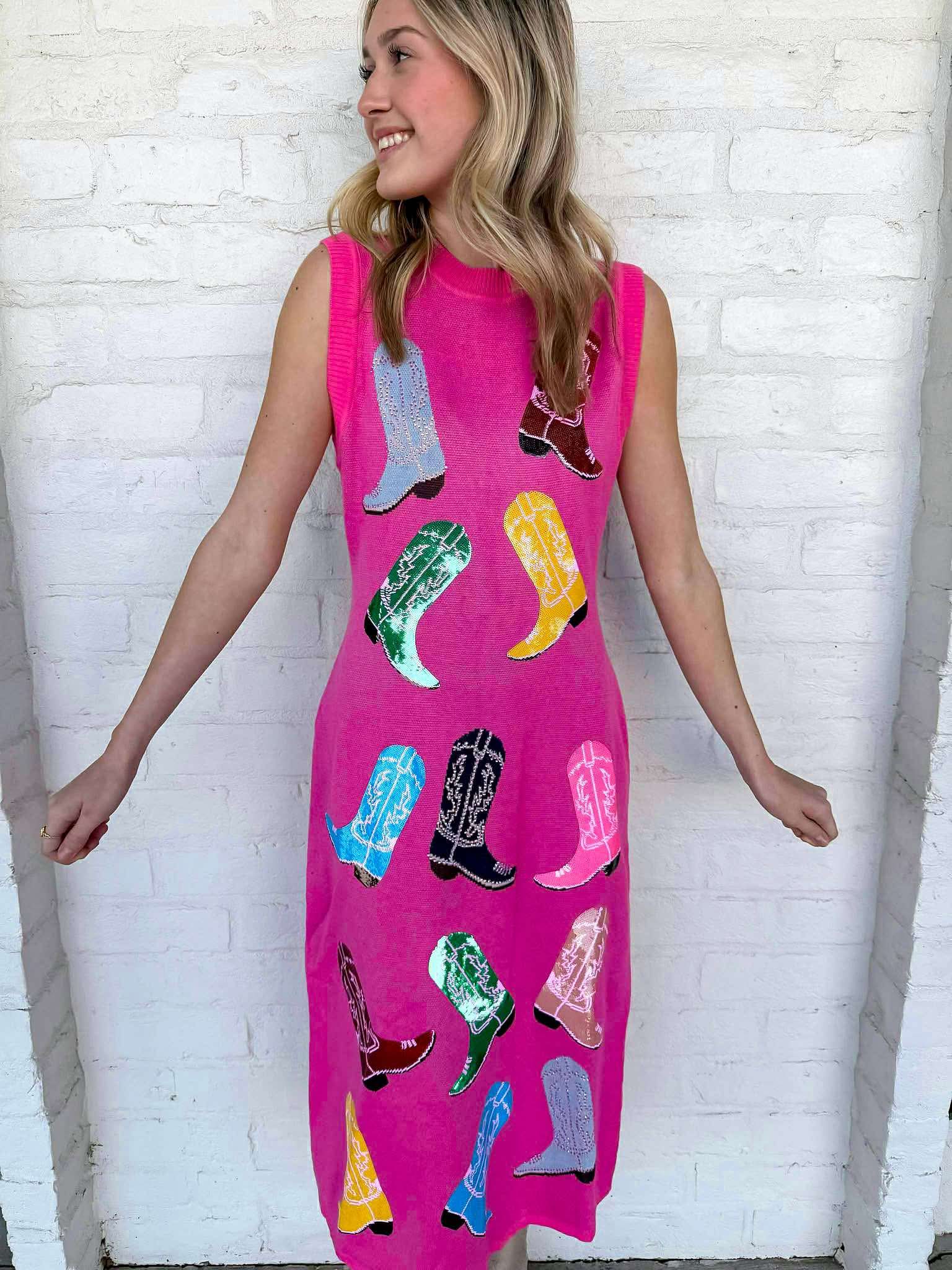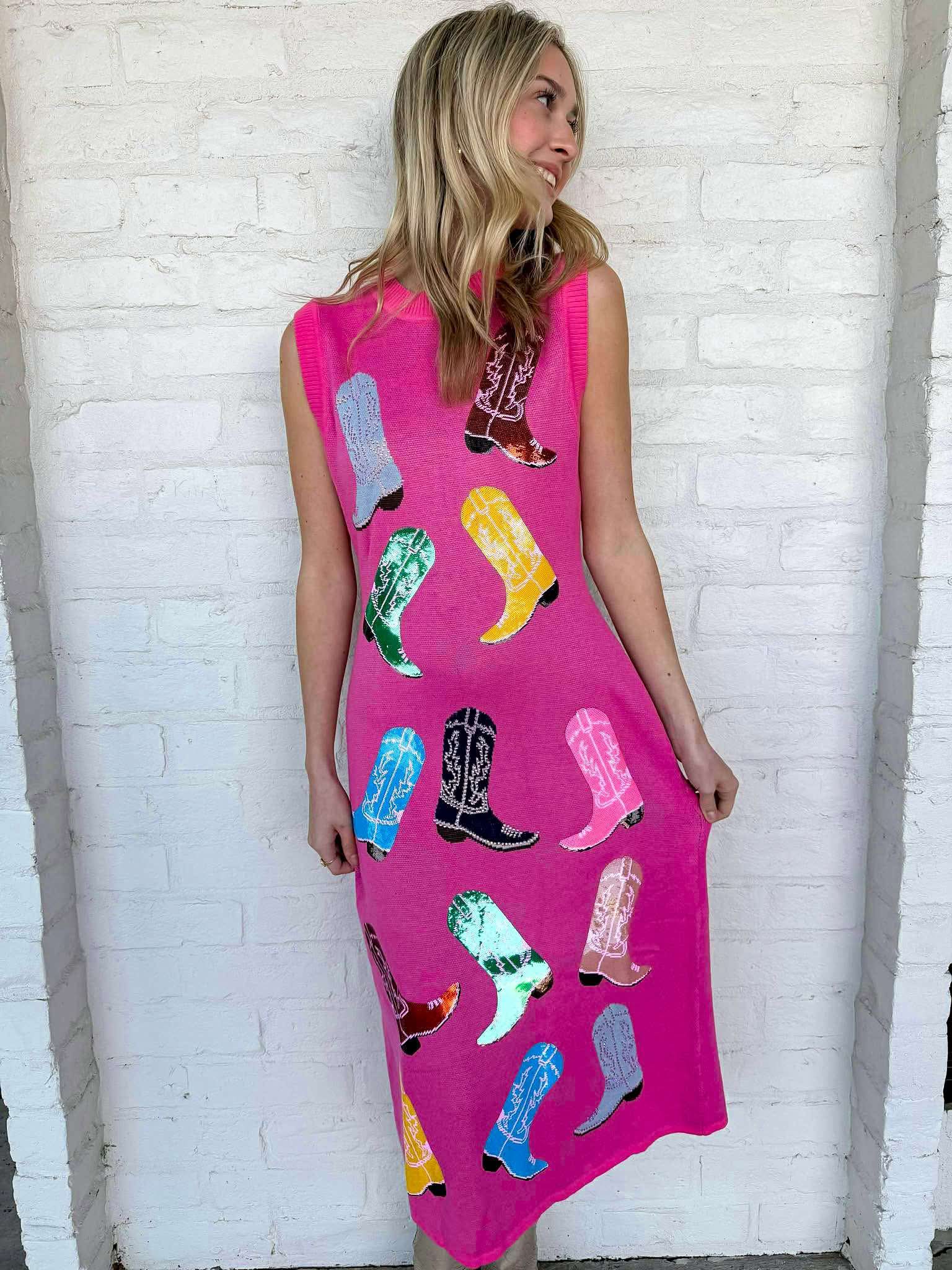 Step into a world of fun and flair with the Queen Of Sparkles Pink Knit Cowboy Boot Tank Midi Dress! Adorned with a vibrant, multi-color rodeo theme, this dress captures the adventurous spirit of the Wild West. Embrace your inner cowgirl and turn heads wherever you go!