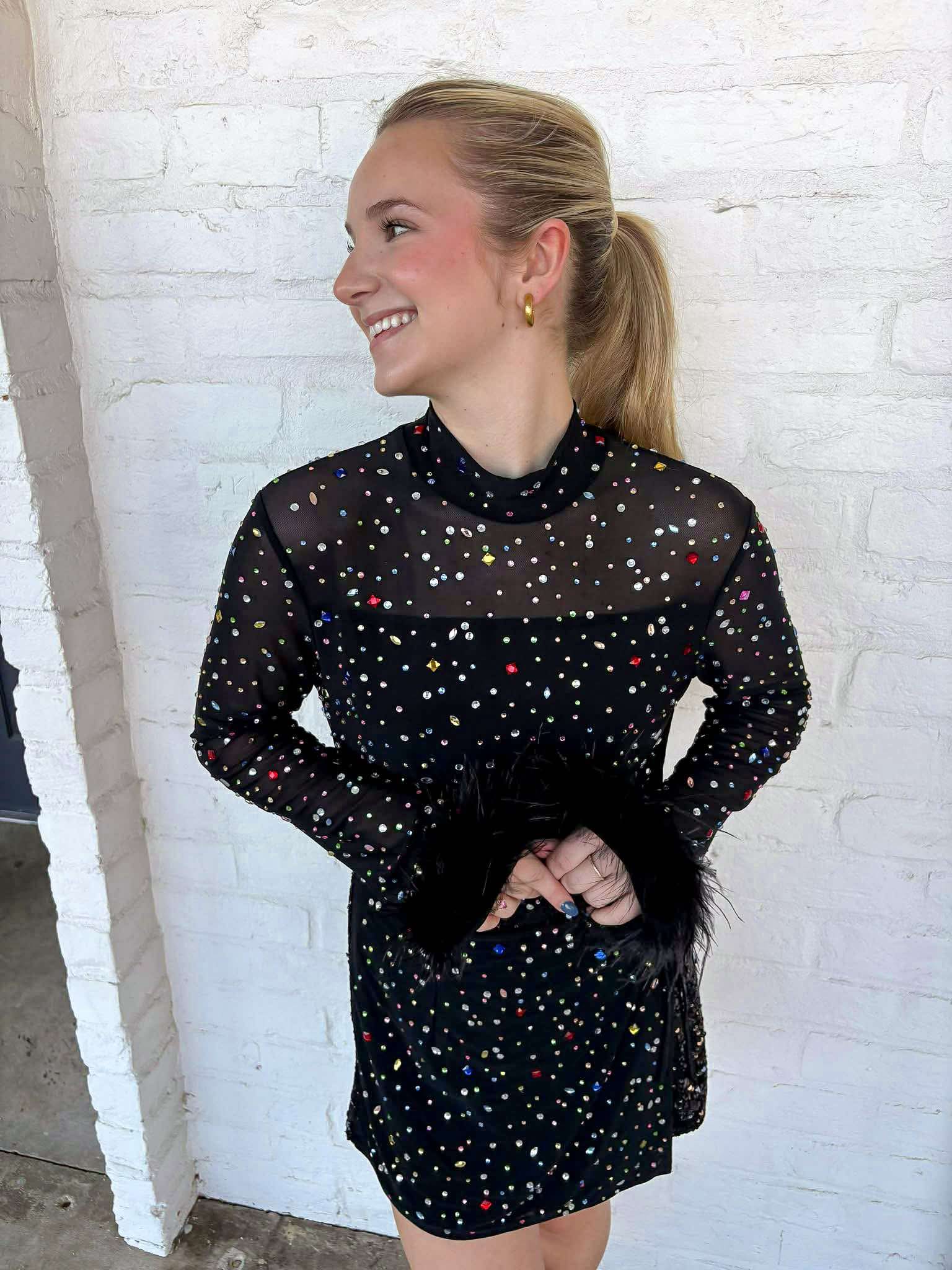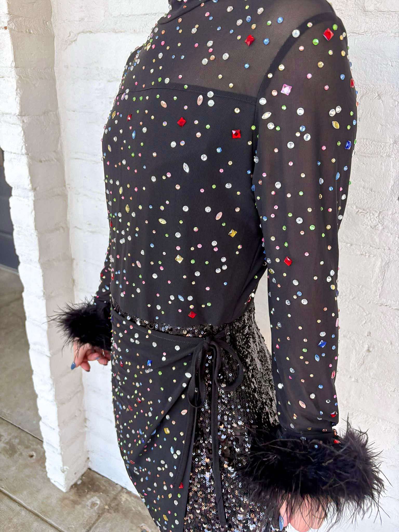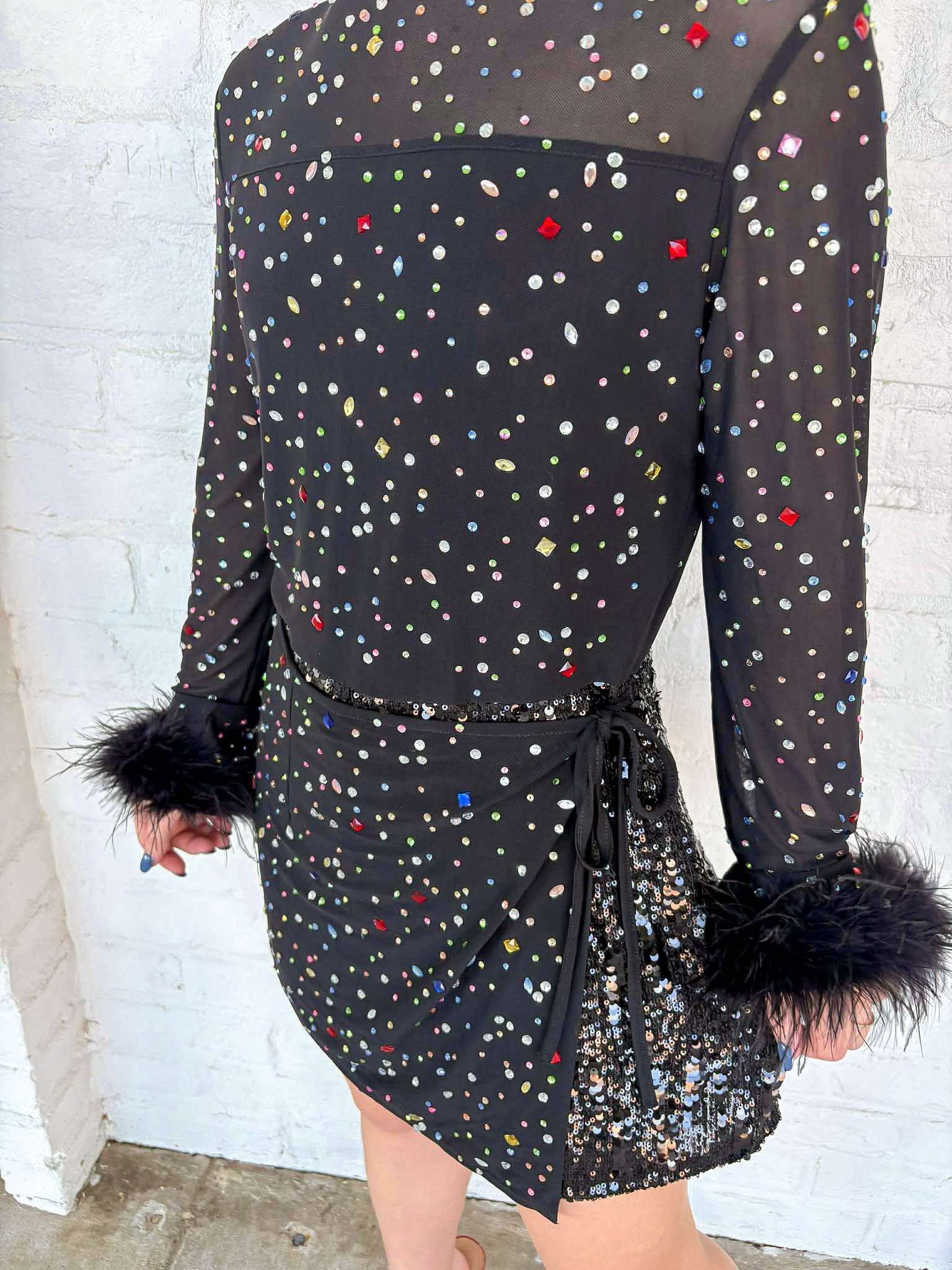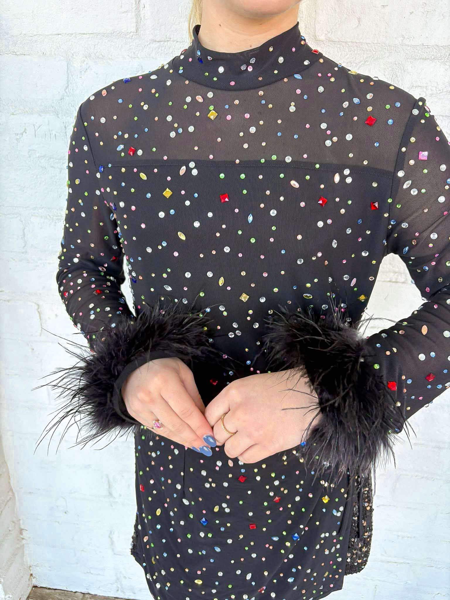 Queen Of Sparkles Black Feather Multi Rhinestone Sequin Romper