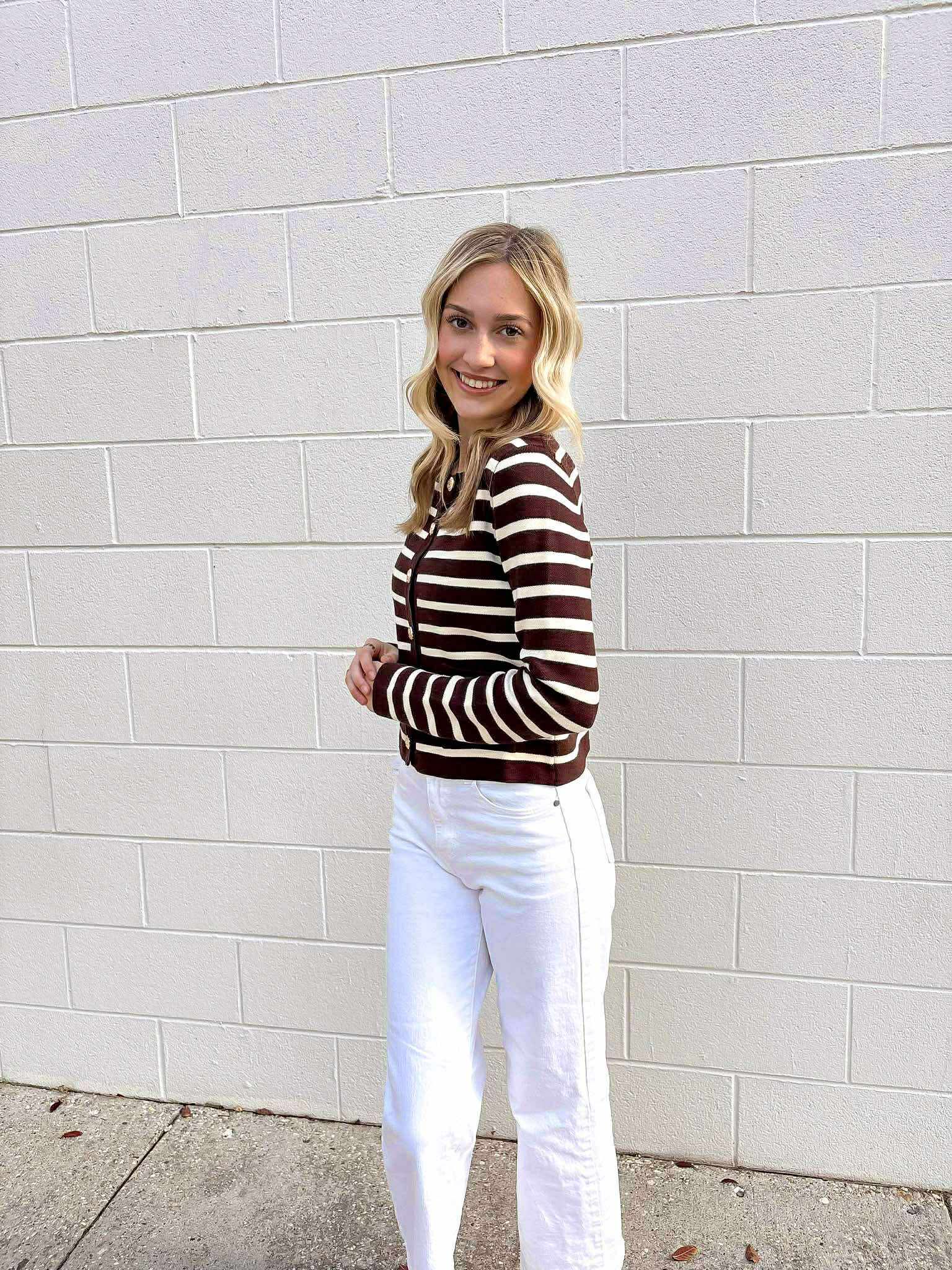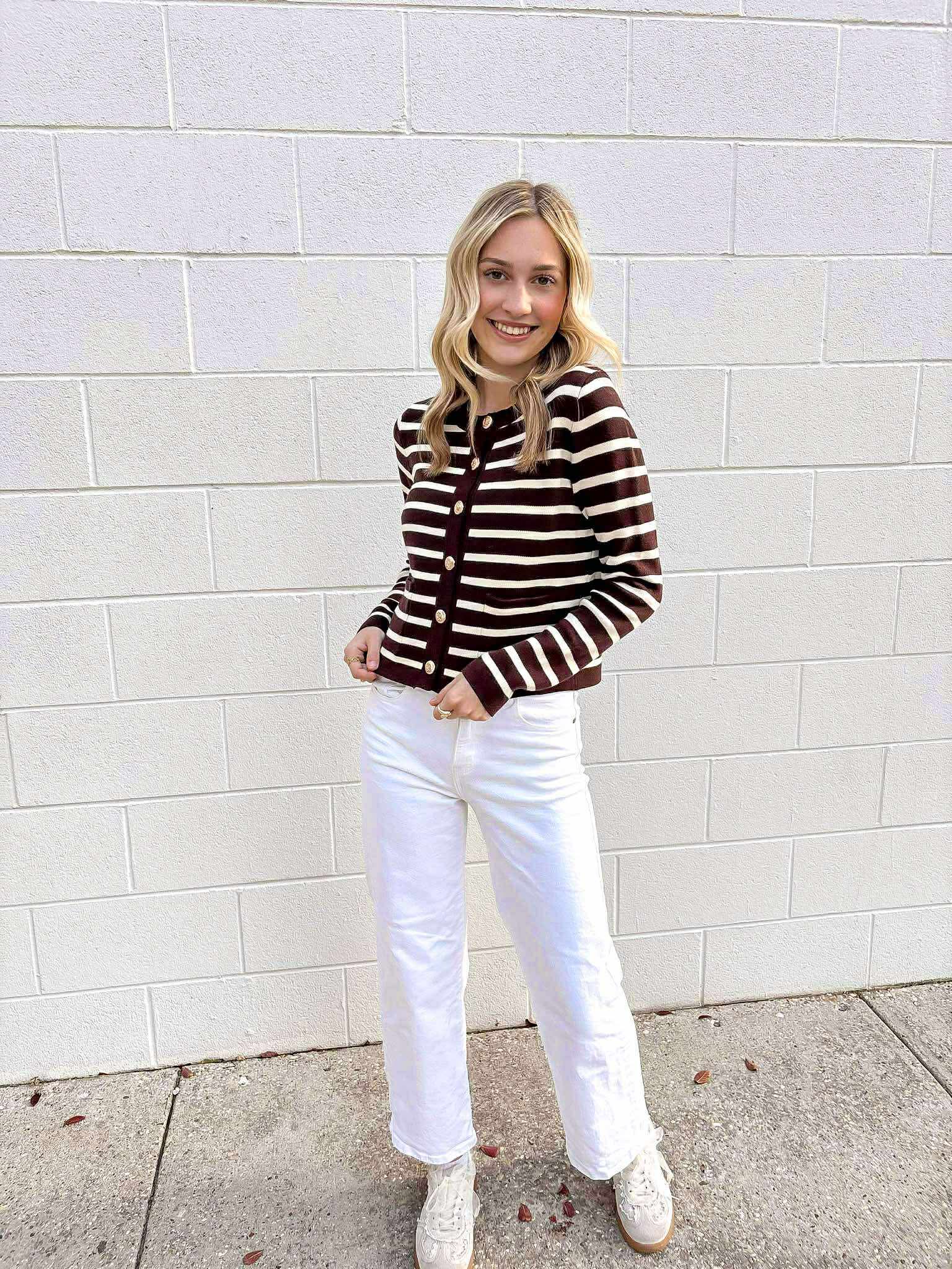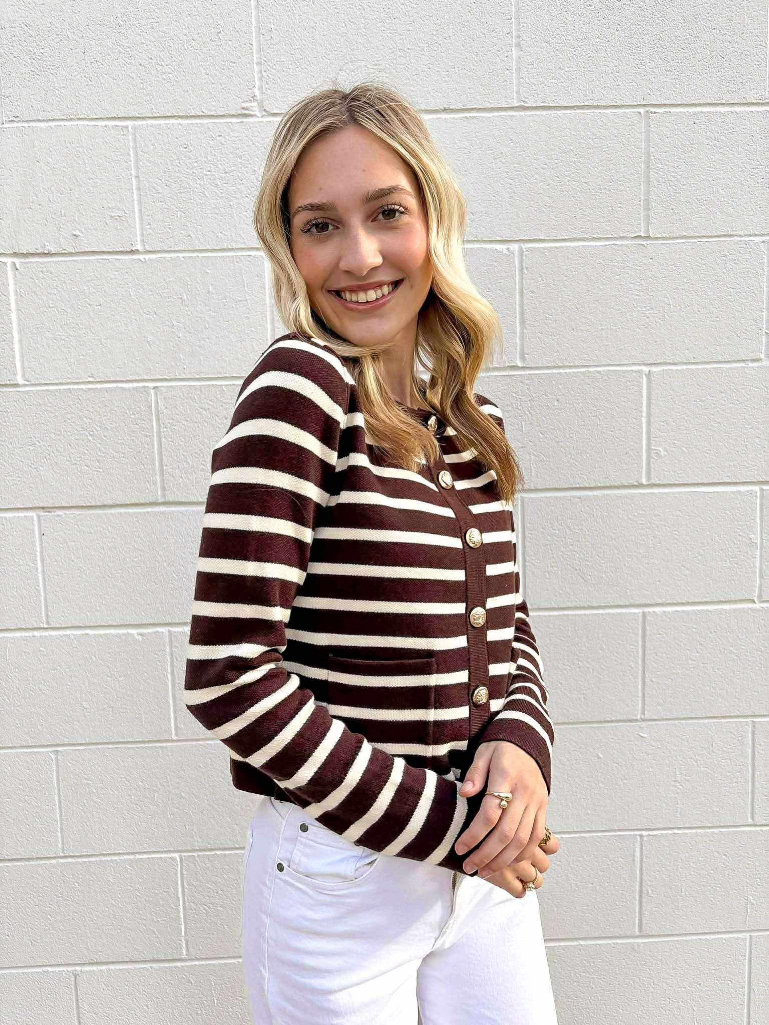Wrap yourself in style with our Beyond Me Cardigan Top! This striped gold button down cardigan features a unique pocket detail that will add a touch of elegance to any outfit. Stay warm and chic with this must-have addition to your wardrobe.