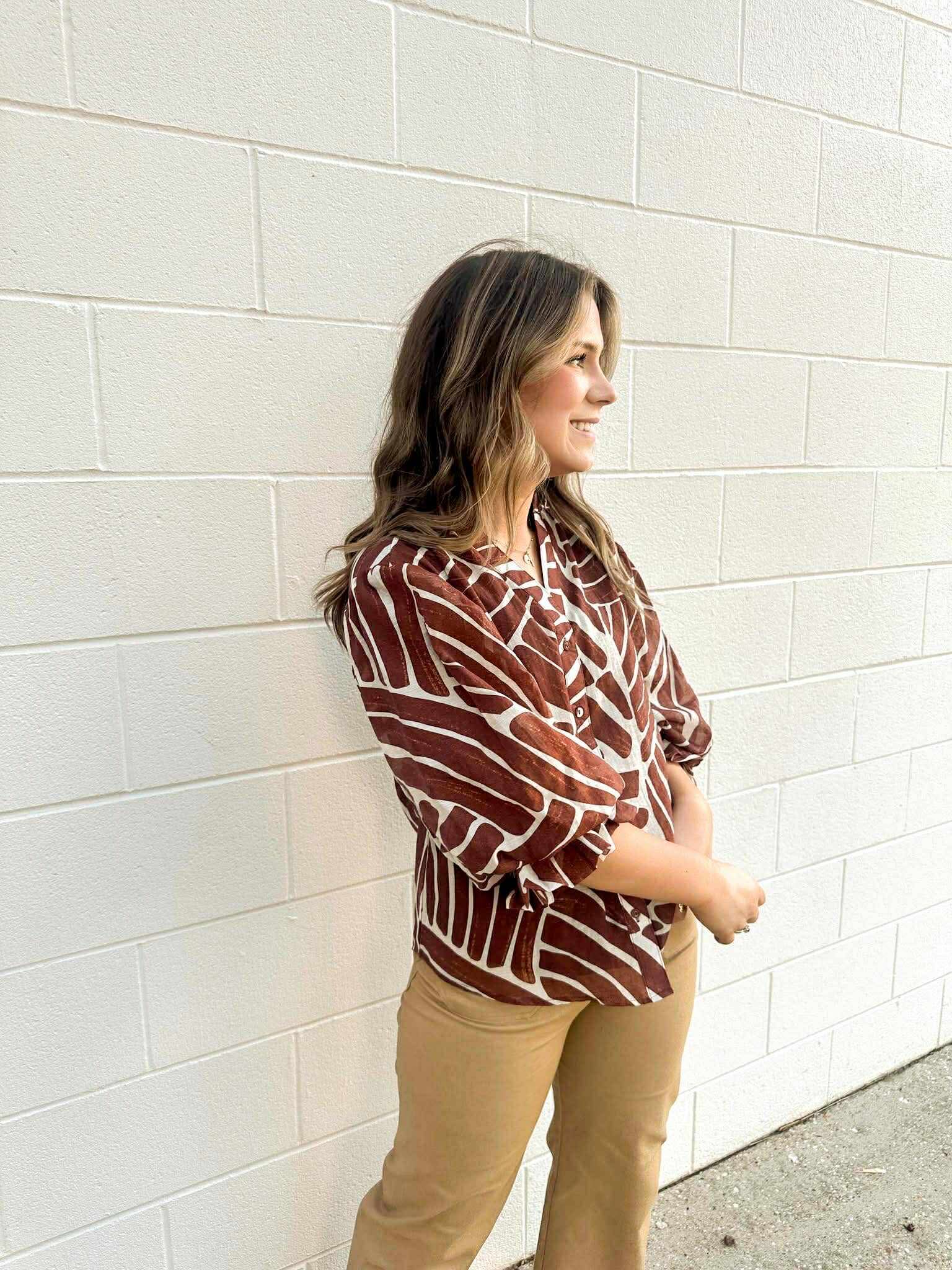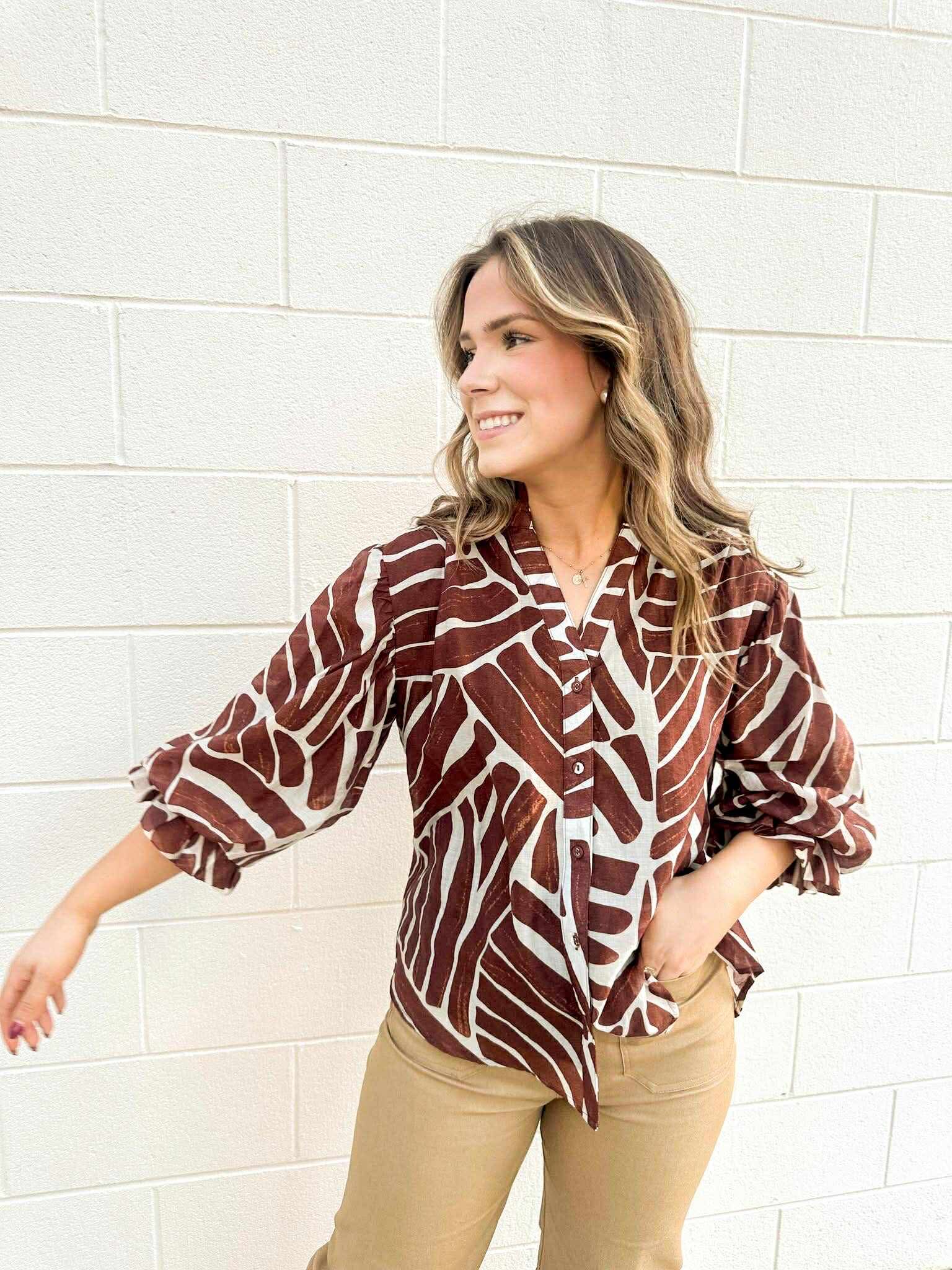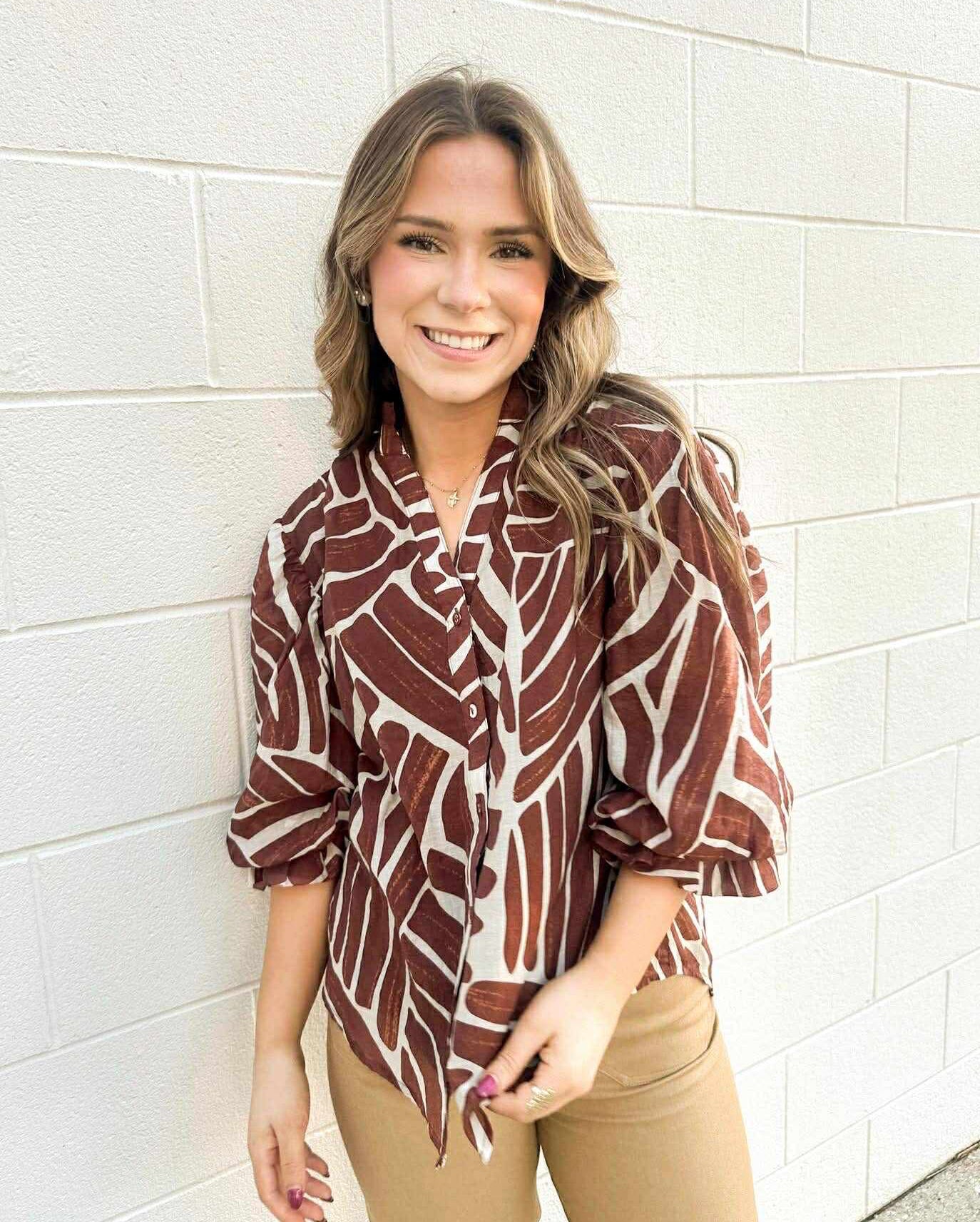 Elevate your style with the Burn It Down Umber Mix Top! This button down features a stunning abstract print that will make you stand out from the crowd. Perfect for adding a touch of modern flair to any outfit, this top is sure to turn heads and make a statement. Ignite your passion for fashion and set your wardrobe ablaze with this must-have piece!