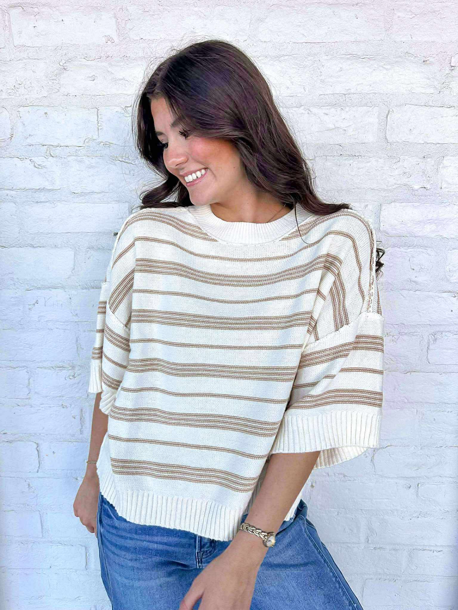 Stylish, versatile, and comfortable, our Hold Onto Me Knit Top is a must-have for any wardrobe. With its drop half sleeves and round neck design, it's perfect for any season. The striped knit sweater fabric adds a touch of texture, while providing an effortless and chic look. Stay fashionable and cozy with this top!