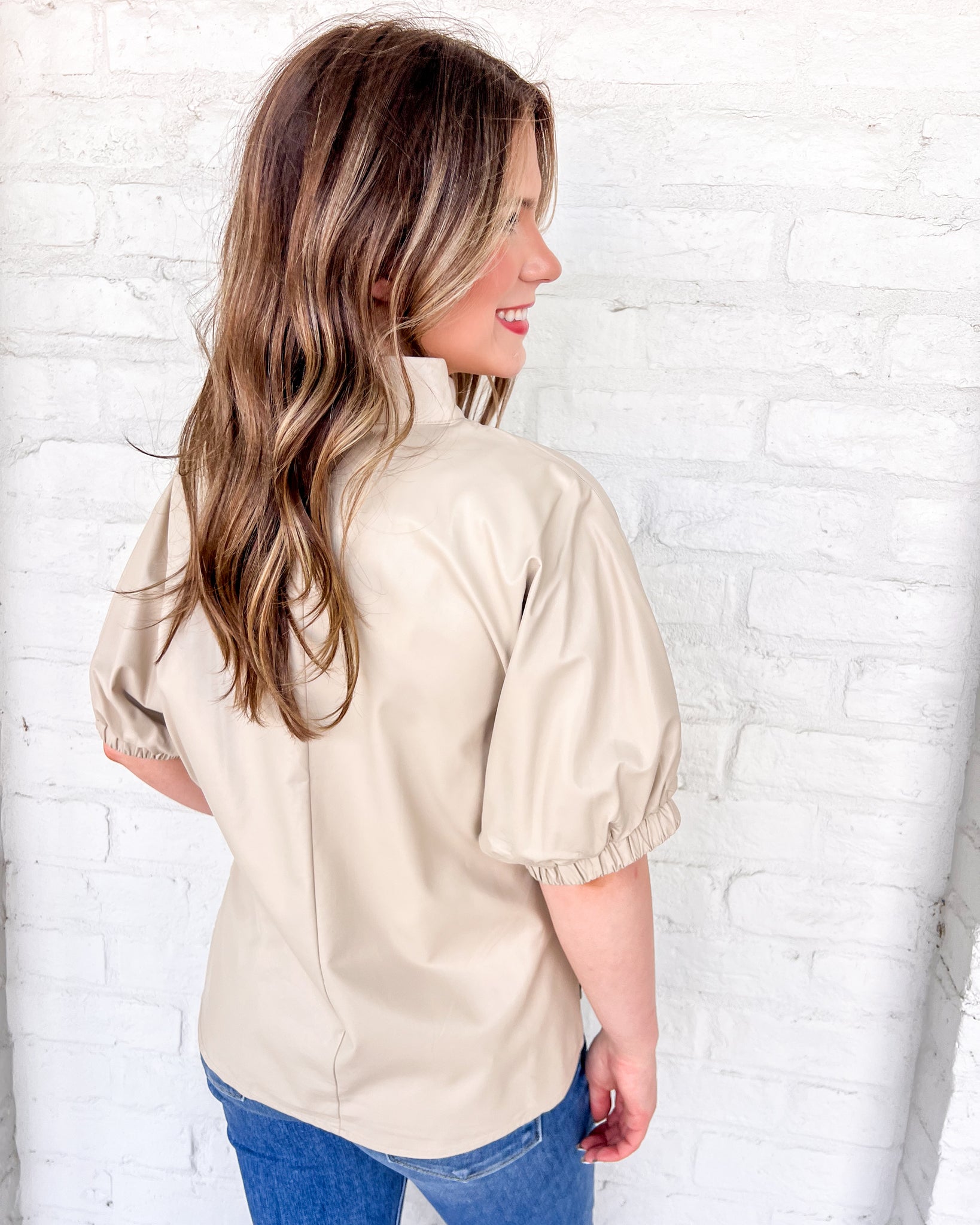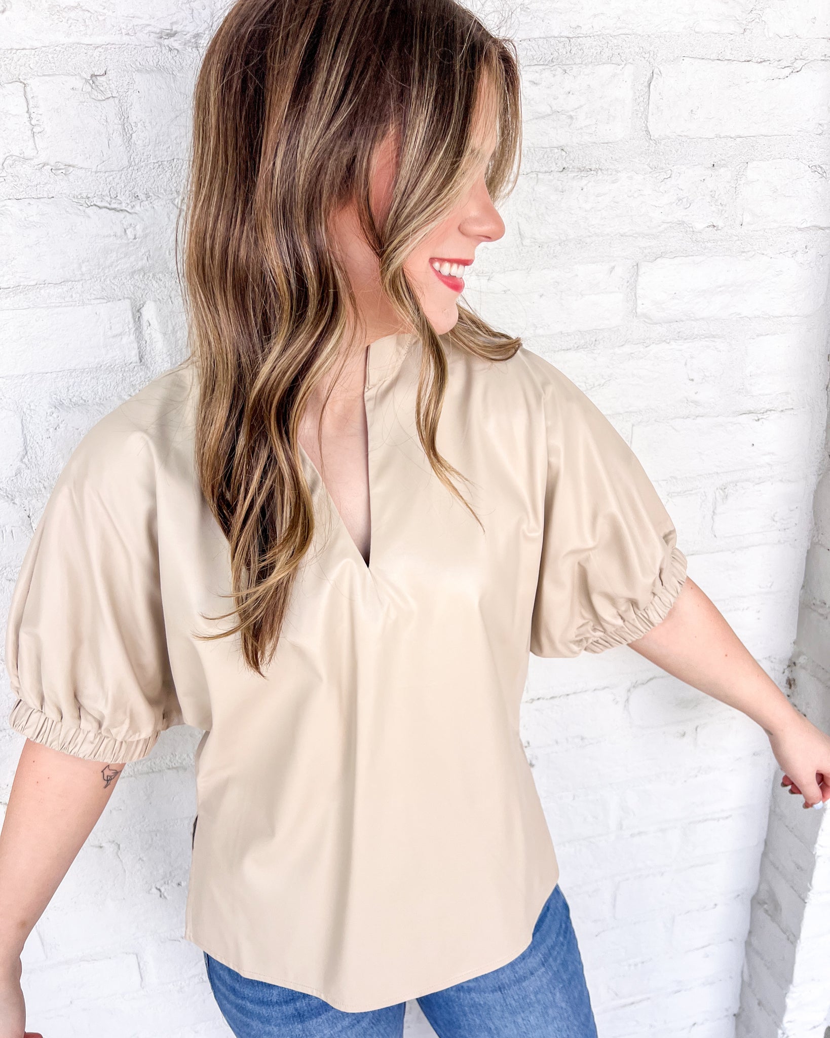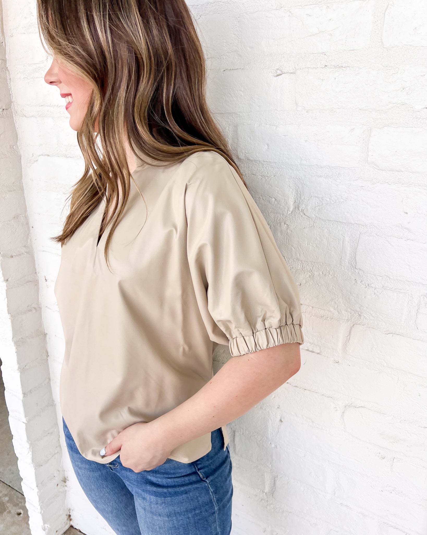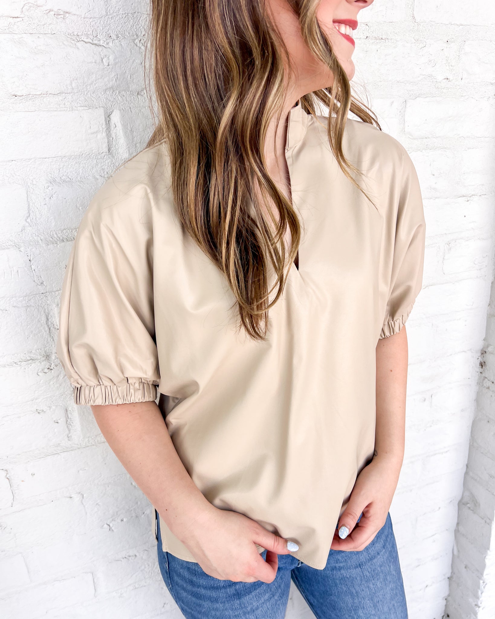 Sleek and sophisticated, the Beige Puff Sleeve Split Neck Blouse is a versatile piece that transitions effortlessly from work to weekend. Designed with a polished split neckline and short puff sleeves with elastic cuffs, this blouse offers a modern twist on a classic neutral. The lightweight fabric drapes beautifully, making it a comfortable yet elevated option for any occasion.