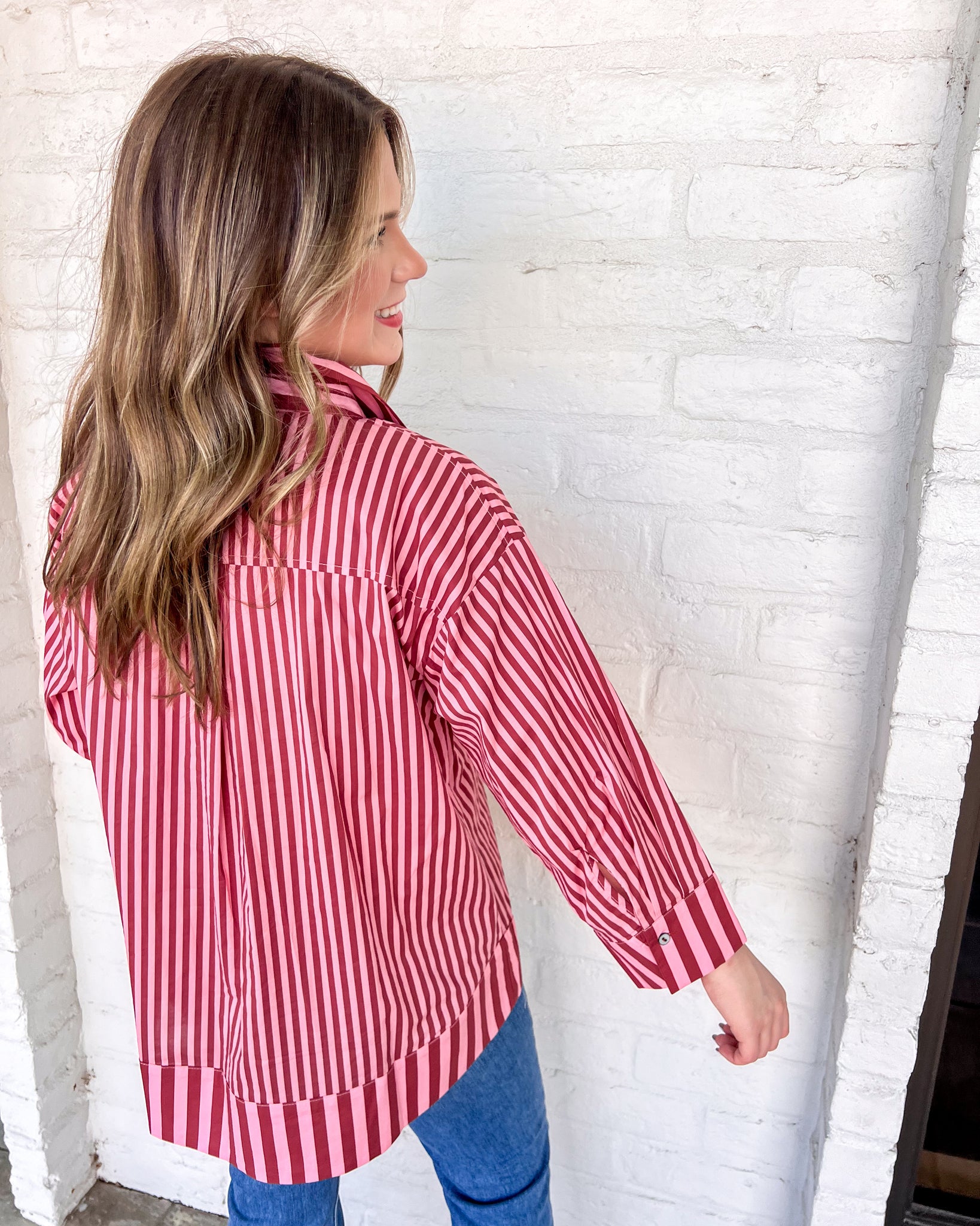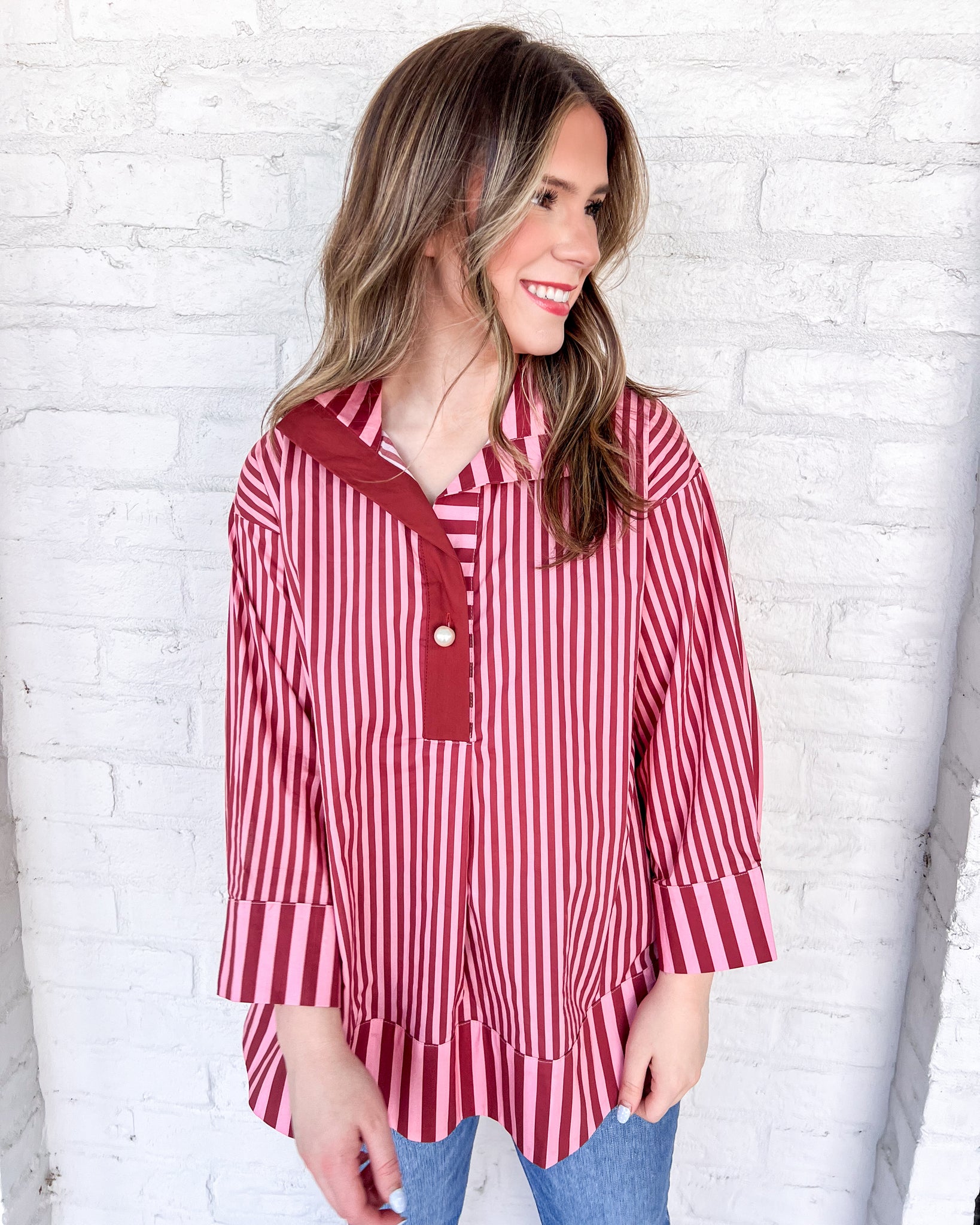 Timeless stripes meet modern flair in the Red Striped Contrast Trim Blouse. Designed with a mix of bold and narrow red stripes, this blouse features a striking contrast placket with pearl button detail and cuffed ¾ sleeves. The relaxed silhouette offers effortless style that works for both casual and dressy occasions.
