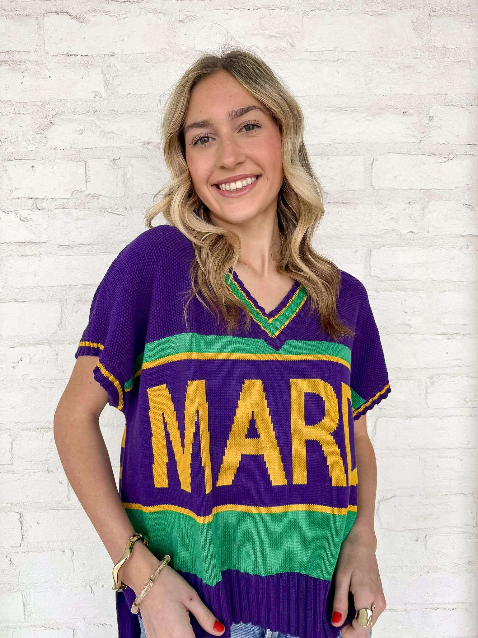 Get in the spirit of Mardi Gras with our Varsity Sweater Top! Featuring the iconic green, purple, and yellow colors, this top is the perfect addition to any festive outfit. Show your love for this celebration with our comfortable and stylish sweater.