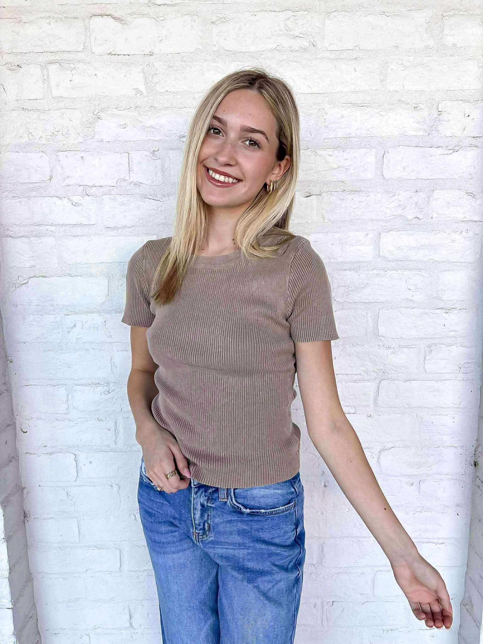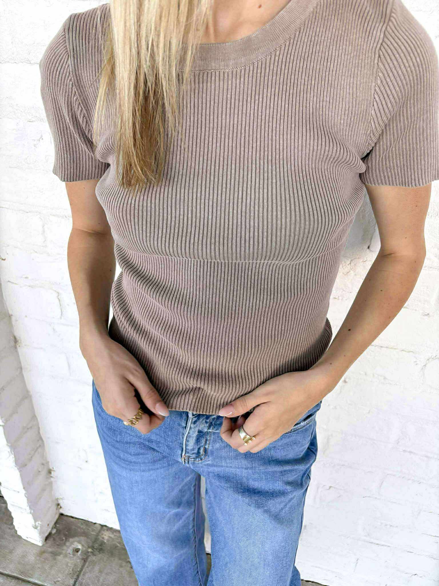 This short sleeve cropped knit tee features a washed ribbed design that adds texture and dimension to your outfit. Perfect for a casual day out or a night on the town, this tee is versatile and effortlessly stylish. Comfortable and chic, it's a must-have addition to any wardrobe.