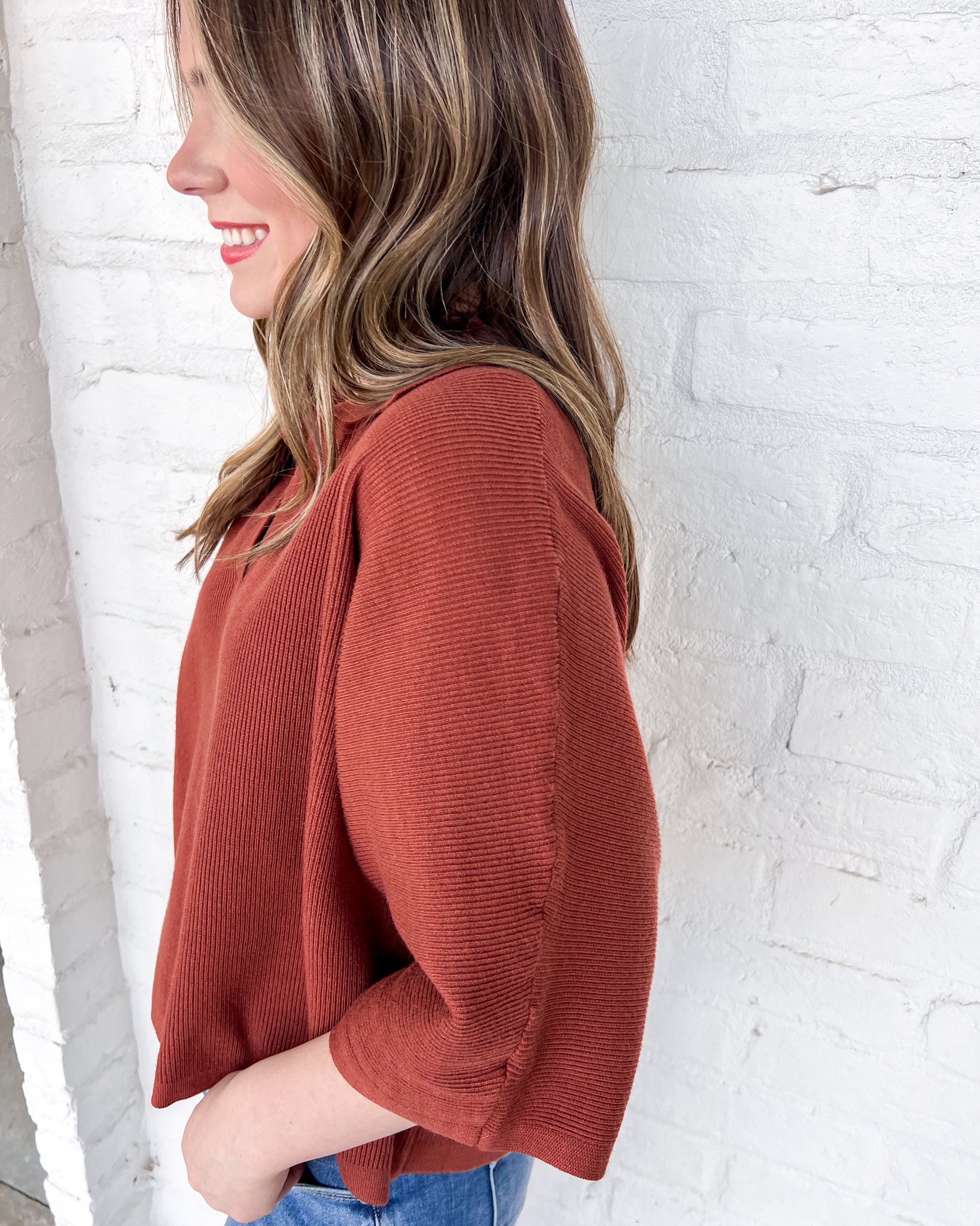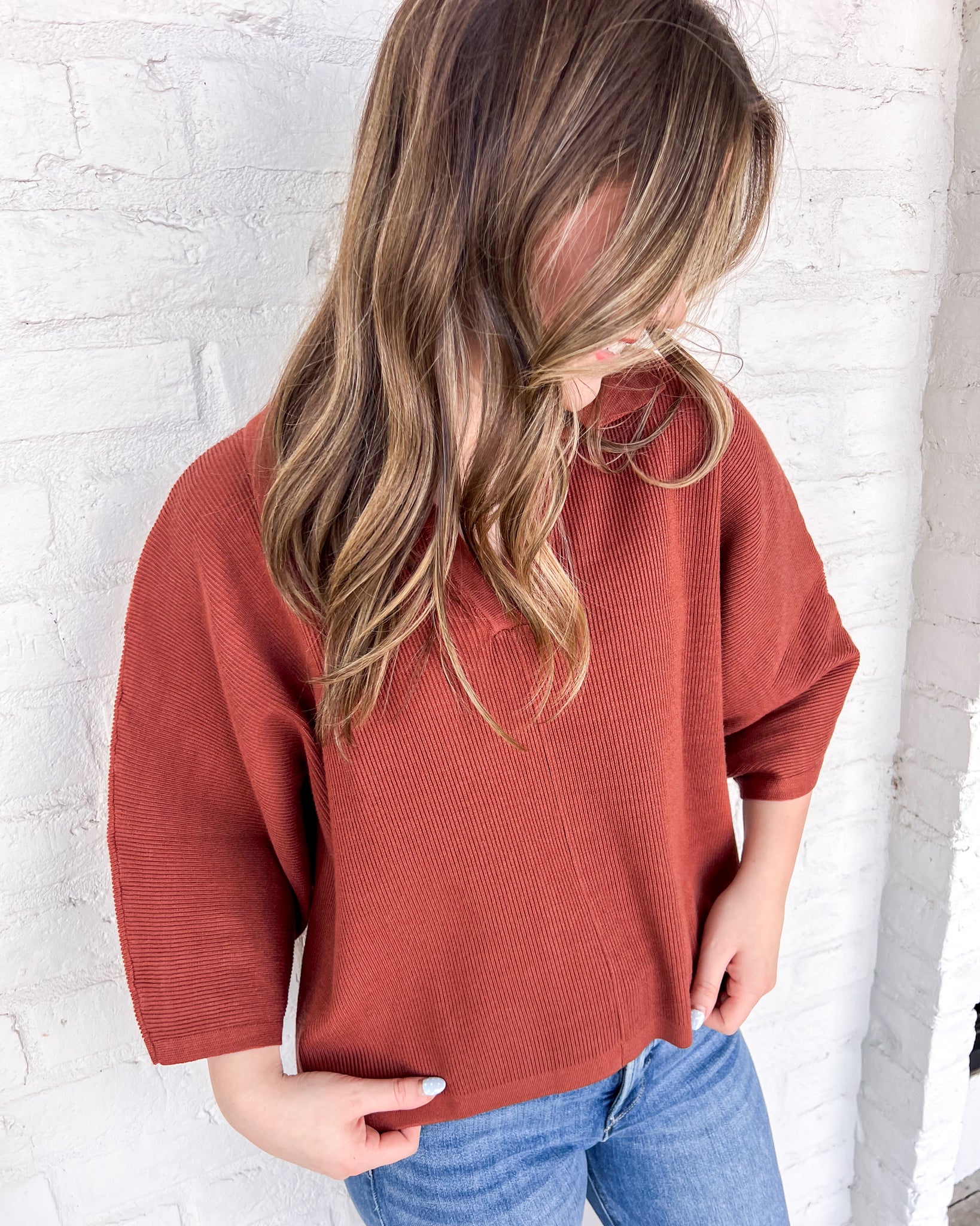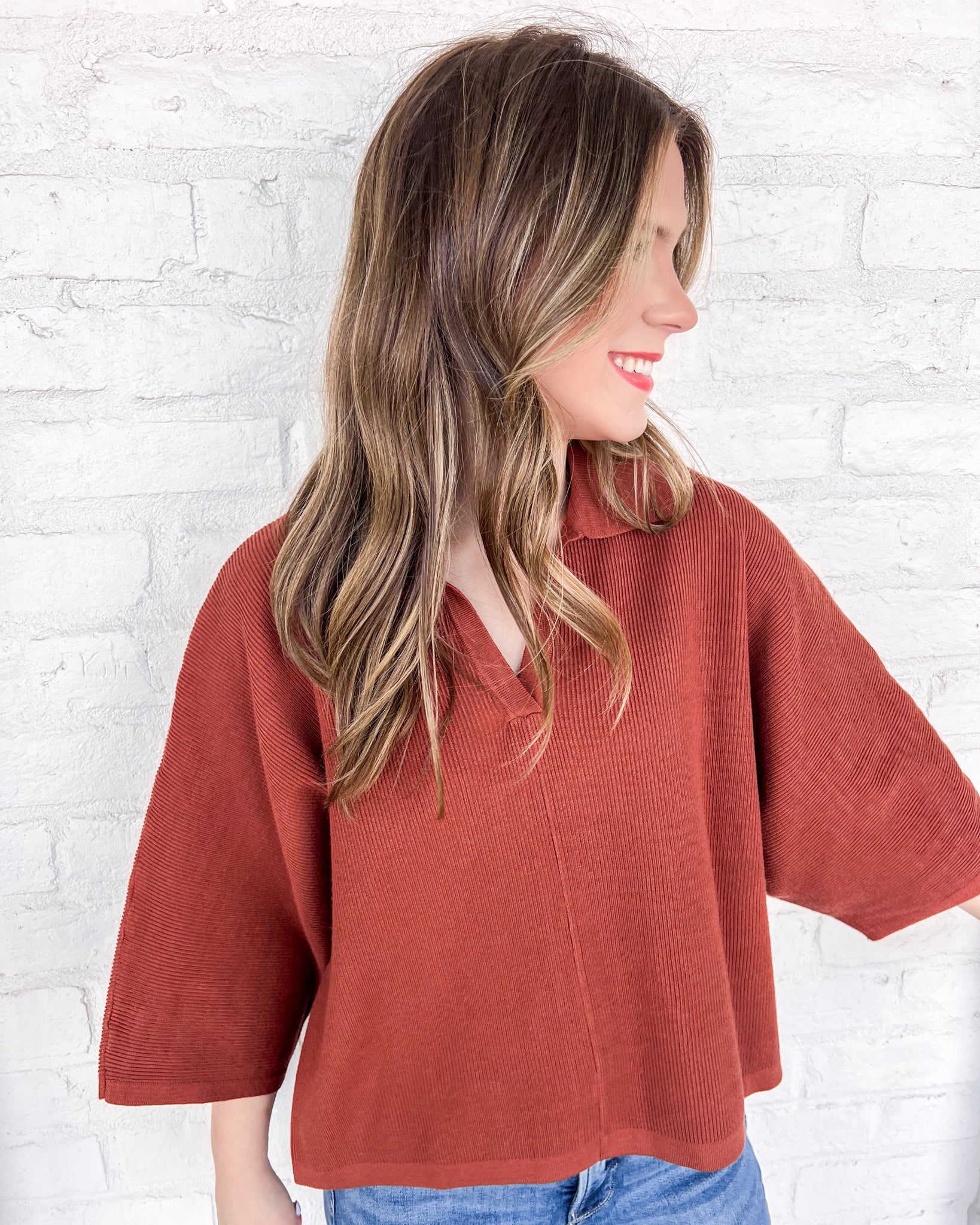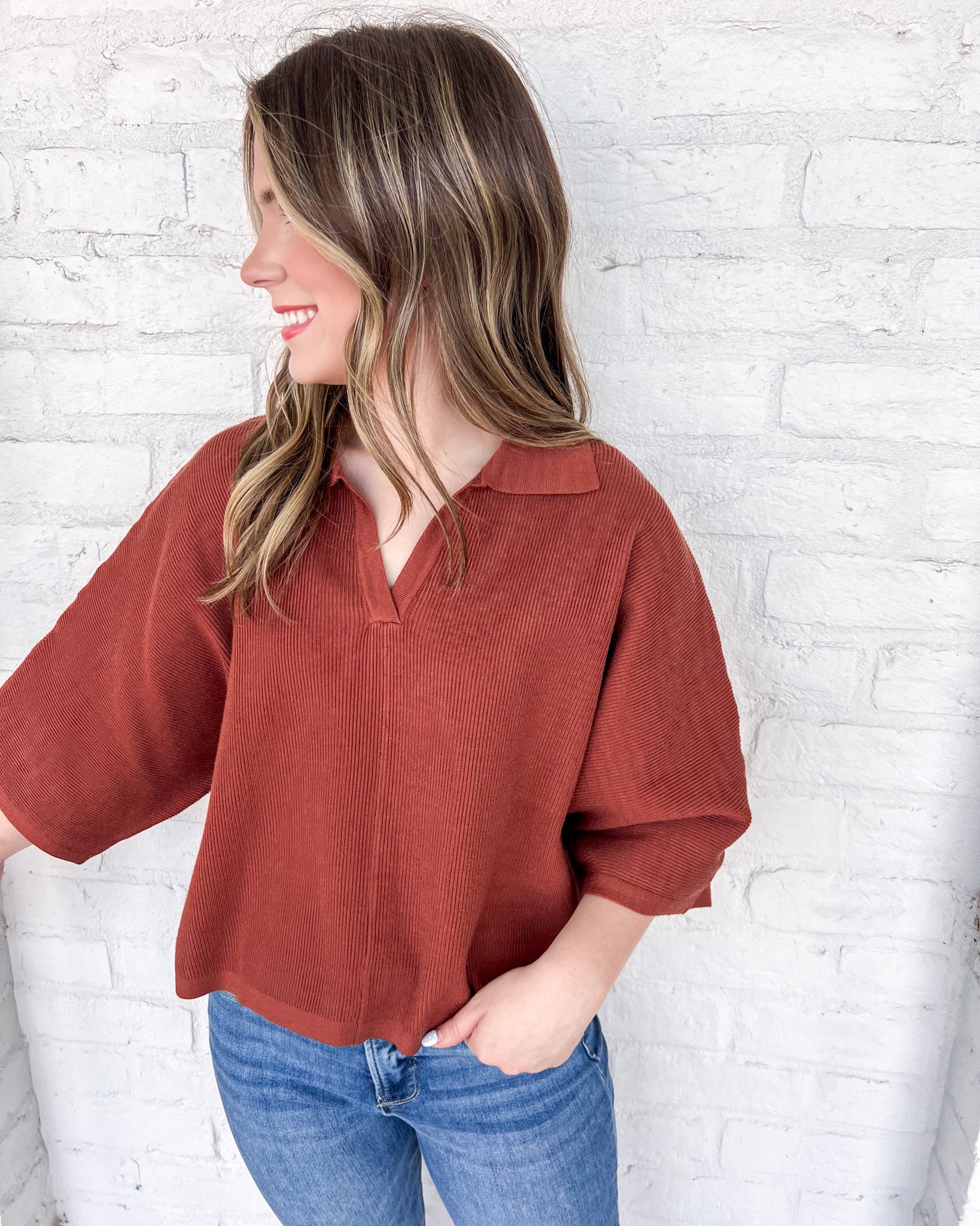 Effortless style meets everyday comfort in this Rust Textured Knit Split Neck Top. Designed with a relaxed silhouette, this versatile piece features a soft ribbed knit, drop shoulders, and a flattering split neckline that elevates a casual staple. The warm rust shade makes it perfect for fall layering and pairs seamlessly with denim, skirts, or trousers for an easy, put-together look.