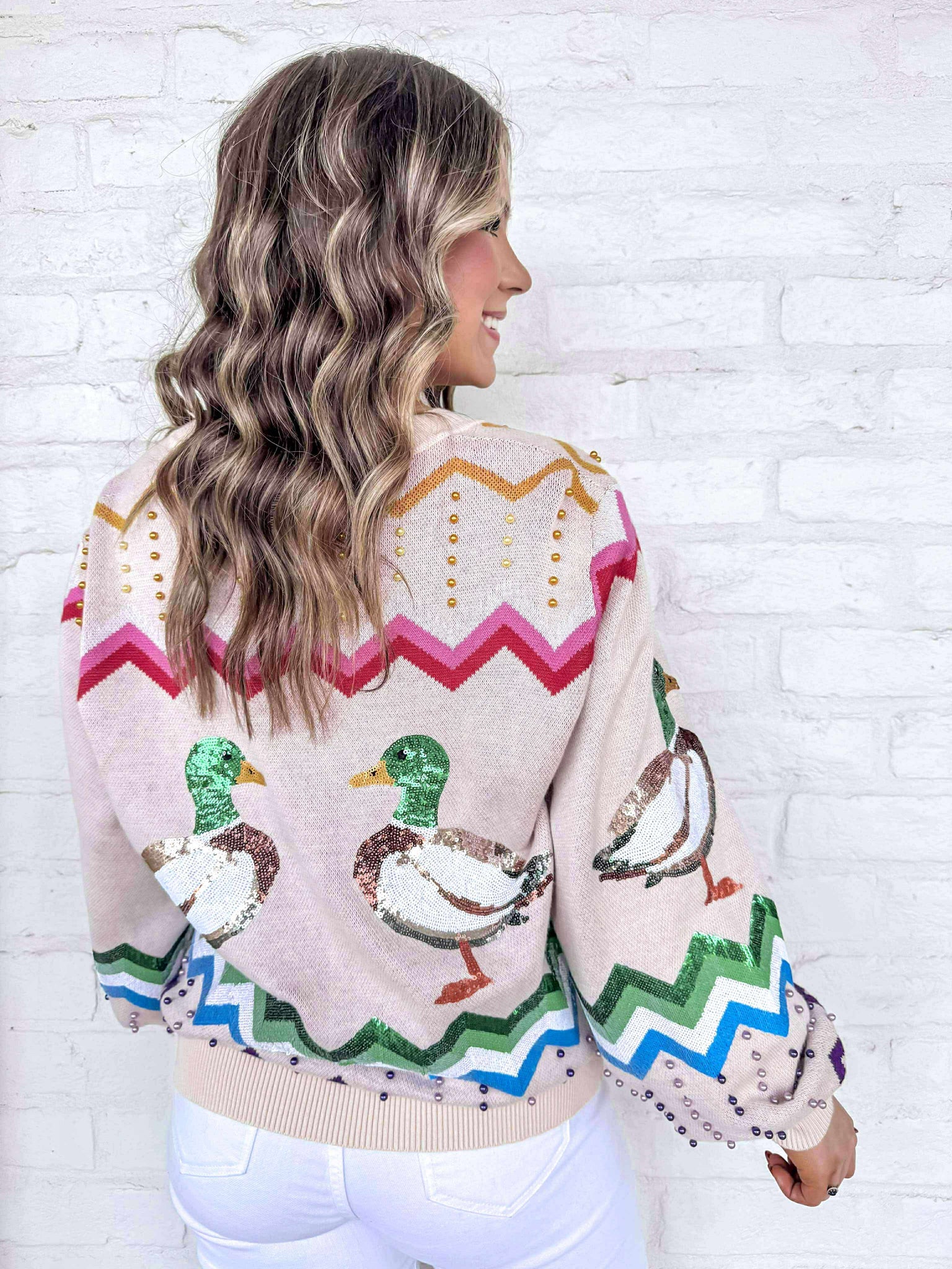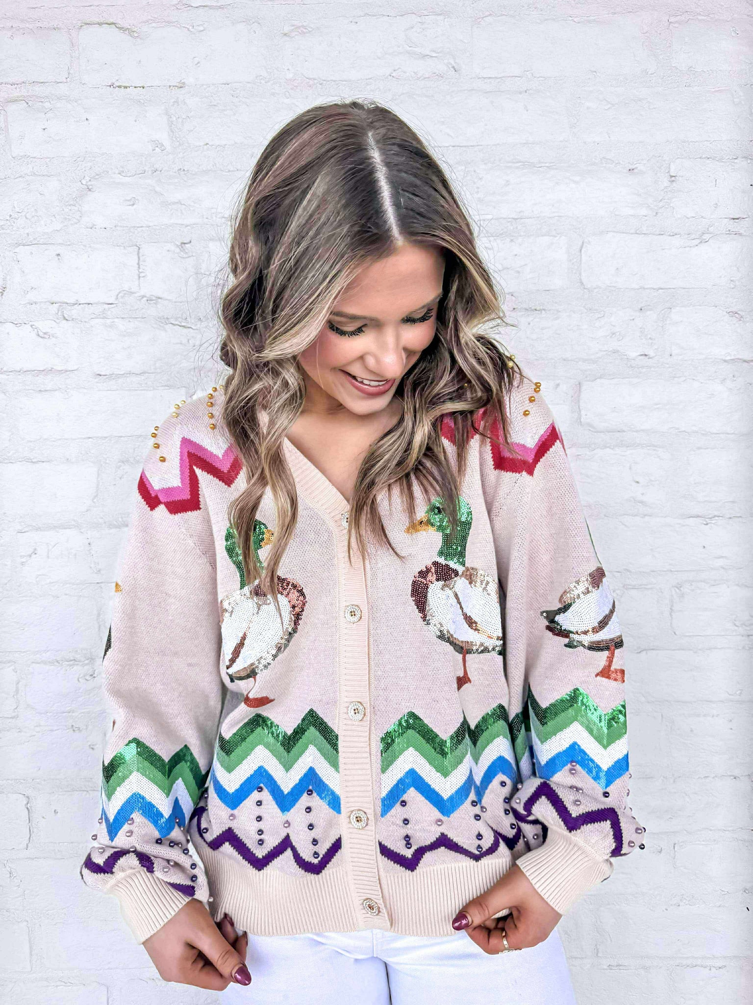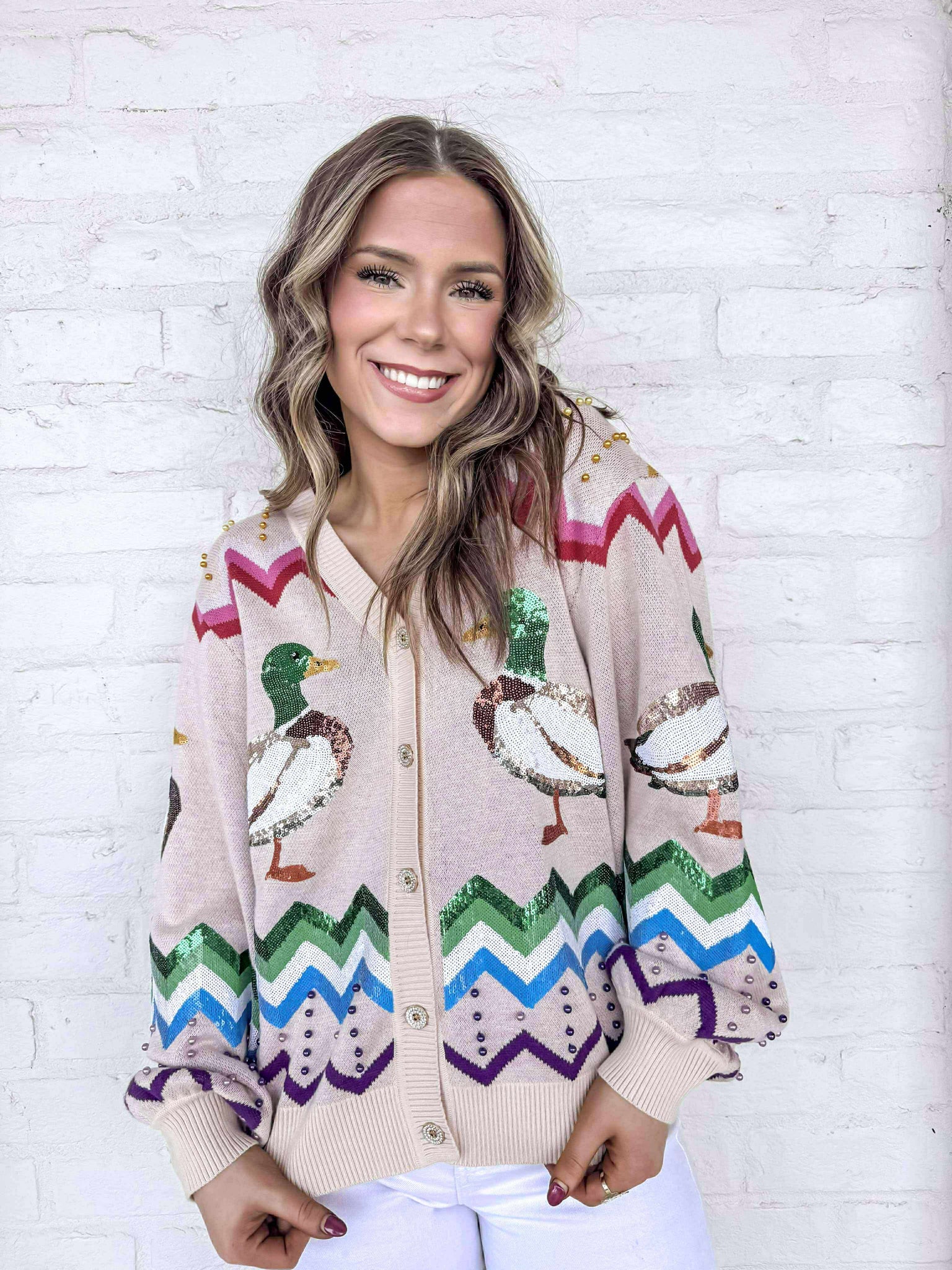 Get ready to shine with our Queen Of Sparkles Multi Zig Zag Duck Cardigan! Featuring a stunning beige color, this cardigan is perfect for adding a touch of elegance to any outfit. With its unique zig zag design, you'll be sure to turn heads and stand out in a crowd. Show off your style and sparkle like a queen!