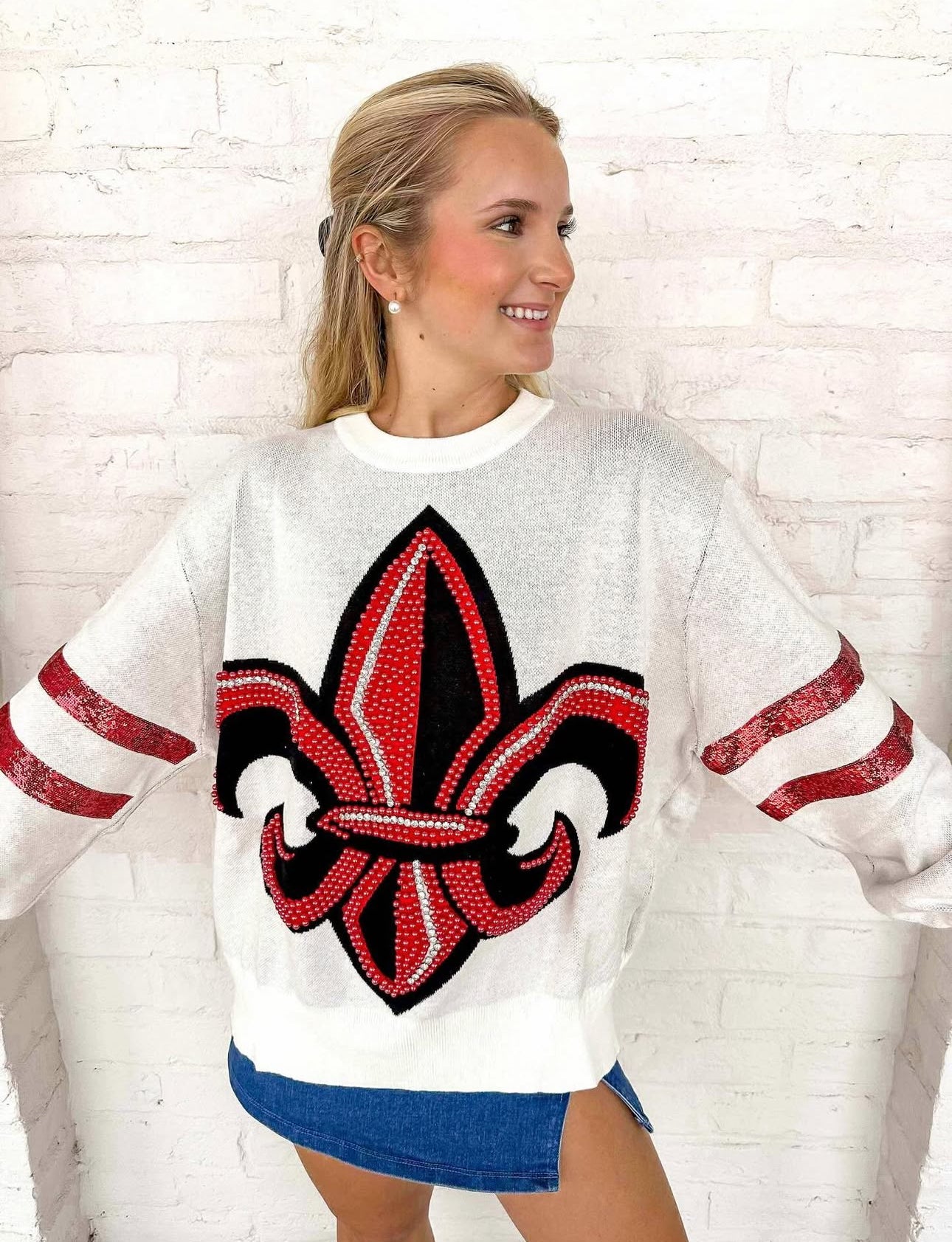 Indulge in luxury with our Queen Of Sparkles ULL Oversized Mascot Sweater! This stunning sweater features exquisite pearl details that add a touch of elegance to any look. Stay warm and stylish all season long with this must-have addition to your wardrobe. Treat yourself to the ultimate statement piece now!
