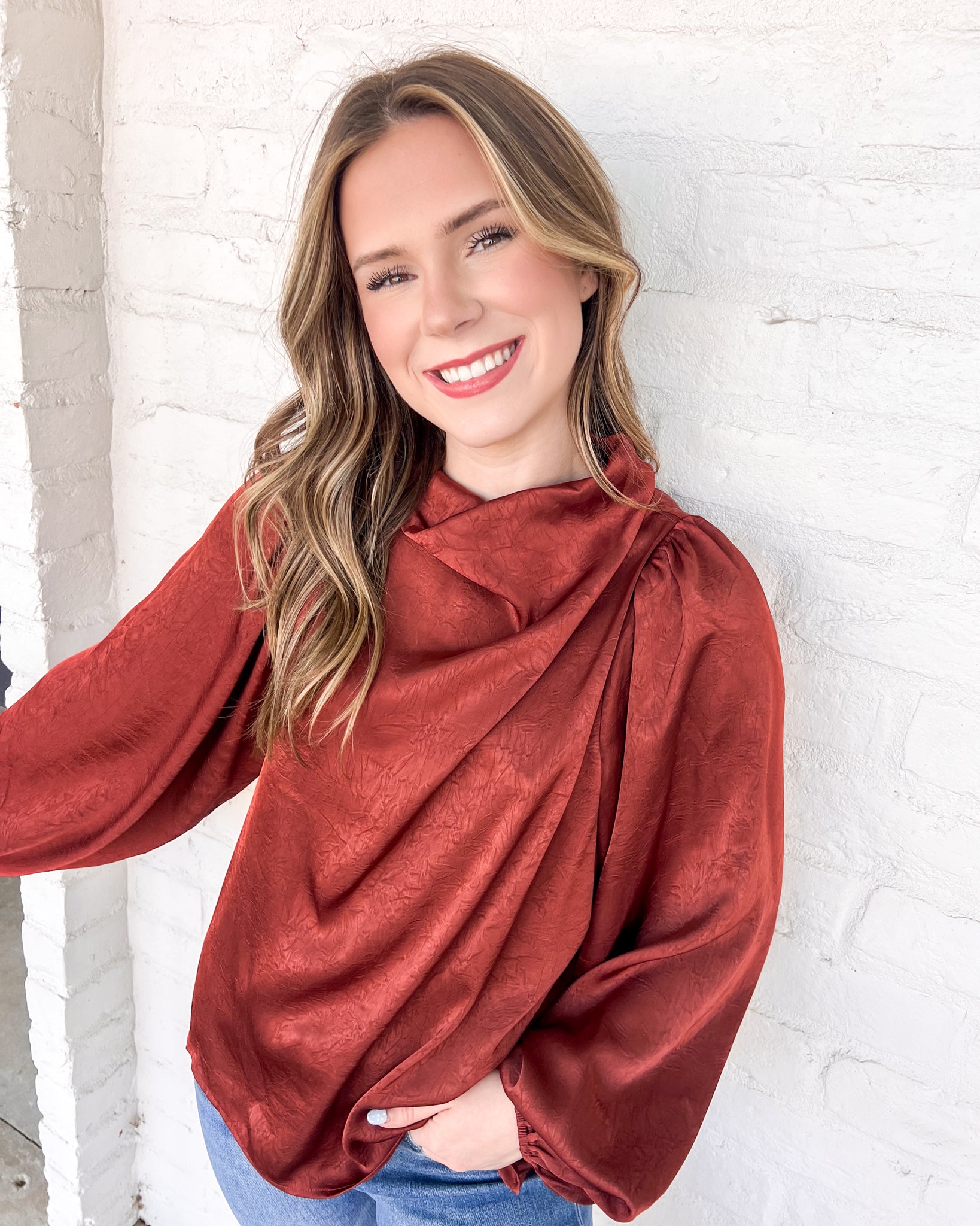 Elevate your style with the Rust Satin Draped Mock Neck Blouse. Crafted in a soft satin-like fabric with subtle texture, this blouse features a dramatic draped neckline and billowy long sleeves for a look that’s both polished and fashion-forward. The rich rust shade adds a seasonal pop, making it the perfect statement piece for fall.