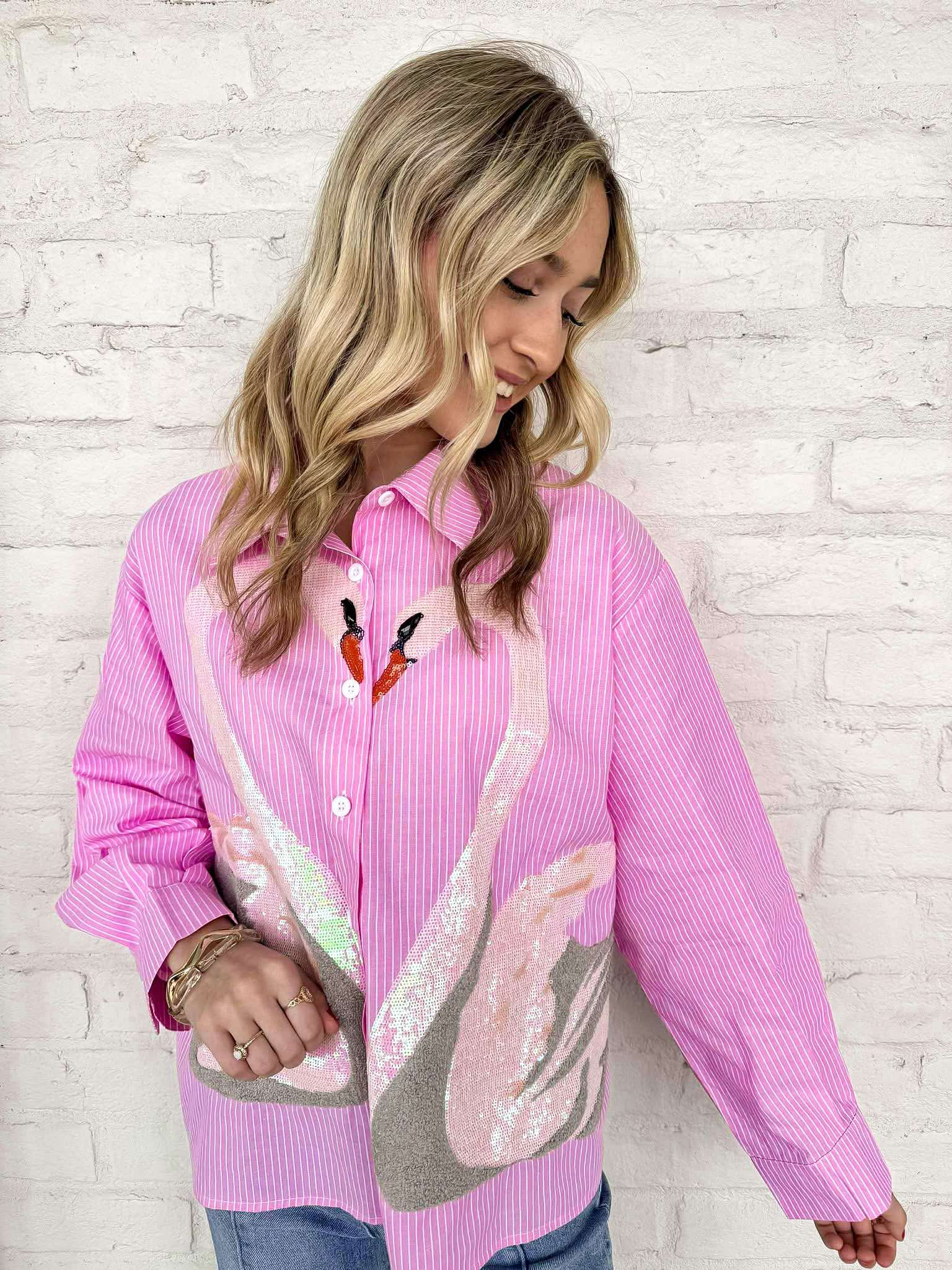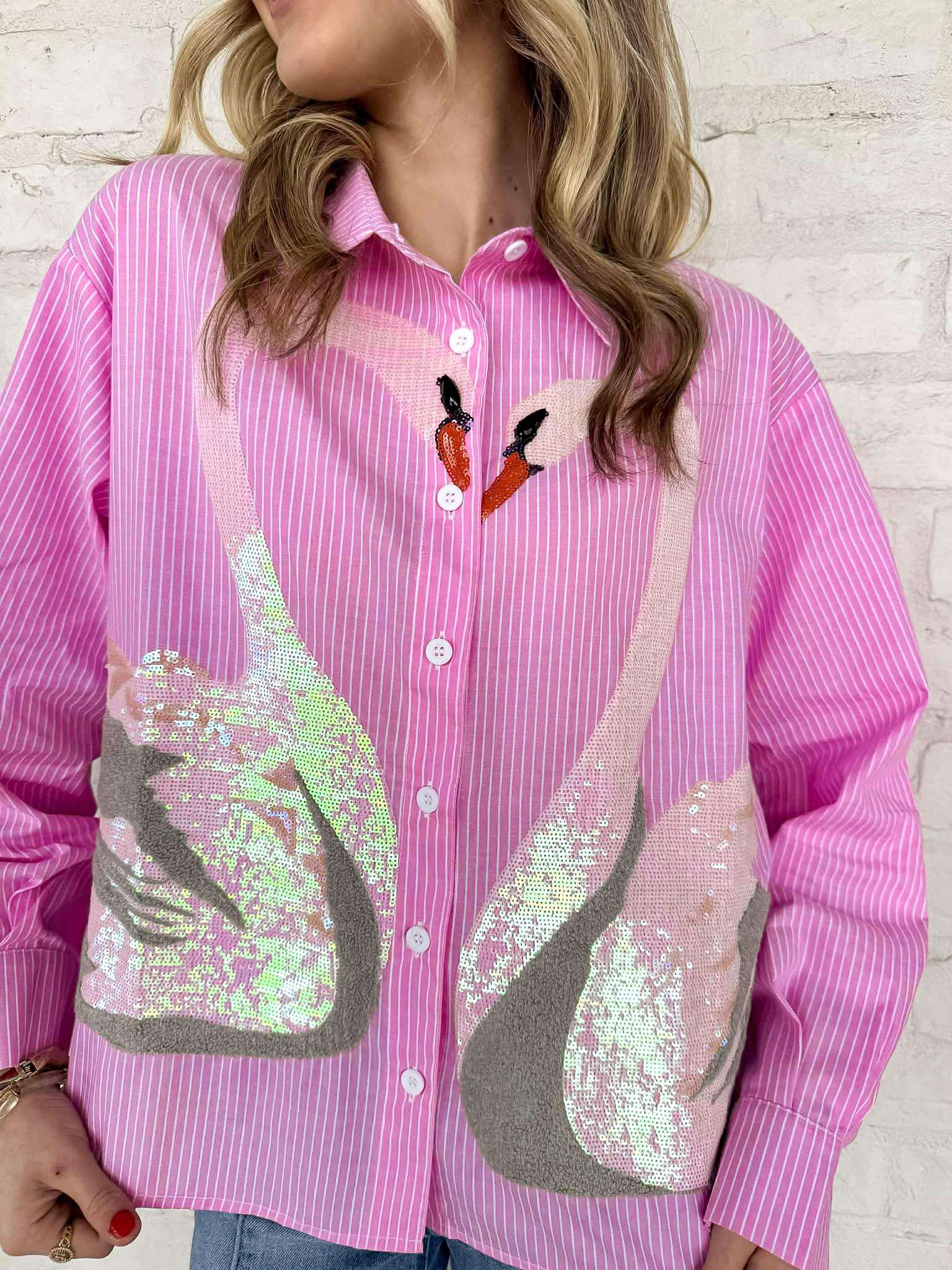 Queen Of Sparkles Pink Striped Sequin Swan Button Up Long Sleeve Top