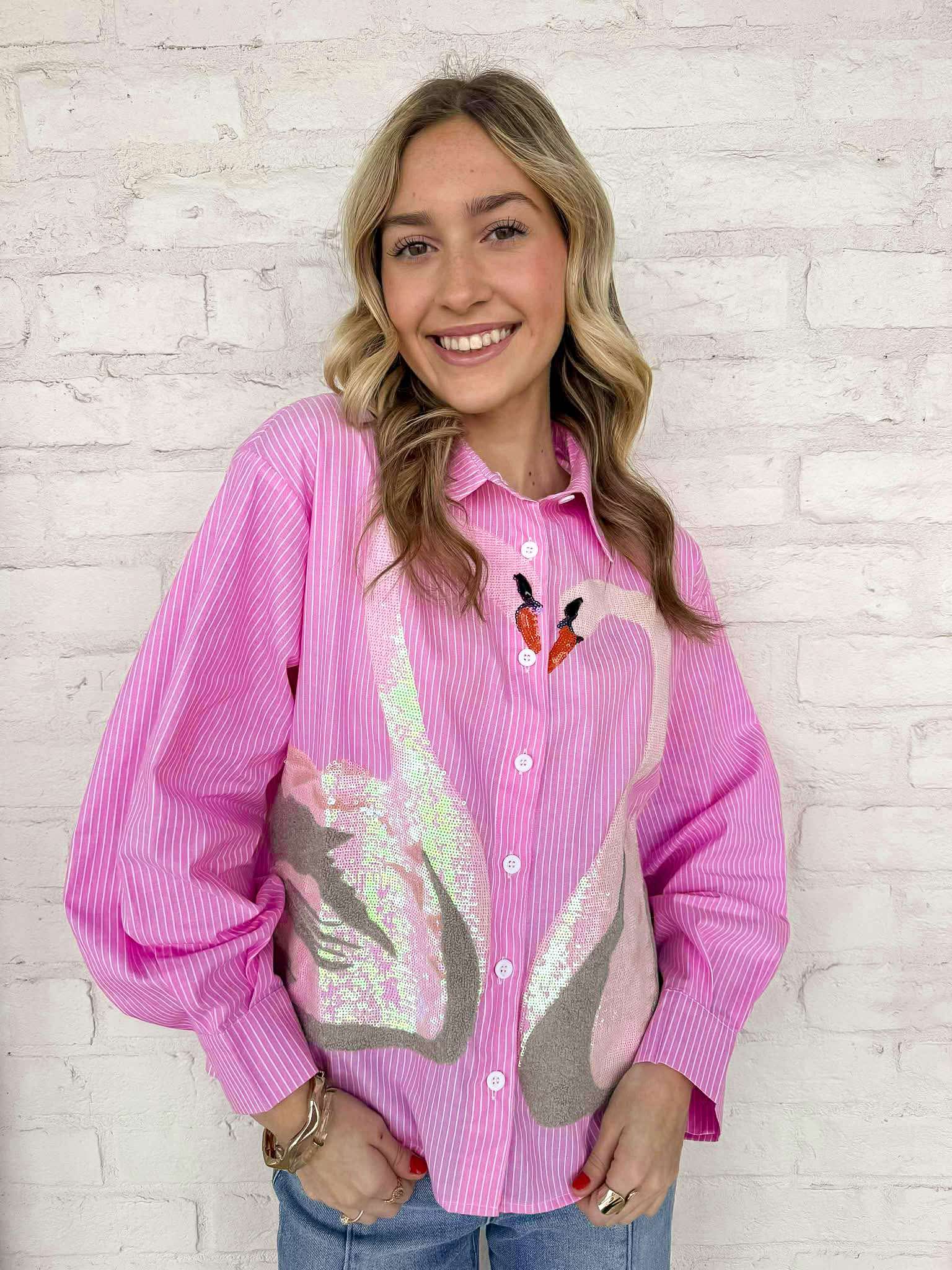 Sparkle and shine this Valentine's Day with our Queen Of Sparkles top! Featuring pink stripes and a sequin swan, this button-up long sleeve top is perfect for a romantic date night or a girls' night out. Spread the love and turn heads with this stunning and unique piece.