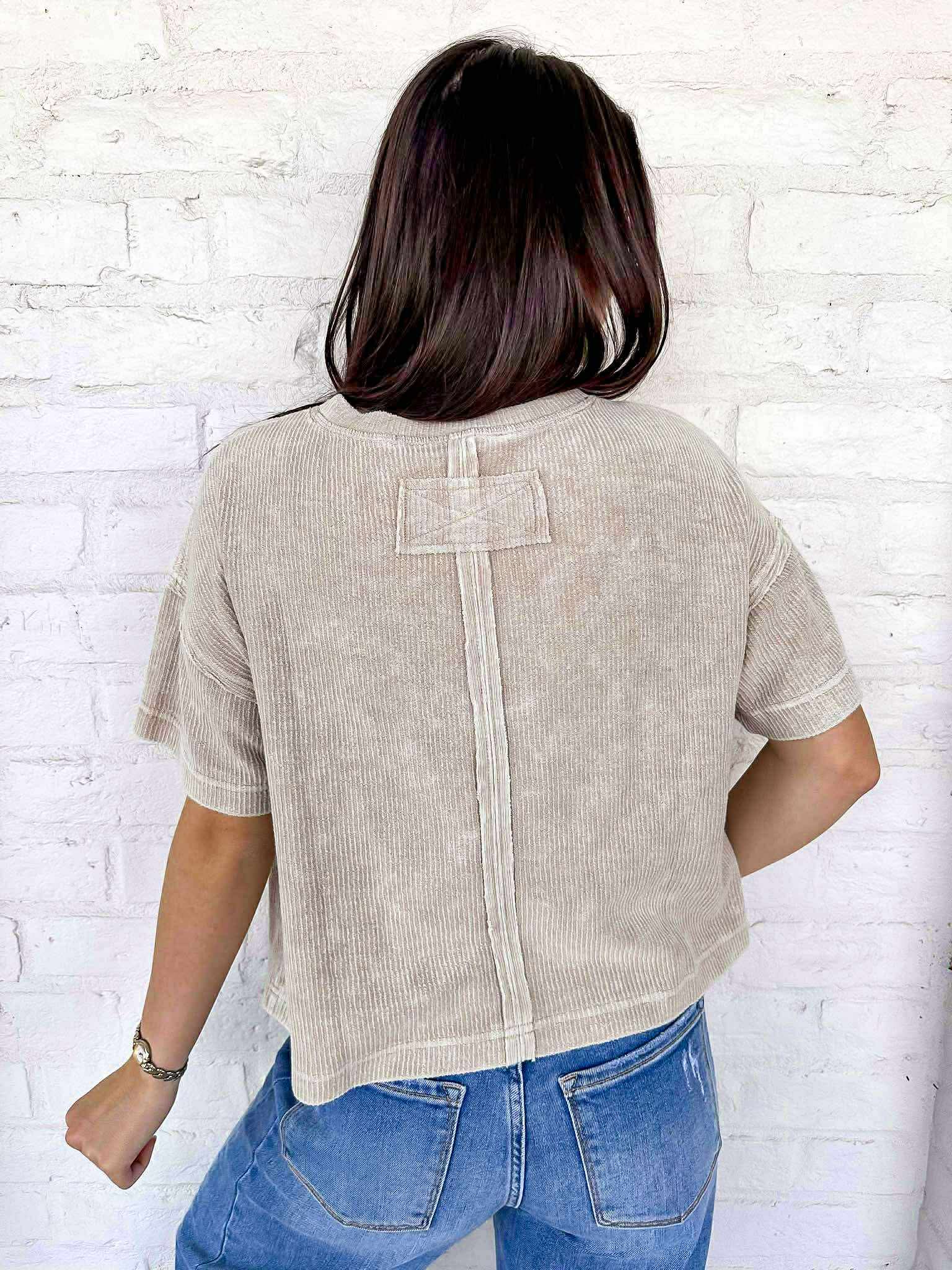 "Experience ultimate comfort and style with our "Wanting To Stay Top" washed rib, short sleeve tee. The soft fabric and convenient pocket make this a must-have for any wardrobe. Stay fashionably on top with our top-quality shirt!"