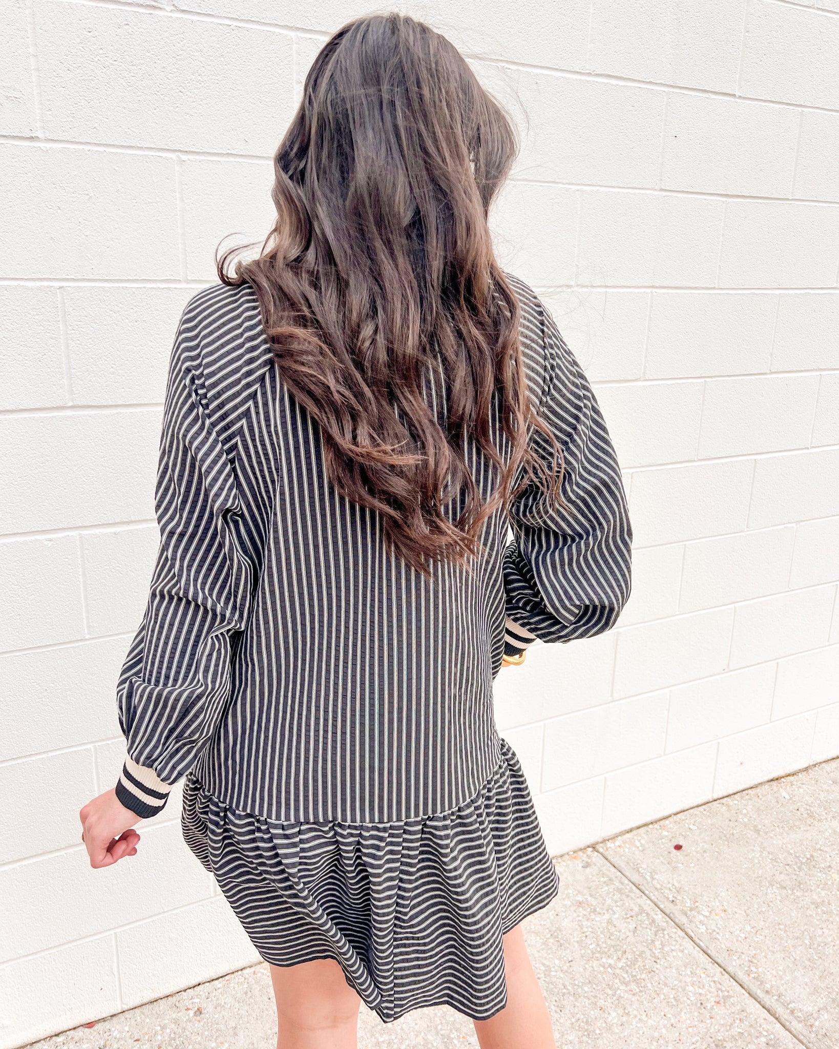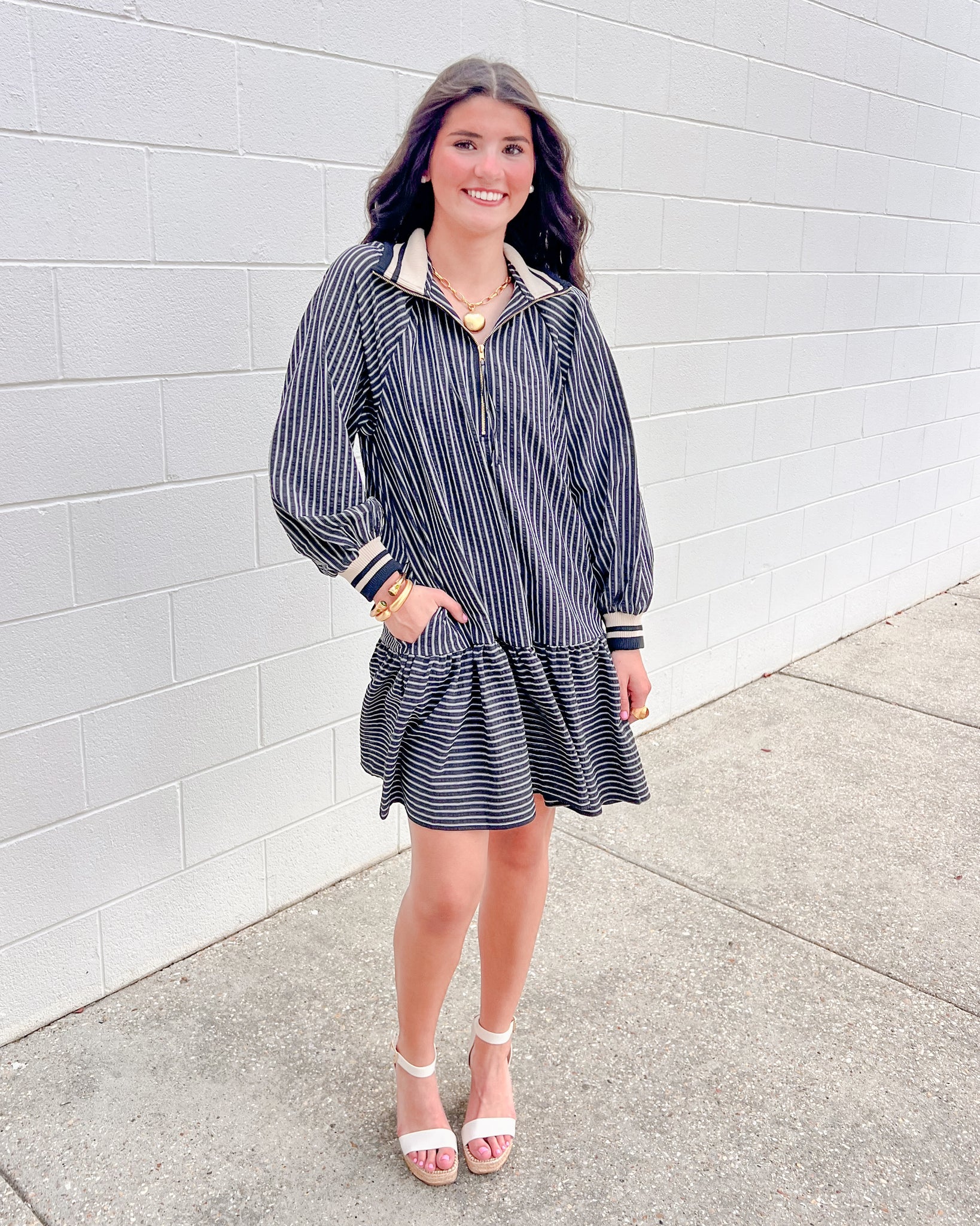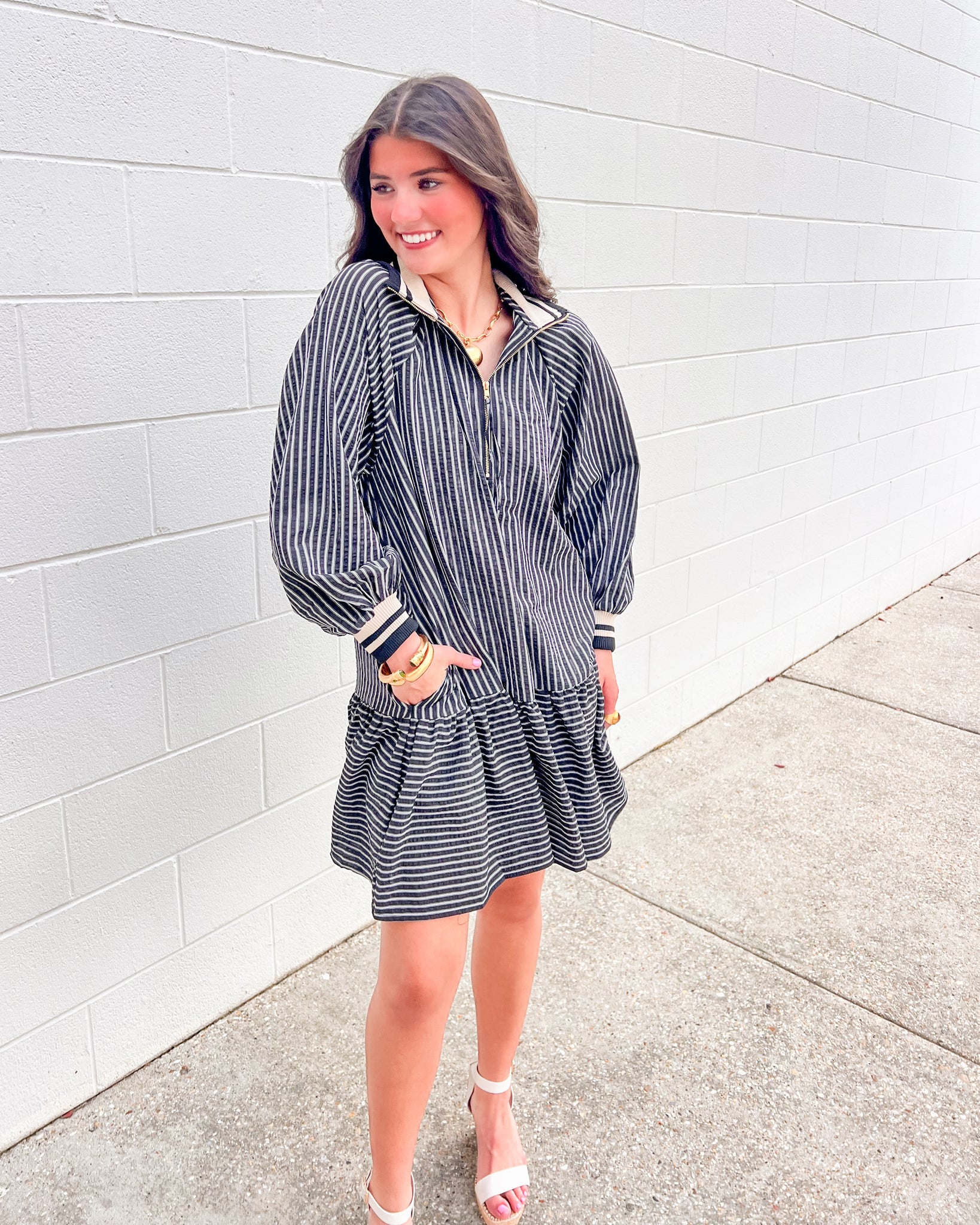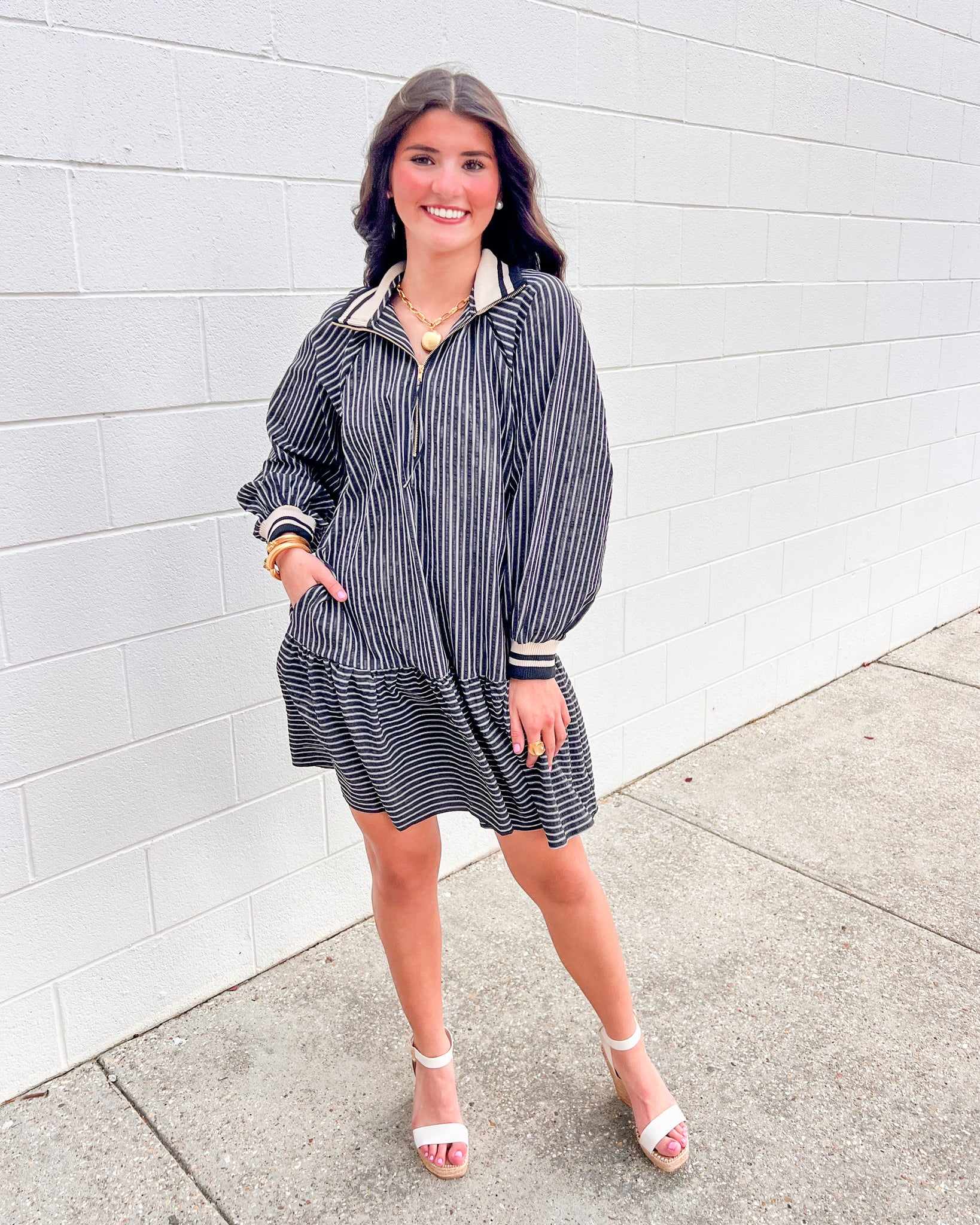 Effortless and polished, this black striped quarter-zip mini blends sporty and sweet with a collared neckline, balloon sleeves, and a flouncy drop-waist hem. The soft knit drapes easily for errands, brunch, or casual Fridays—just add sneakers or wedges and go.