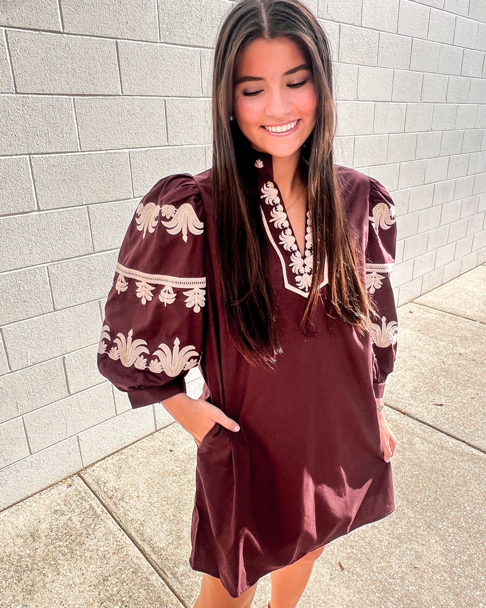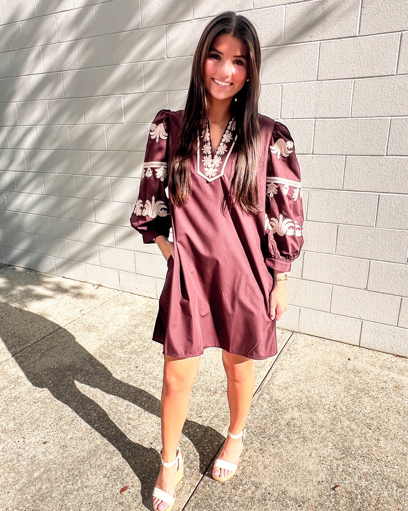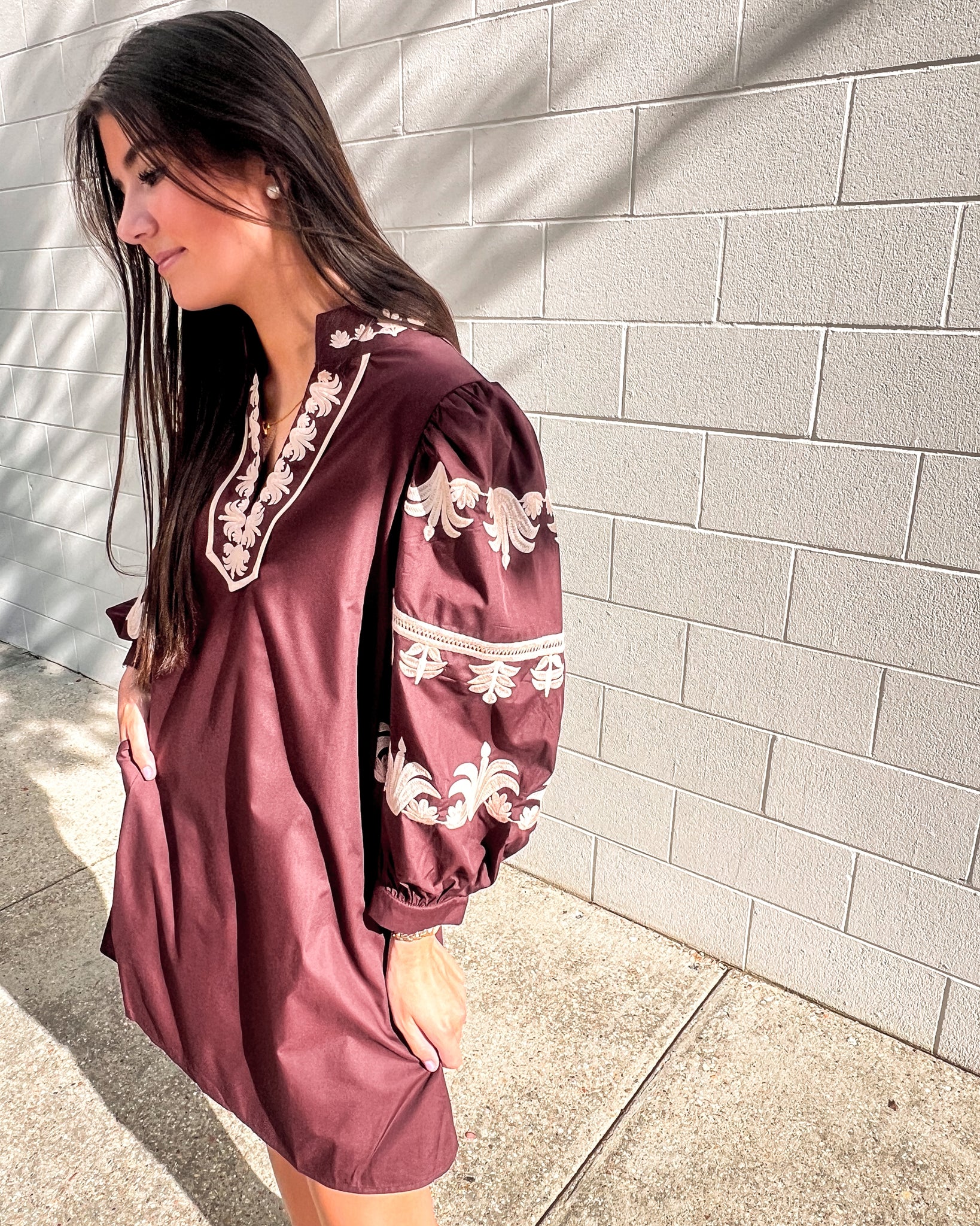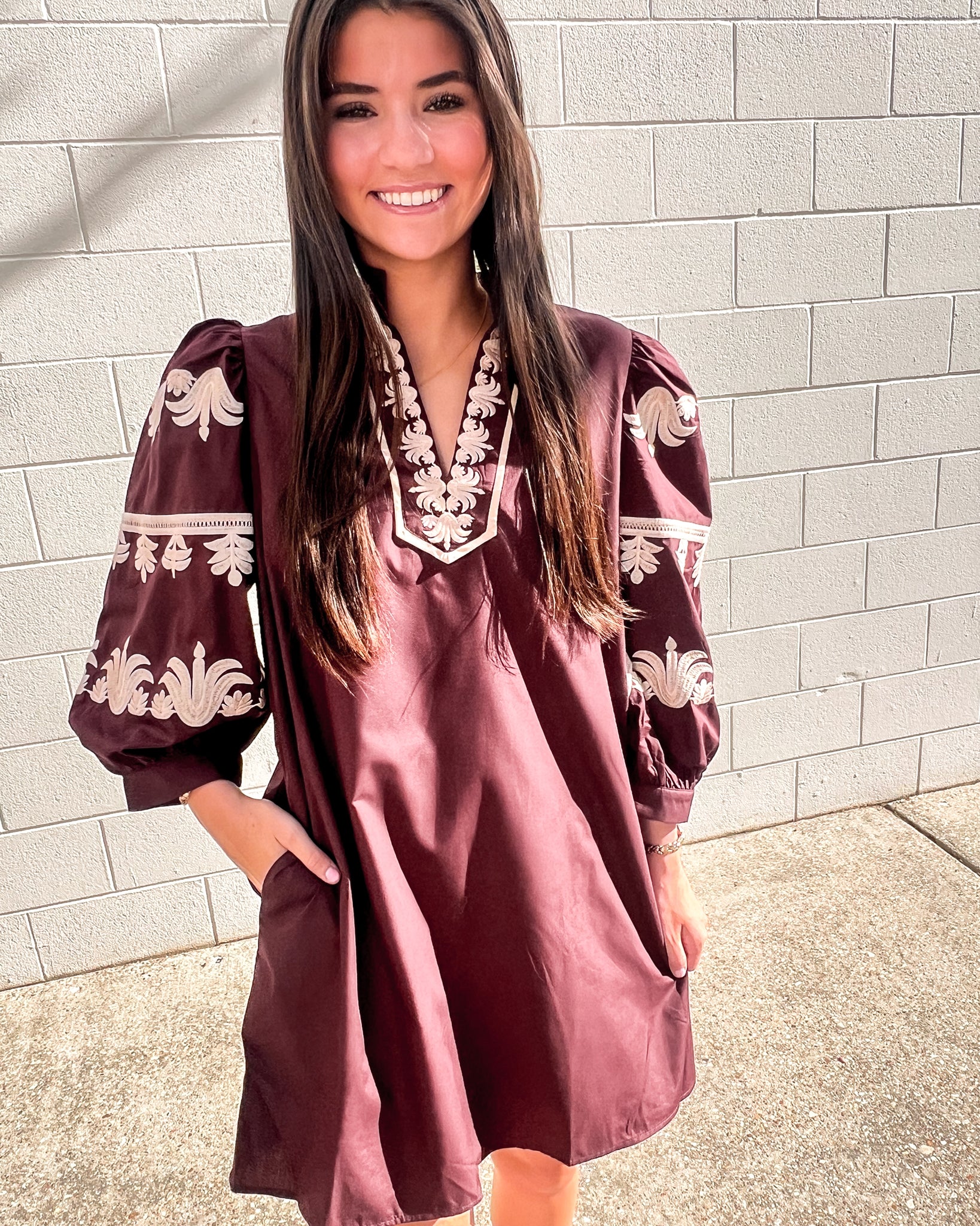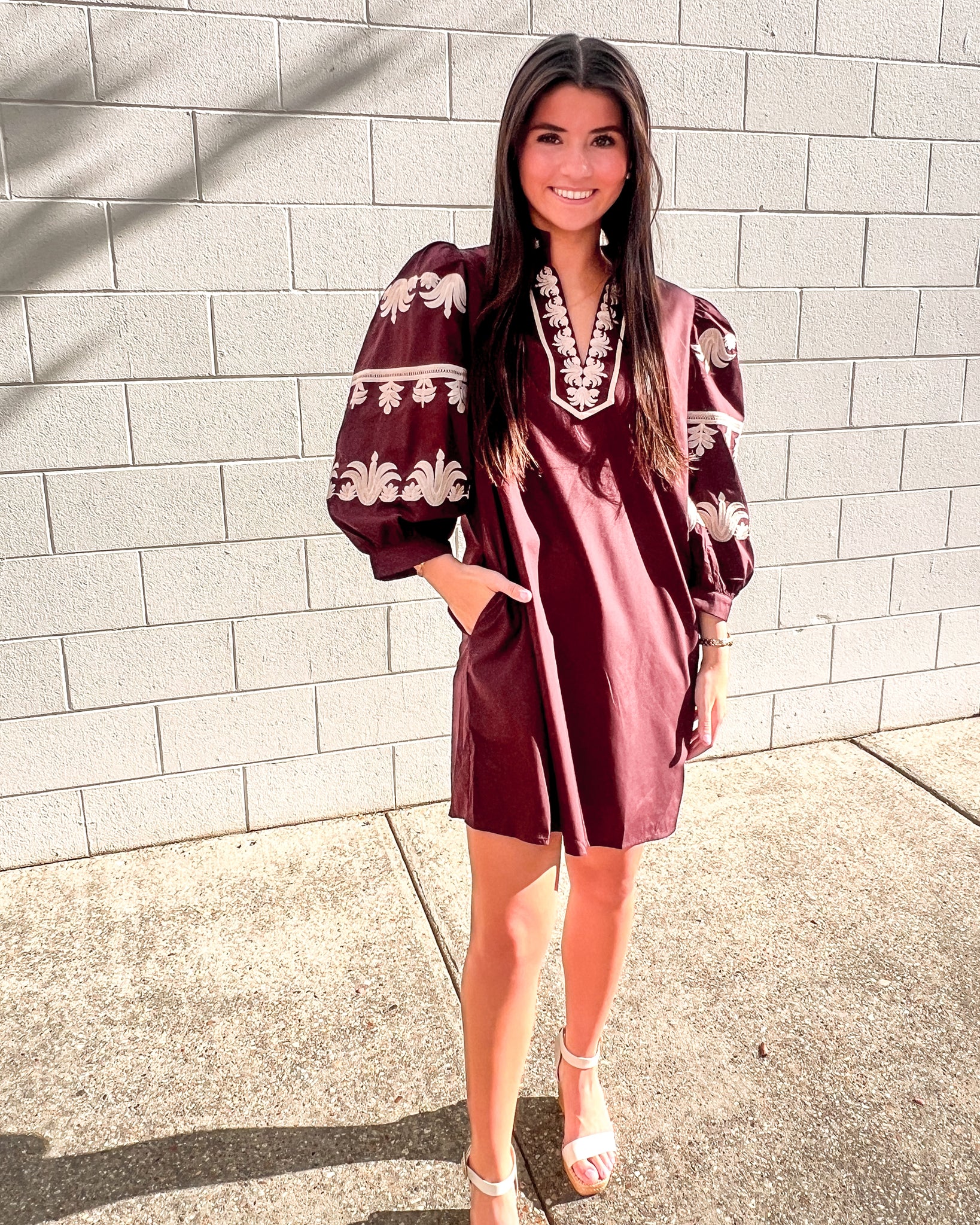 Make a statement in the Burgundy Embroidered Puff Sleeve Mini Dress. This chic dress features intricate cream embroidery along the neckline and sleeves, adding elevated detail to its rich burgundy base. Designed with dramatic puff sleeves, a split neckline, and a relaxed fit with side pockets, it’s both stylish and easy to wear.