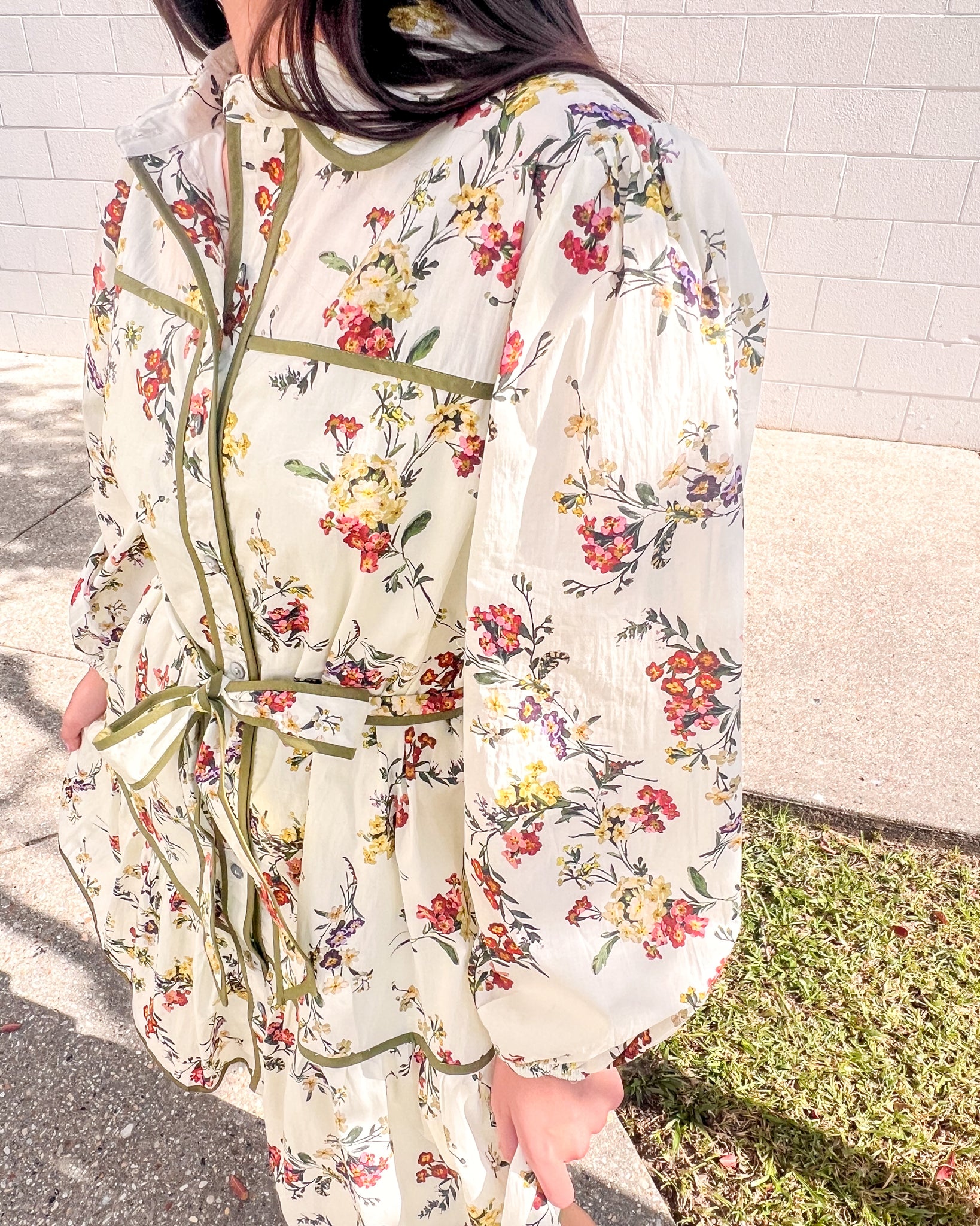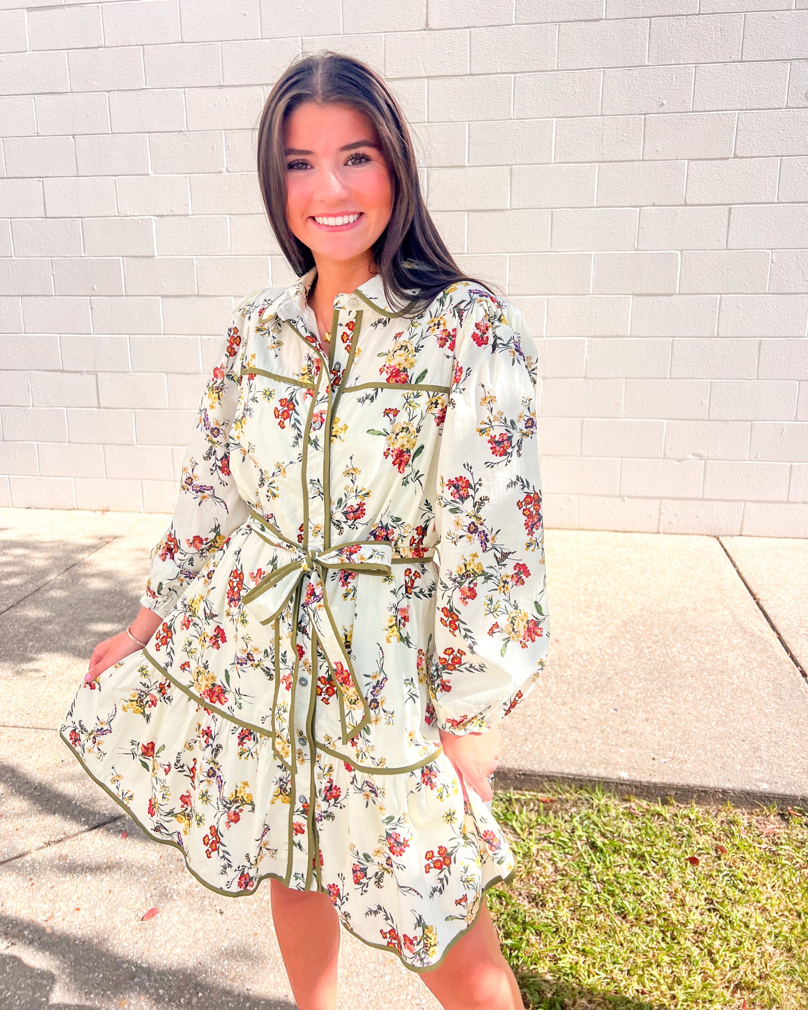 Romantic and playful, the Floral Print Tiered Belted Mini Dress is a fresh statement piece for any occasion. Featuring a button-front design, tiered skirt, and long puff sleeves, this dress balances feminine charm with modern structure. The belted waist cinches for a flattering silhouette, while the olive green trim adds contrast and polish to the floral print.