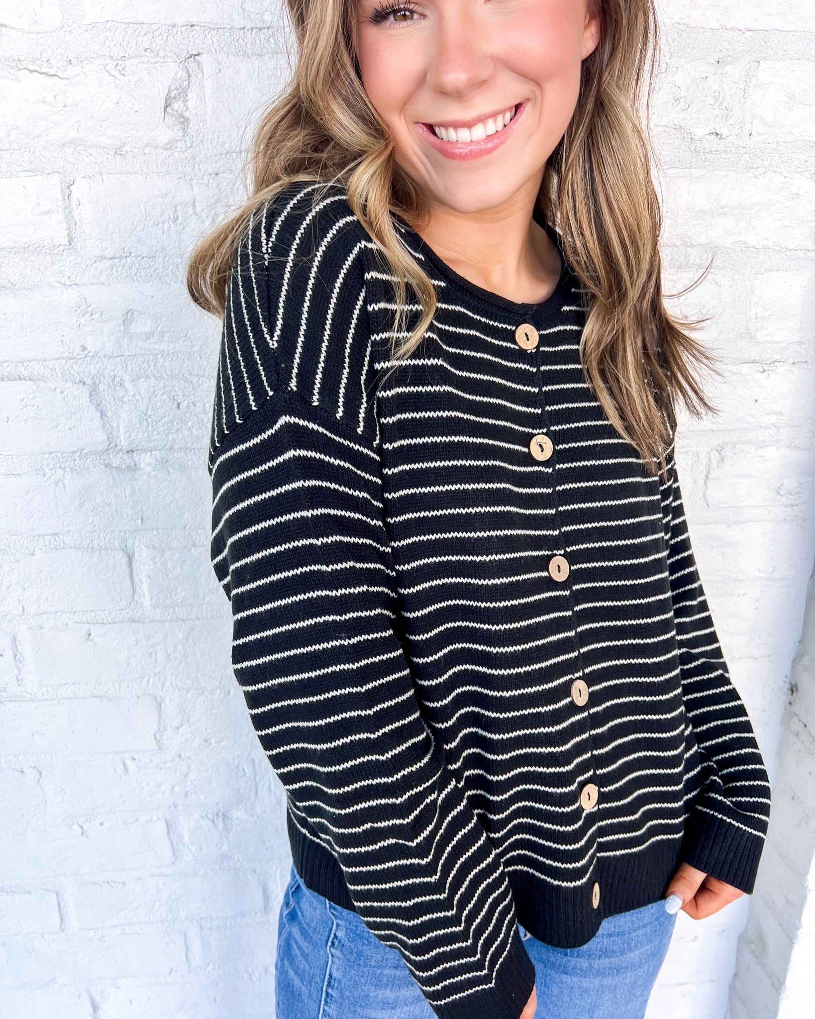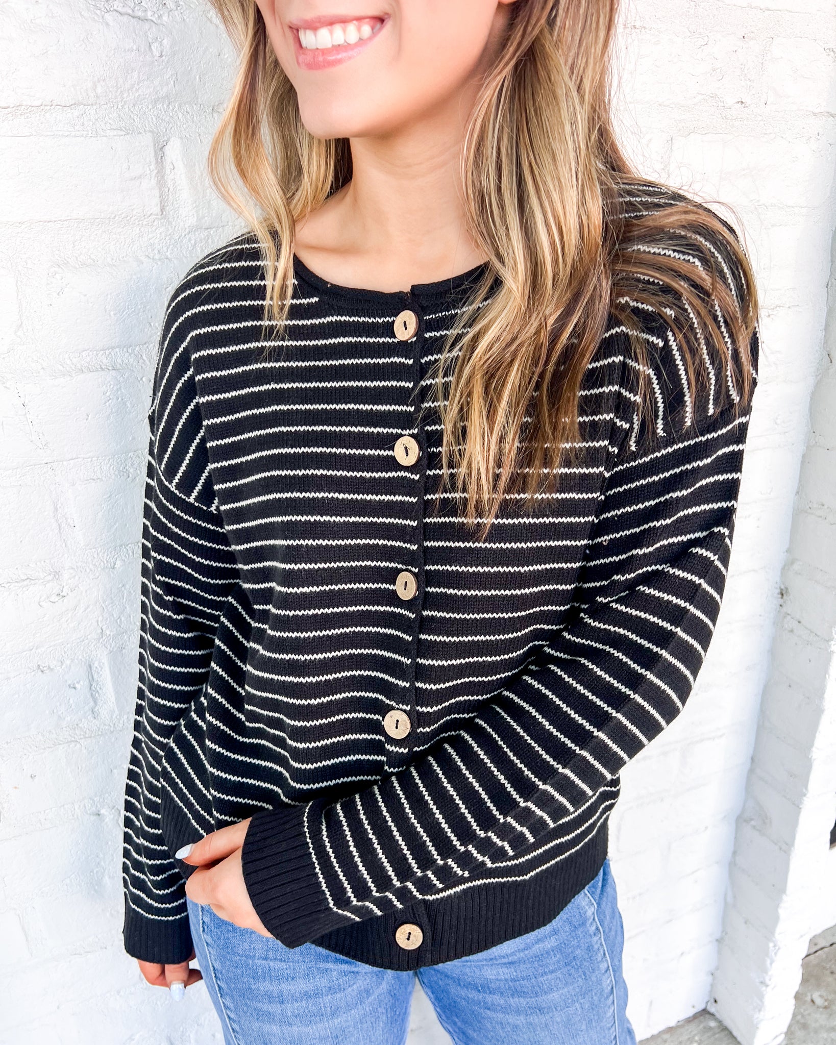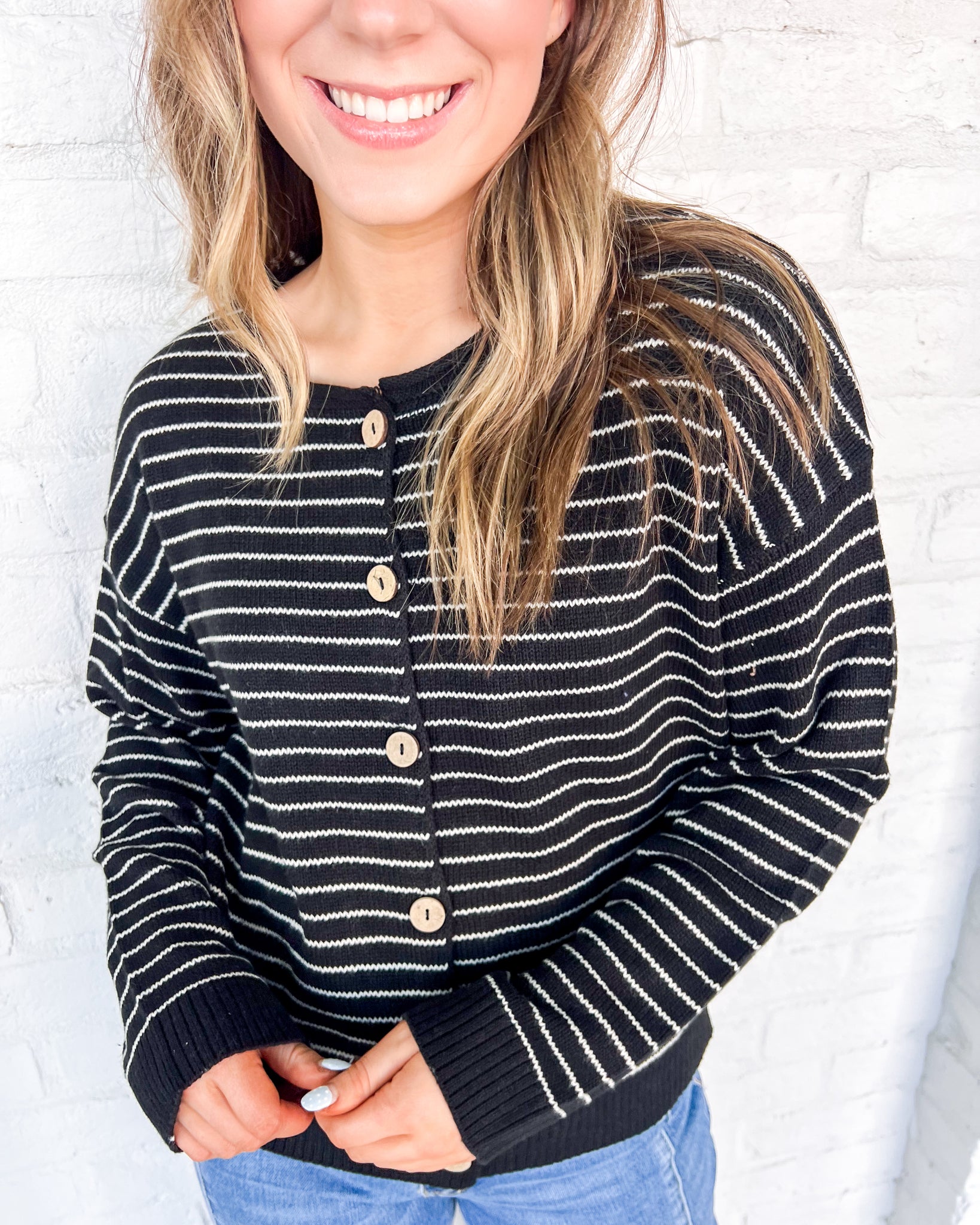Unlock your confidence with this must-have Stripe Button Down Raw Edge Knit Cardigan! Perfect for daring fashionistas, this bold cardigan is a statement piece that exudes adventure and style. Embrace your bold side and conquer any challenge in this key piece.
