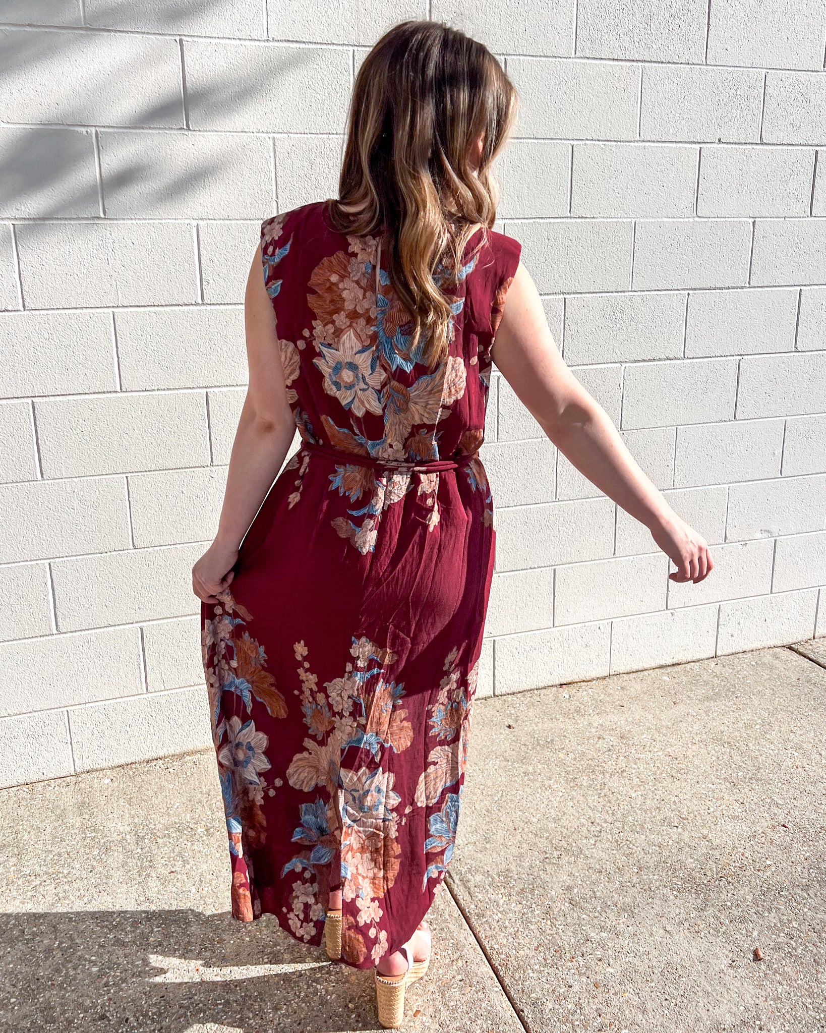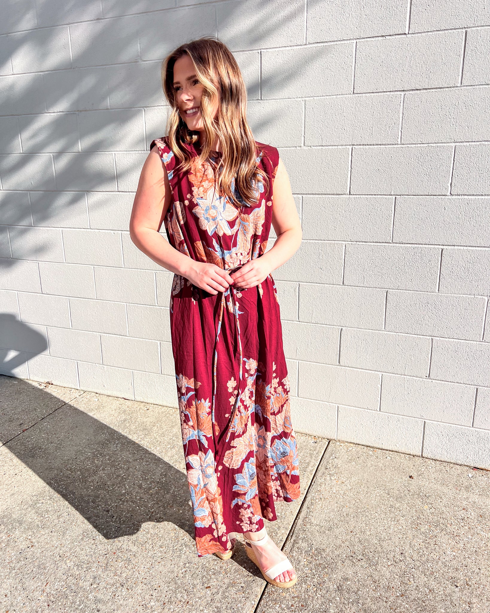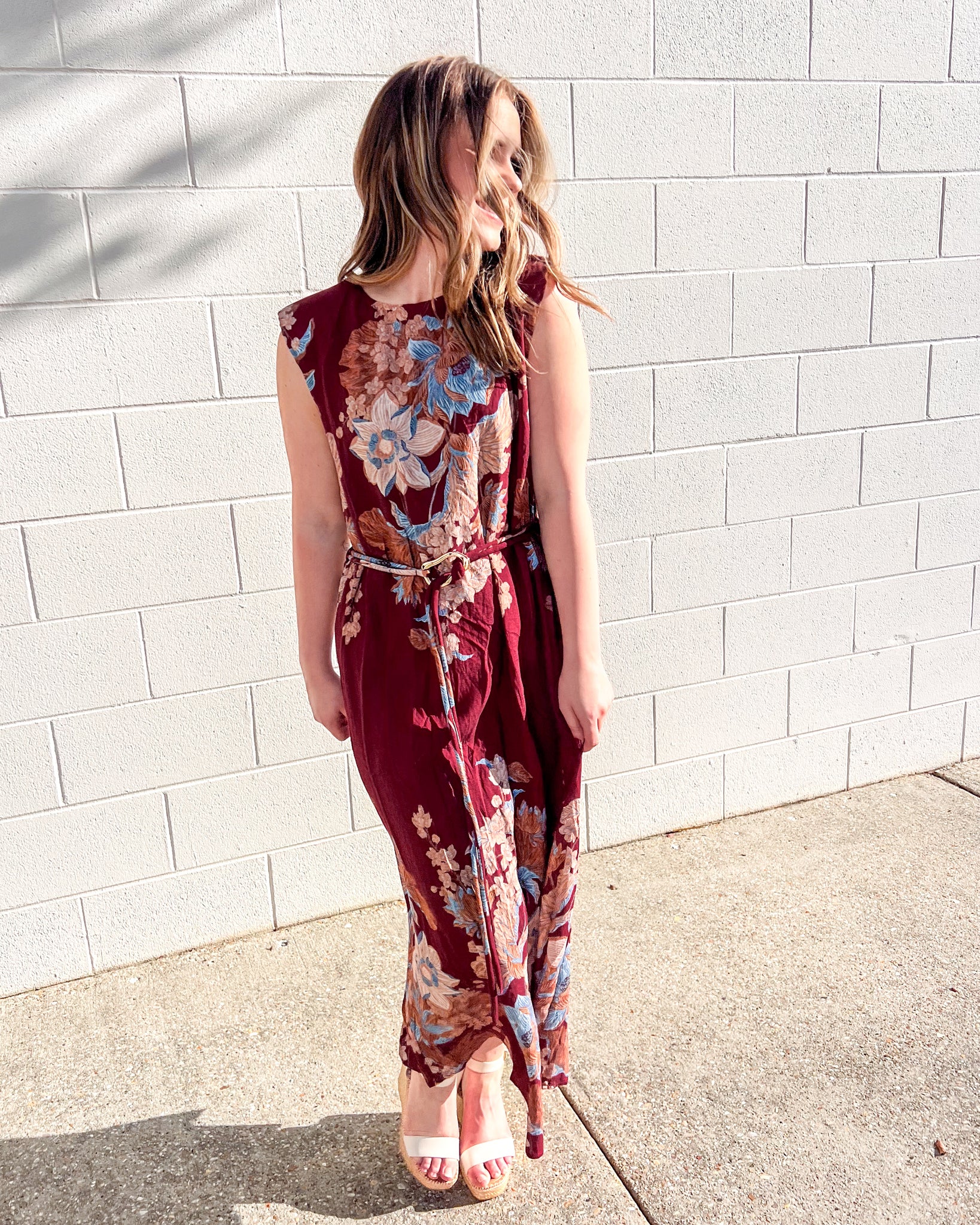 Make an entrance in the Burgundy Floral Maxi Dress, a flowy silhouette that’s equal parts romantic and chic. Featuring an allover floral print in shades of blue, blush, and tan, this sleeveless maxi dress is designed with a belted waist for a flattering fit and effortless movement. The lightweight fabric and rich autumn-inspired tones make it a versatile piece for day or night.